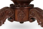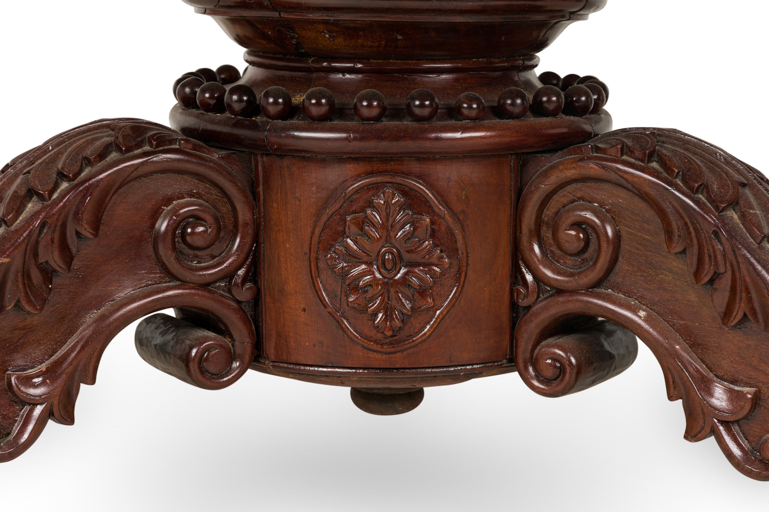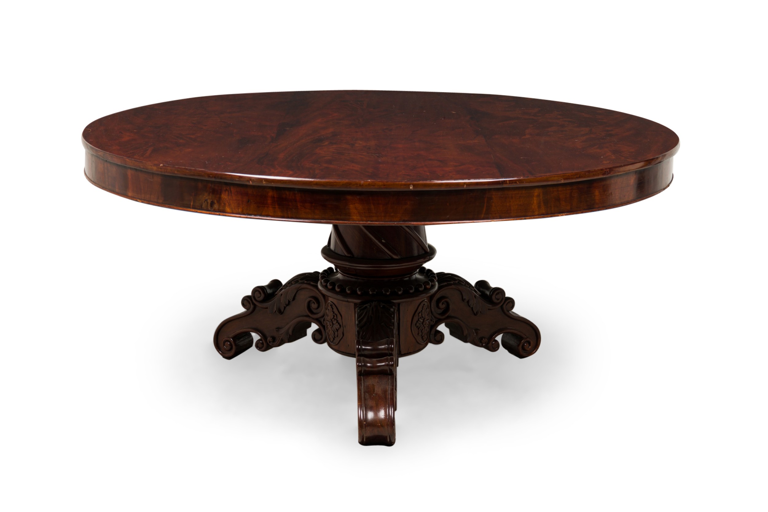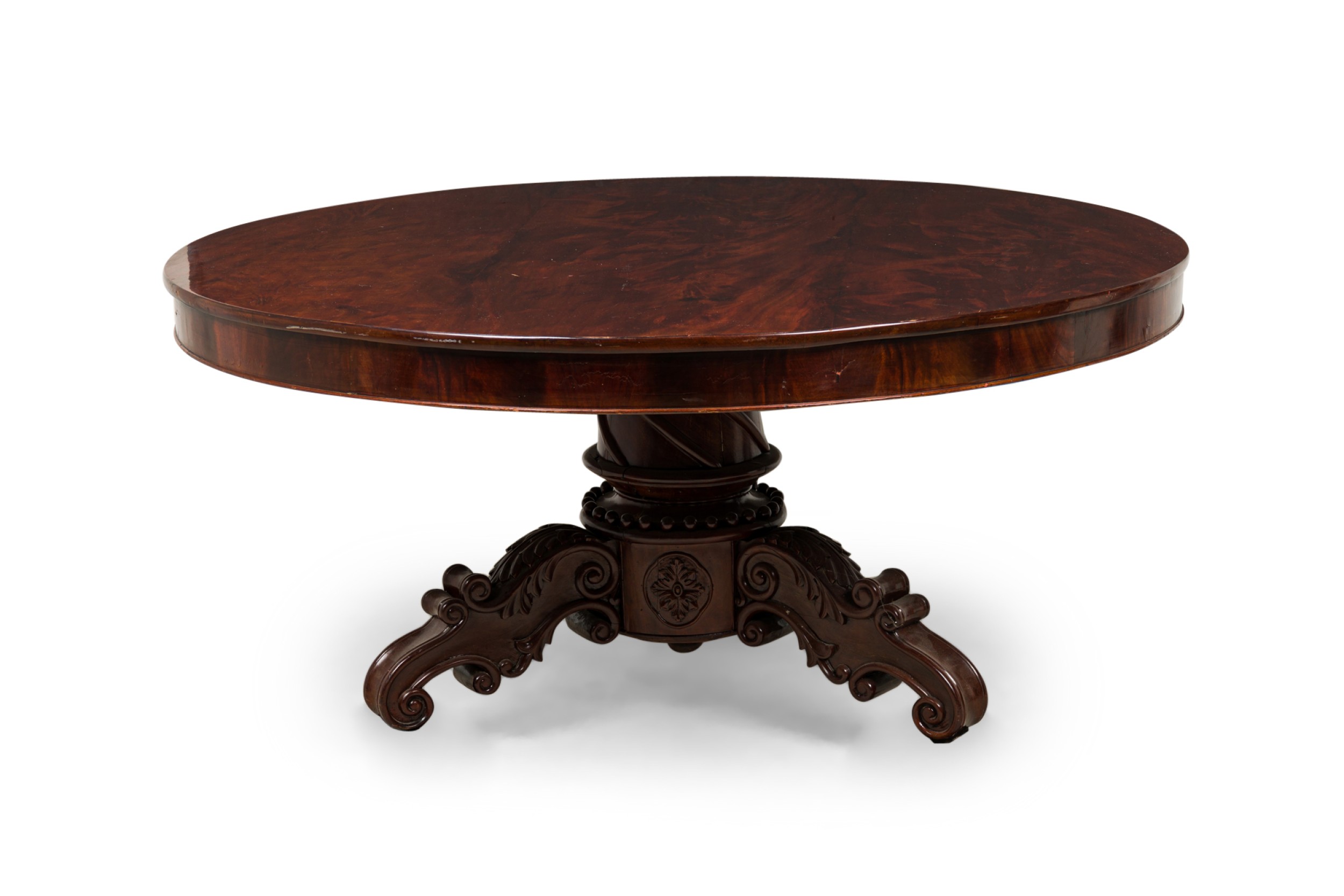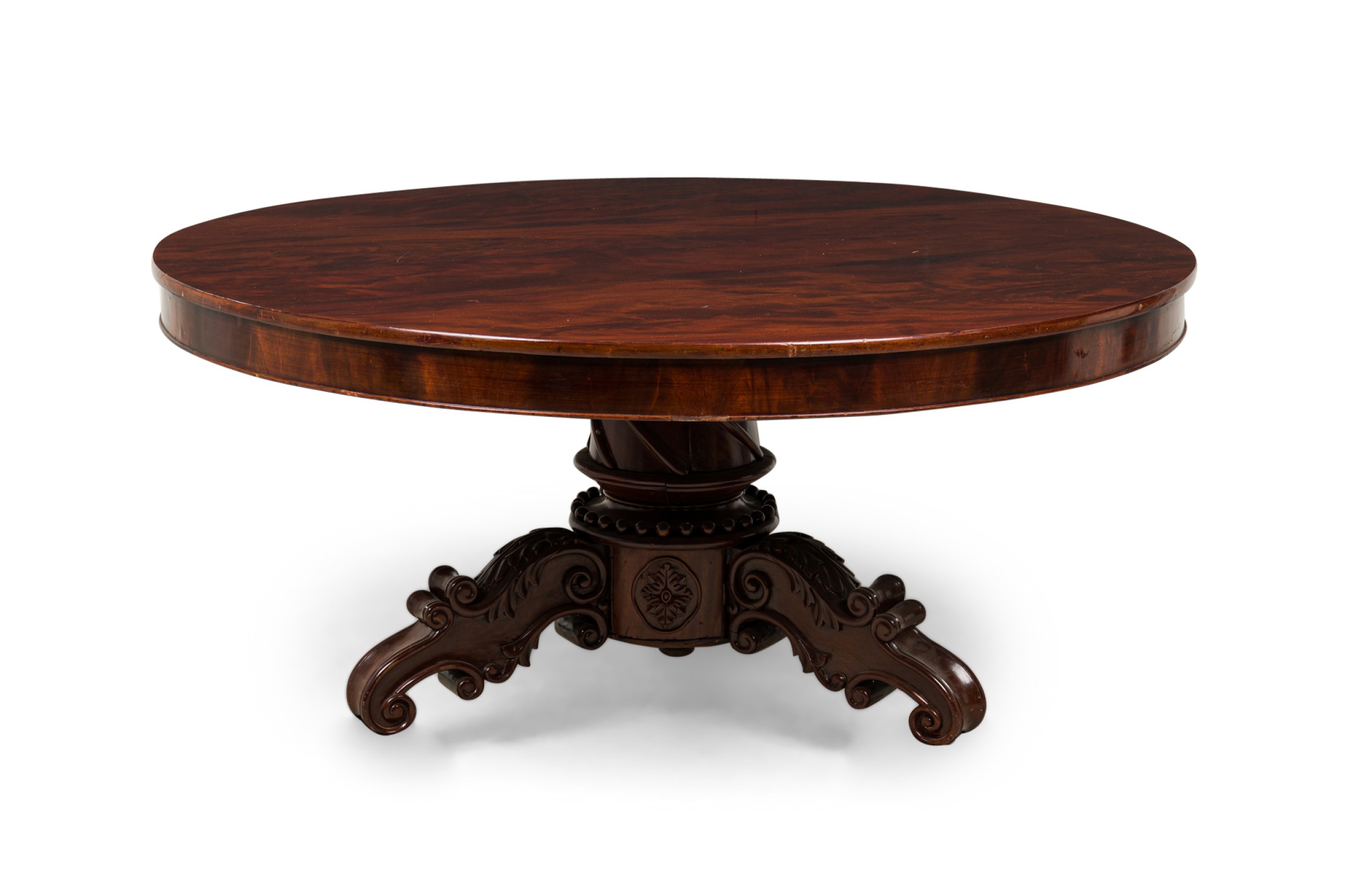 English William IV (19th Century) mahogany veneer dining / center table with a circular top resting on a turned pedestal base with three scroll carved legs.