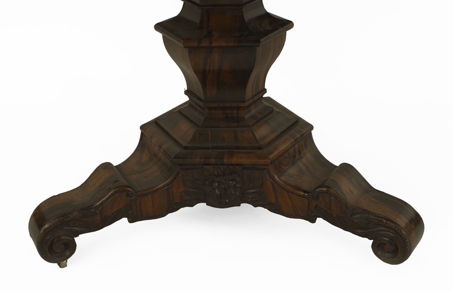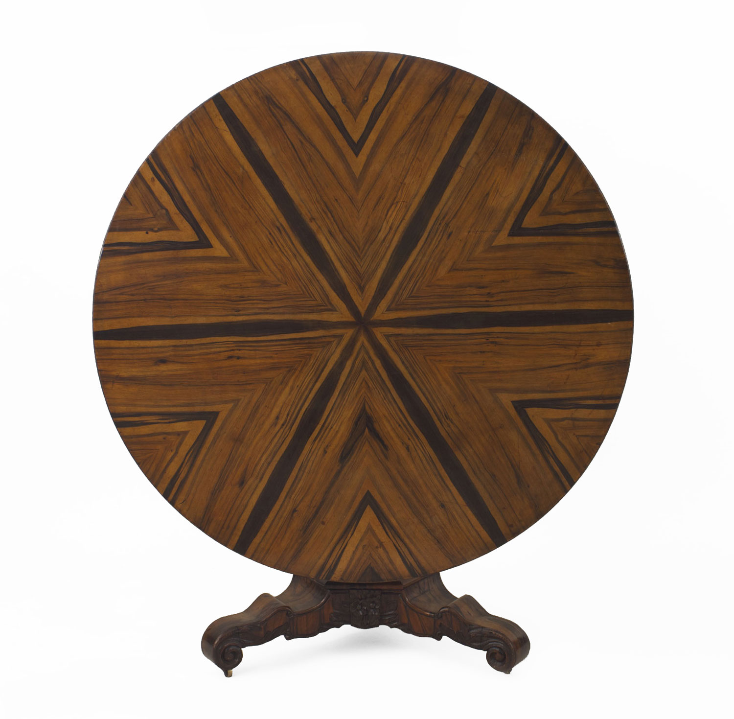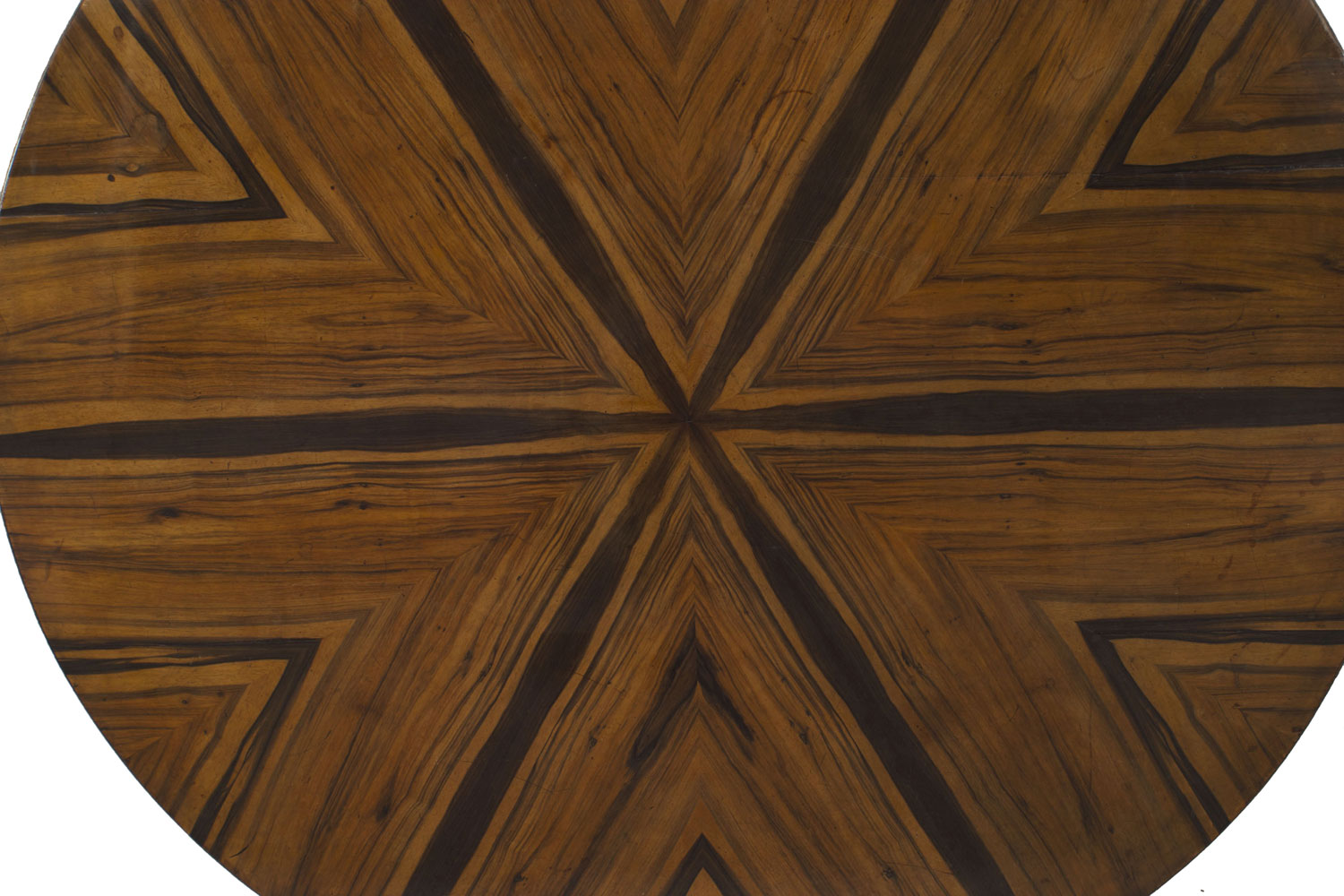 English William IV (possibly Anglo-Indian, circa 1835) zebra wood center table with a book matched & radially veneered top over shaped 6 sided pedestal and triangular platform base.