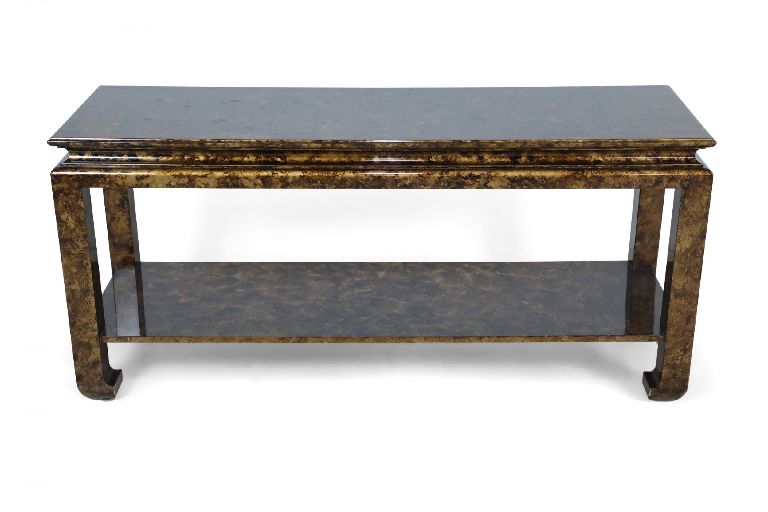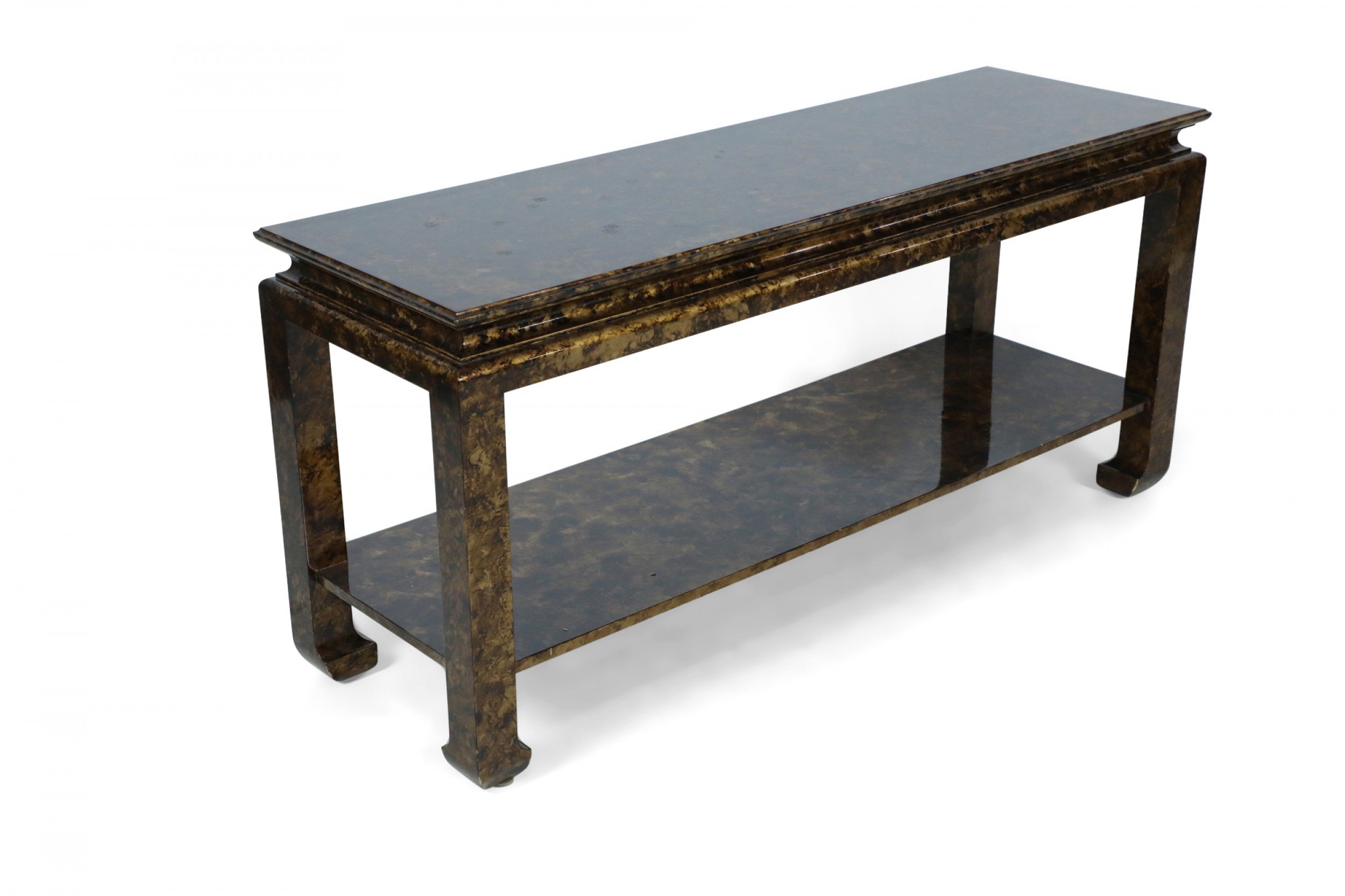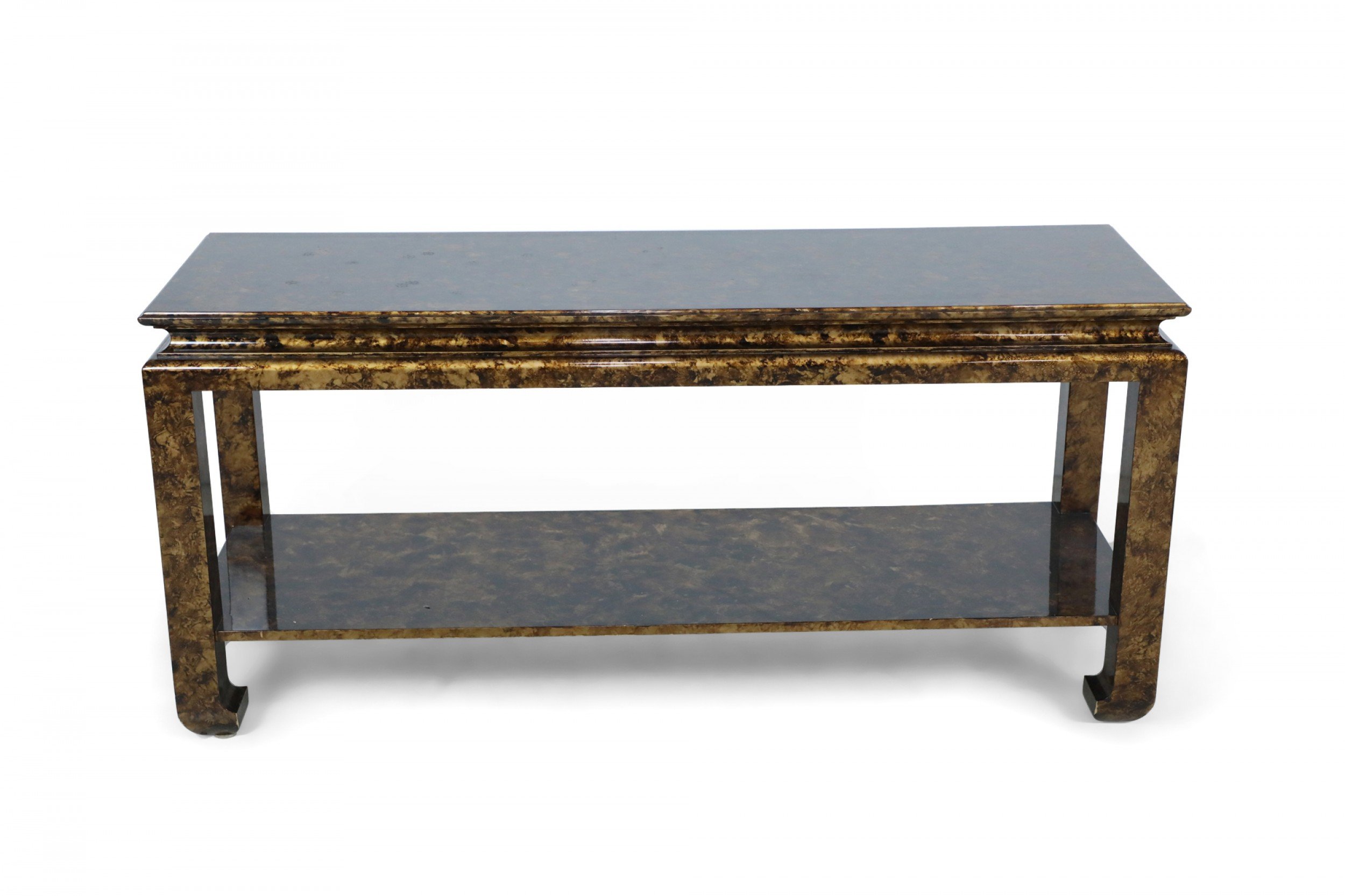 Mid-Century Chinoiserie style rectangular console table with a faux tortoise shell veneer, high gloss lacquered finish, and lower shelf.
