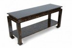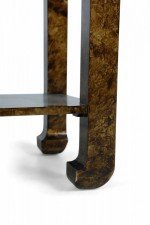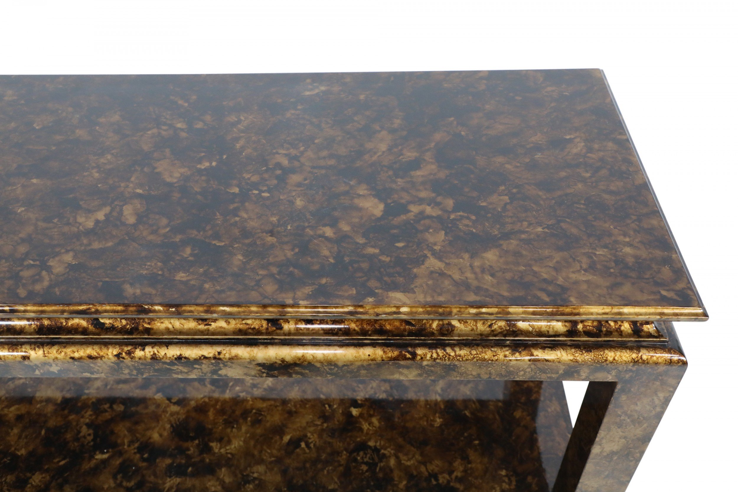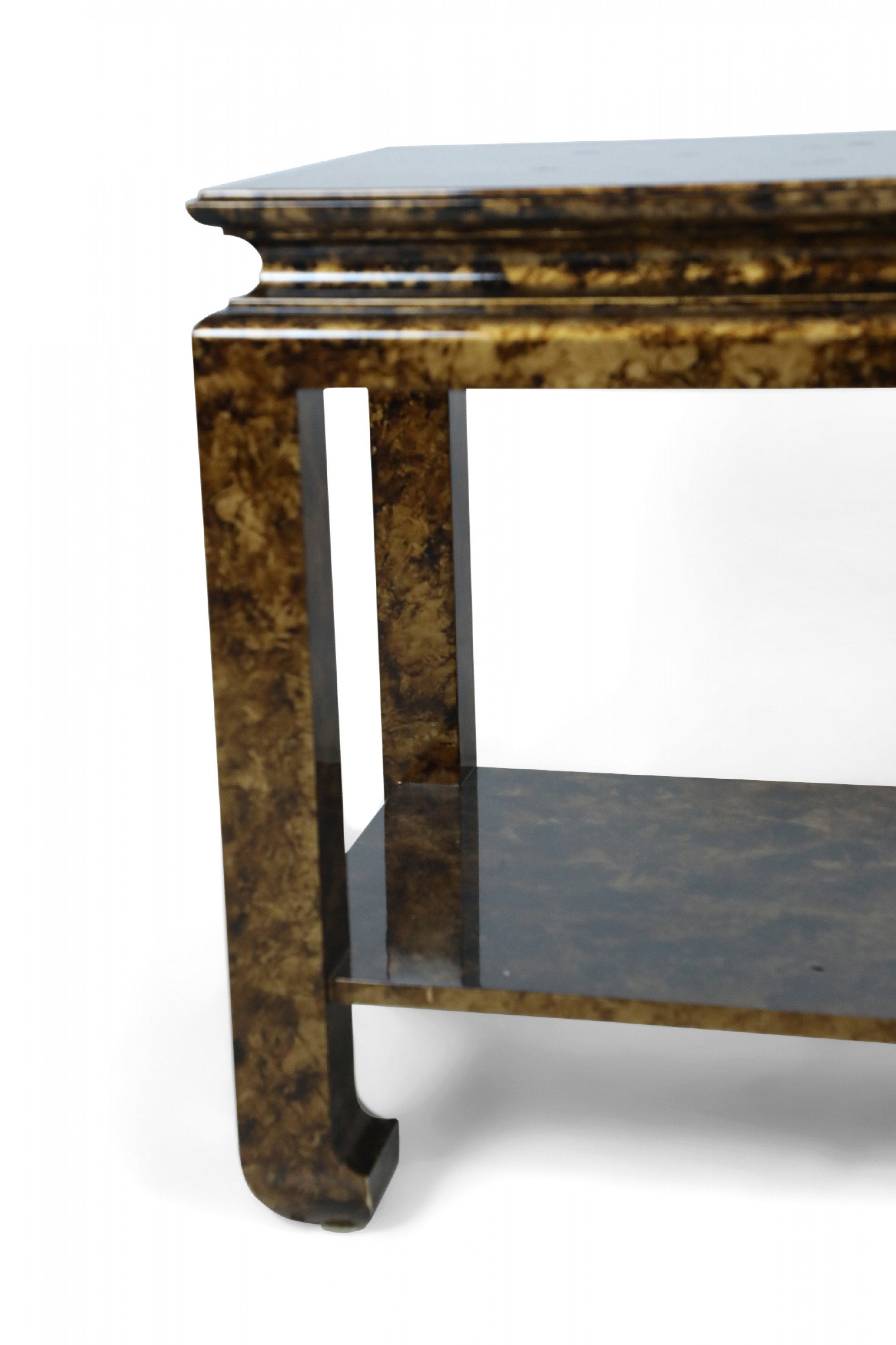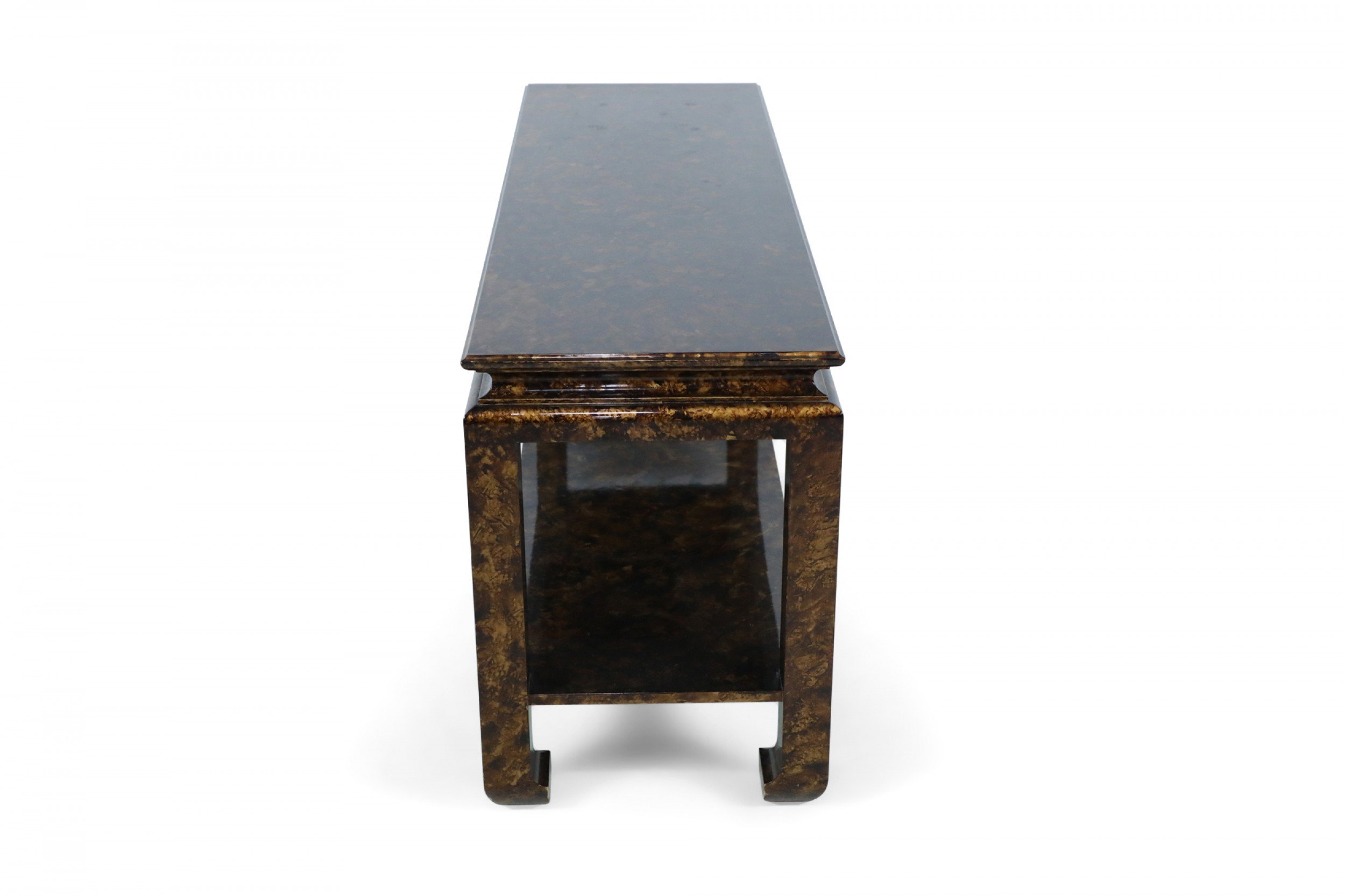 Mid-Century Chinoiserie style rectangular console table with a faux tortoise shell veneer, high gloss lacquered finish, and lower shelf.