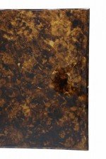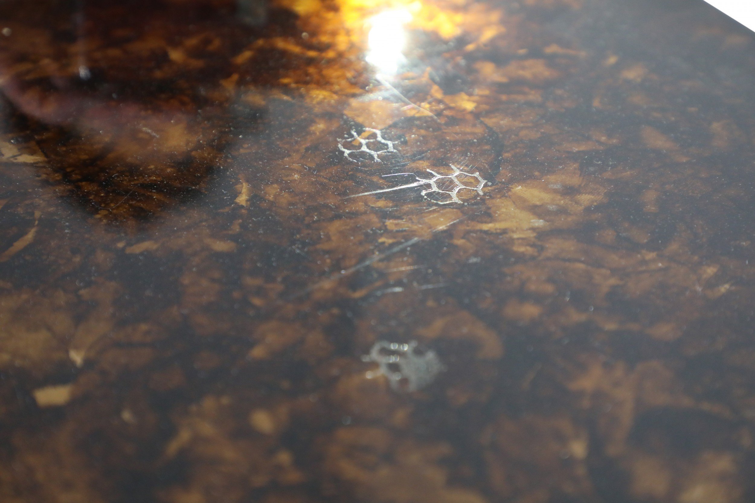 Style: Mid-Century Materials & Techniques: Veneer, wood, tortoise-shell Category: Tables, Dining Room Condition: Small hexagonal impressions left in top lacquer finish in several places.