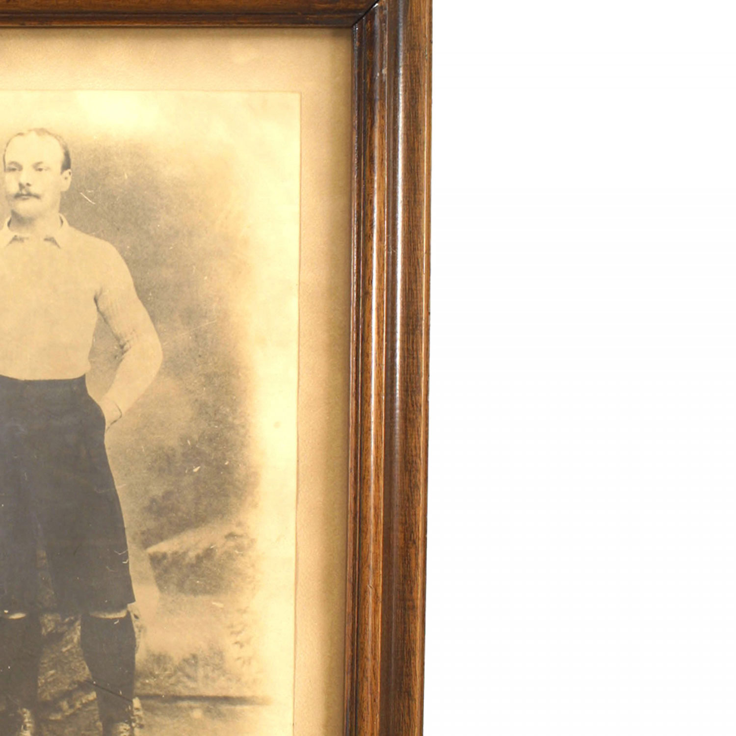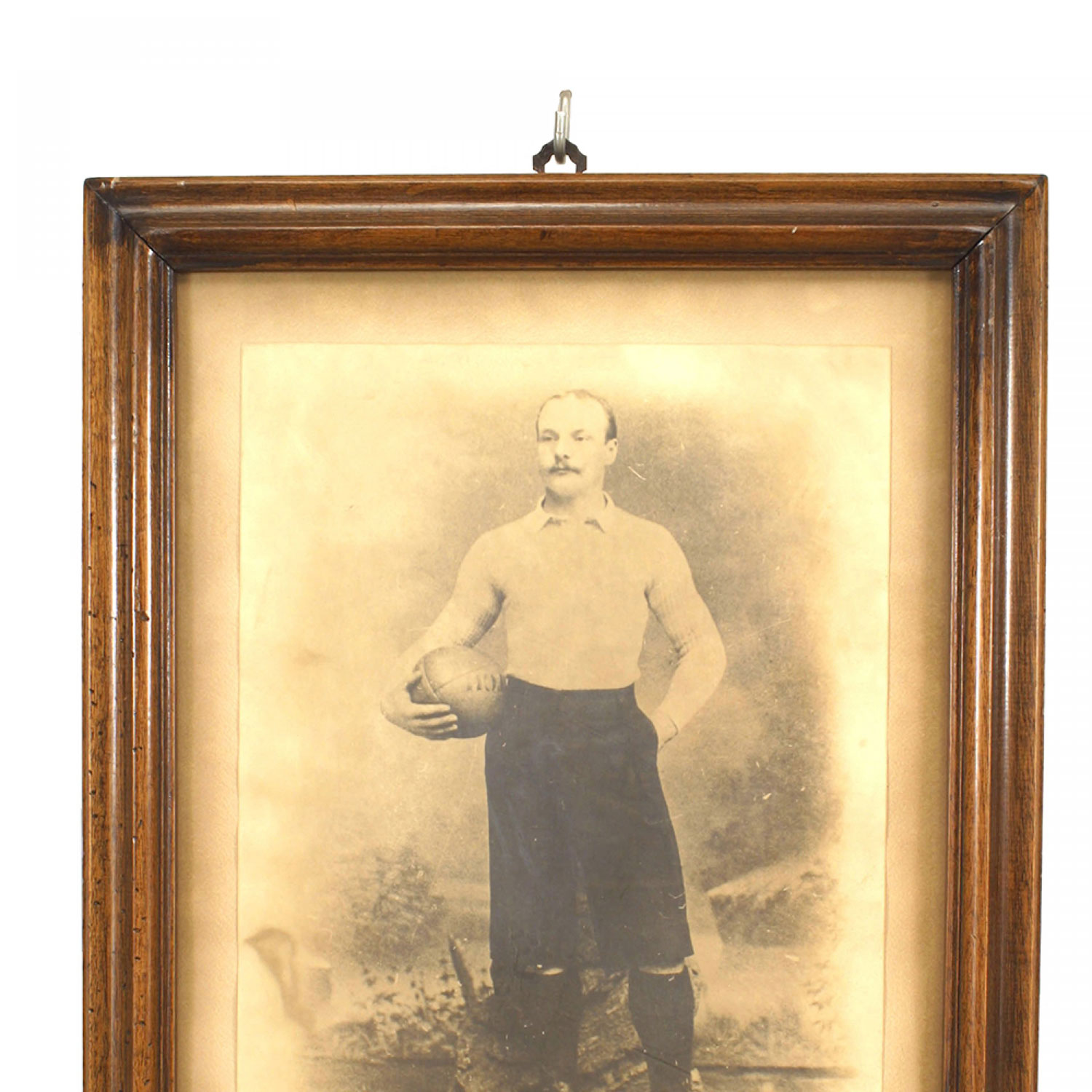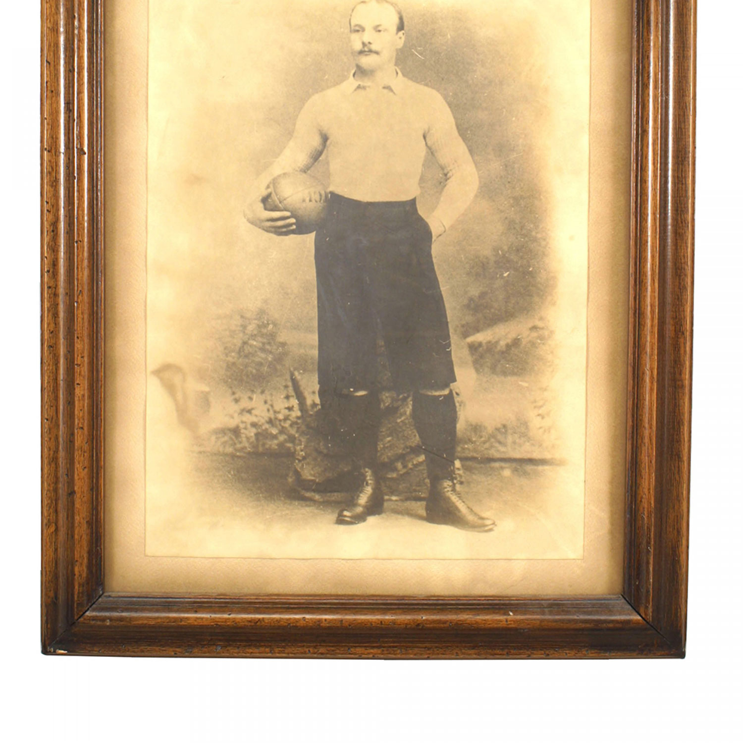 Antique sepia photograph of a 19th Century football player in a rectangular walnut frame.