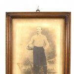 Antique sepia photograph of a 19th Century football player in a rectangular walnut frame..
