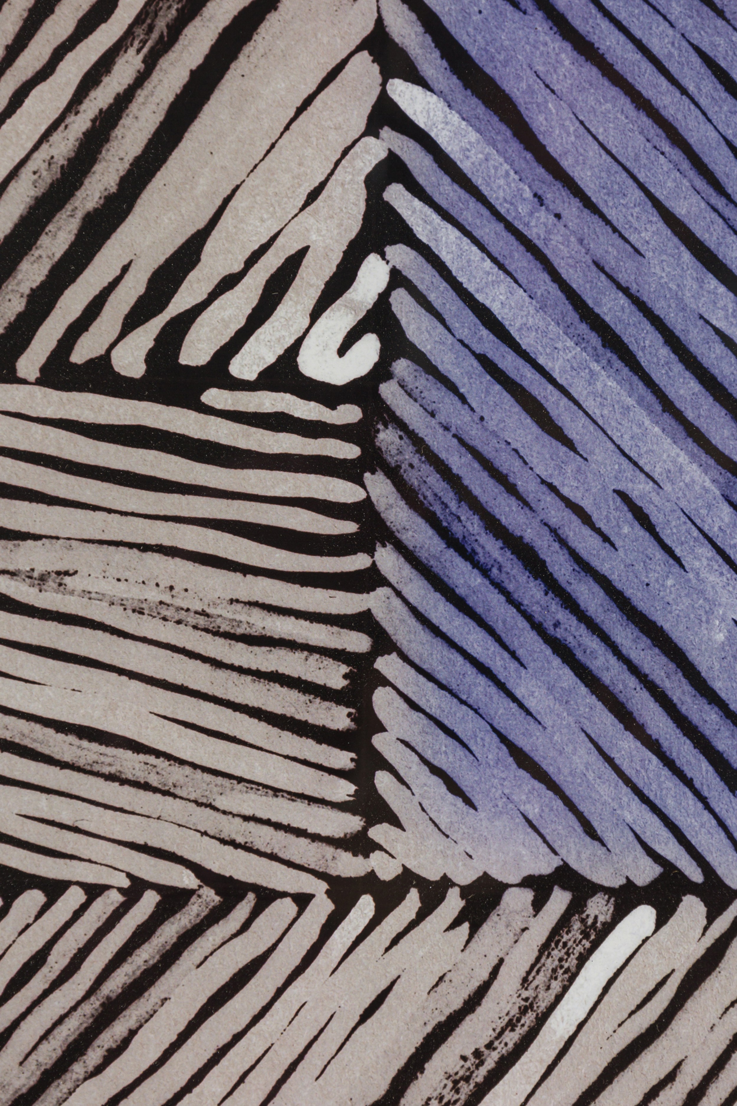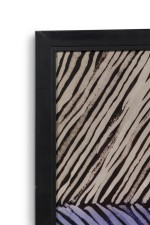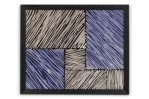 Framed print of an abstract painting composed of overlapping blocks of diagonal lines in green, lavender, and deep blue, rendered in a geometric pattern with expressionist brushwork in a black frame.