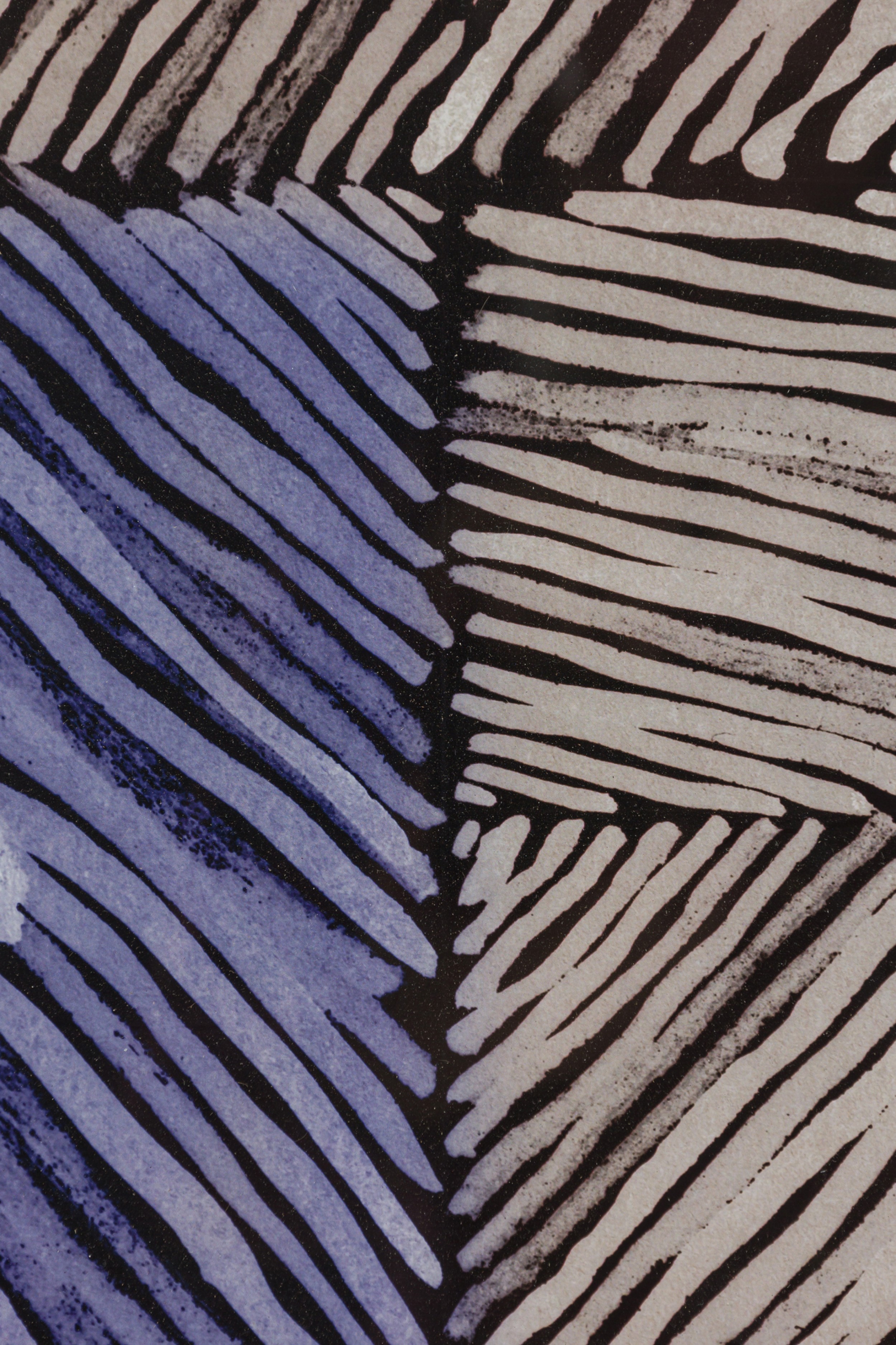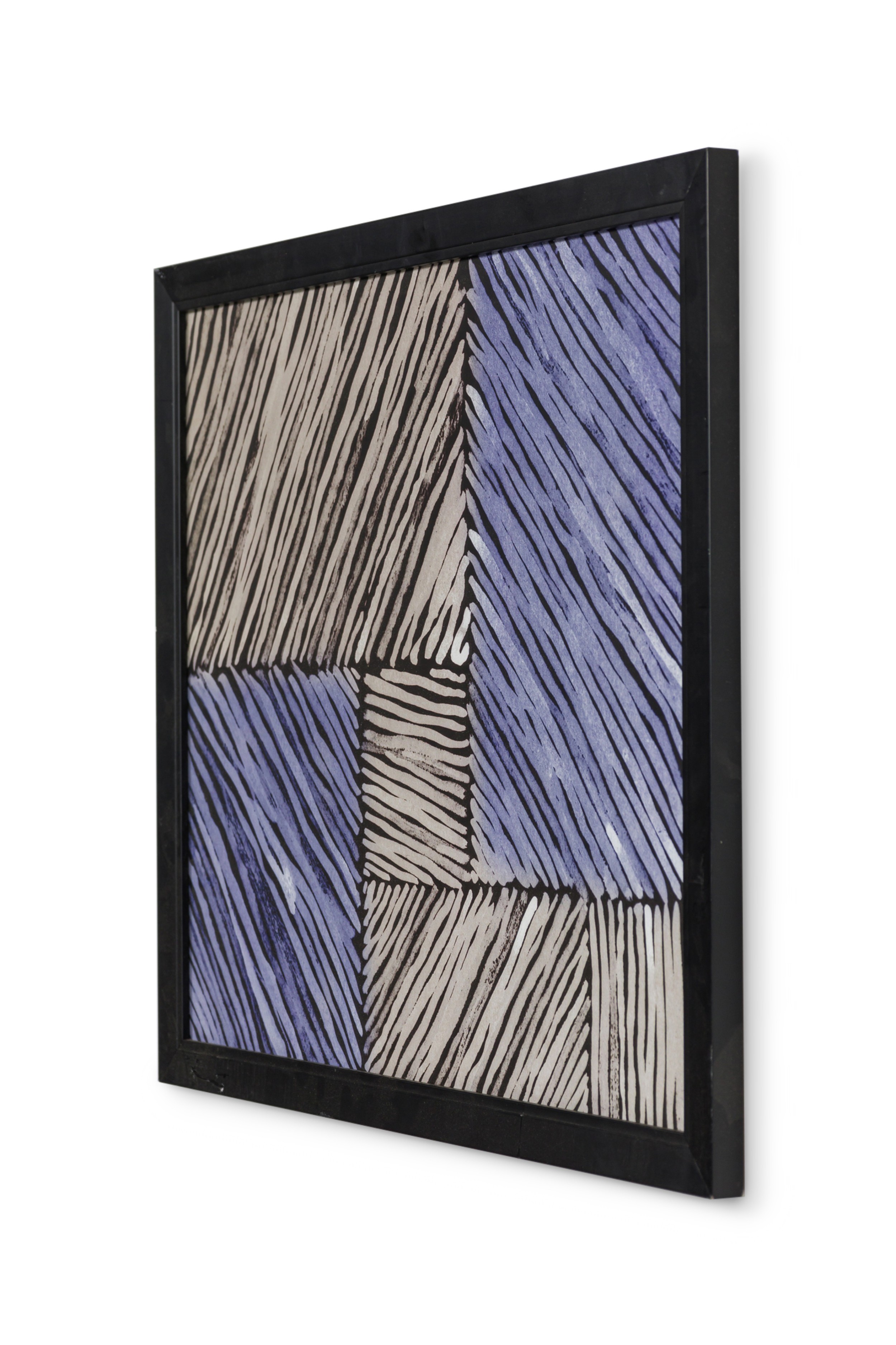 Framed print of an abstract painting composed of overlapping blocks of diagonal lines in green, lavender, and deep blue, rendered in a geometric pattern with expressionist brushwork in a black frame..