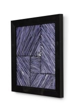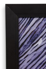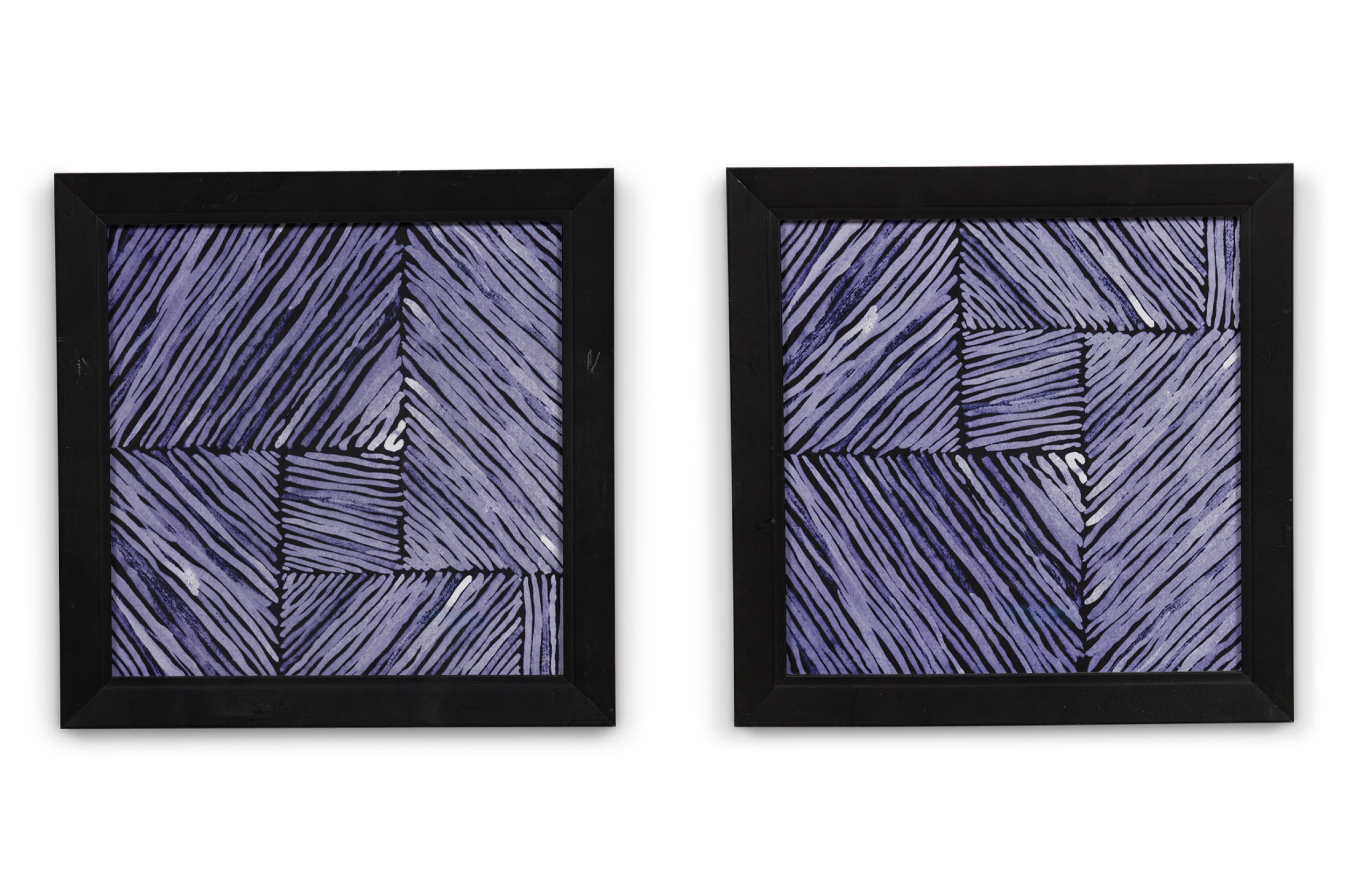 Pair of framed prints of contemporary abstract paintings featuring diagonal purple and black linework arranged in a geometric patchwork pattern. Housed in a simple black frame.