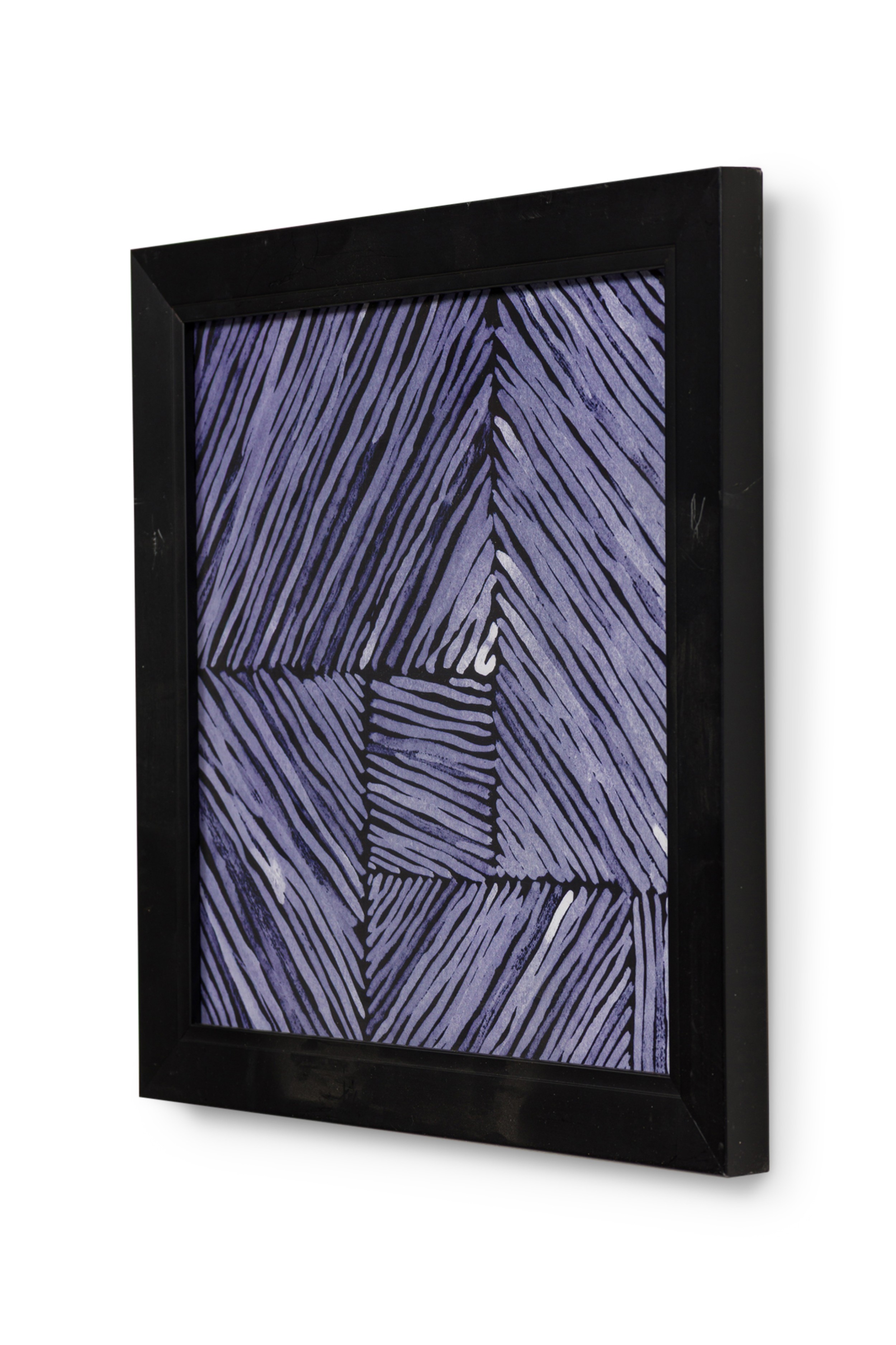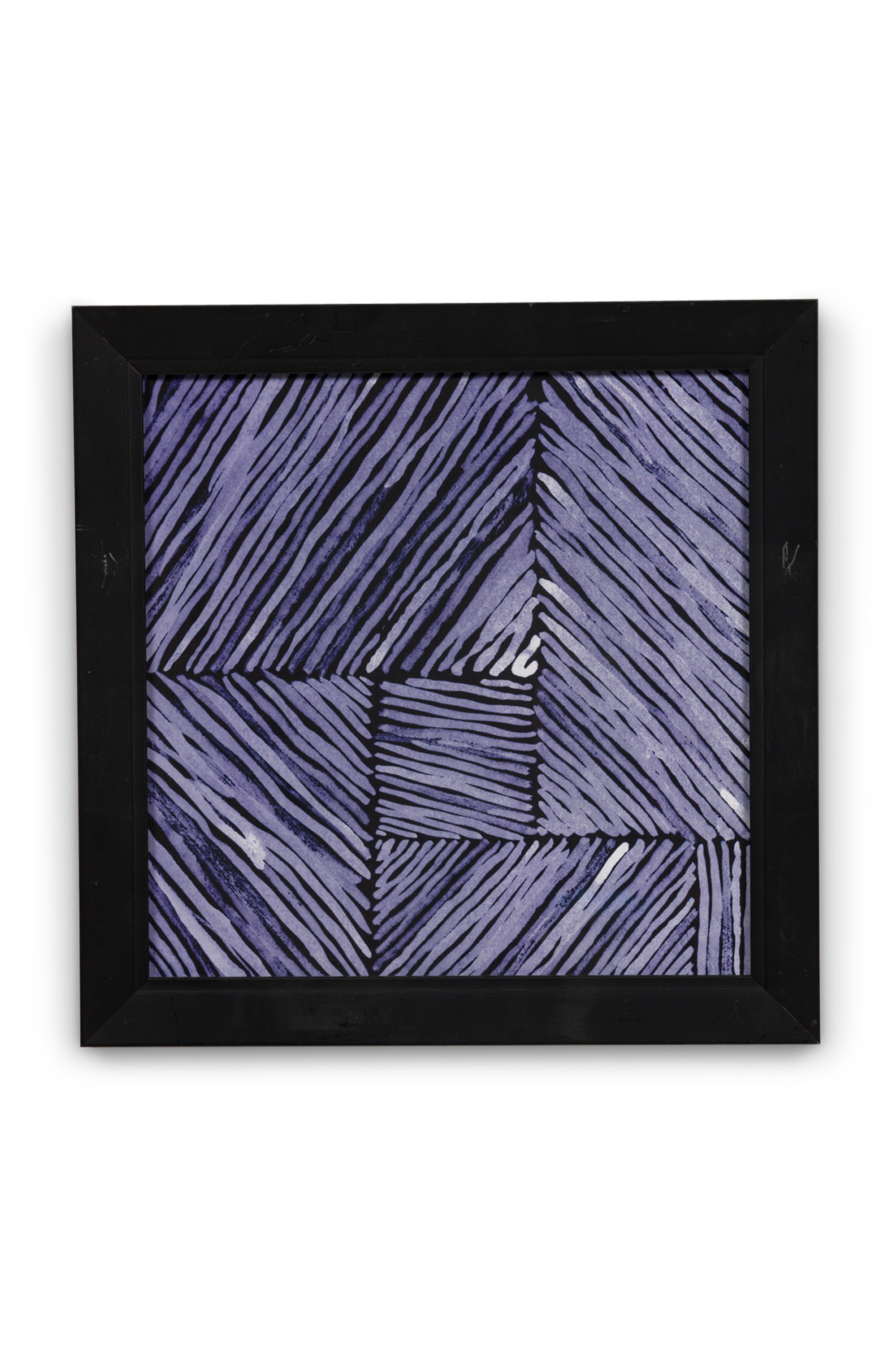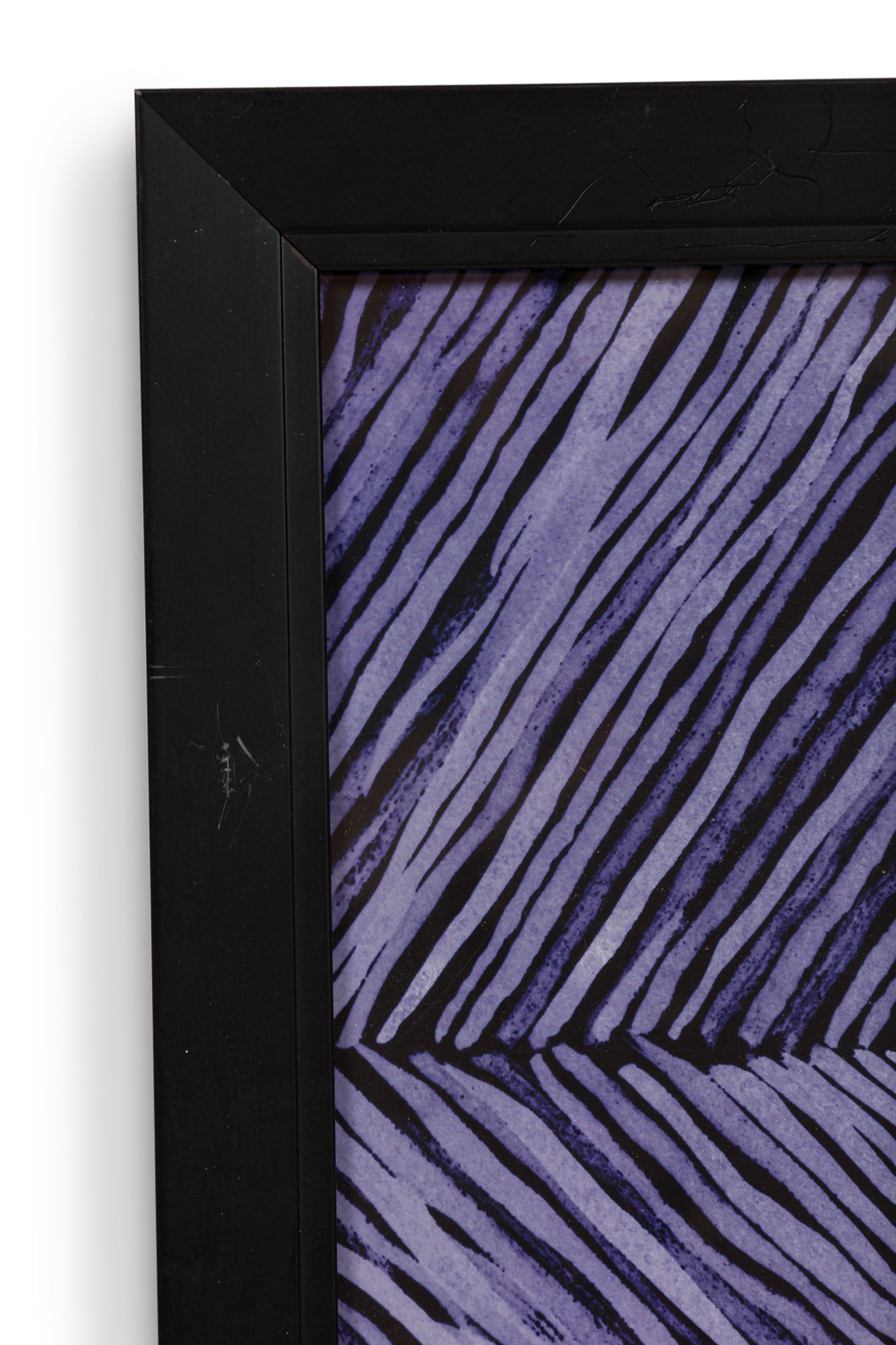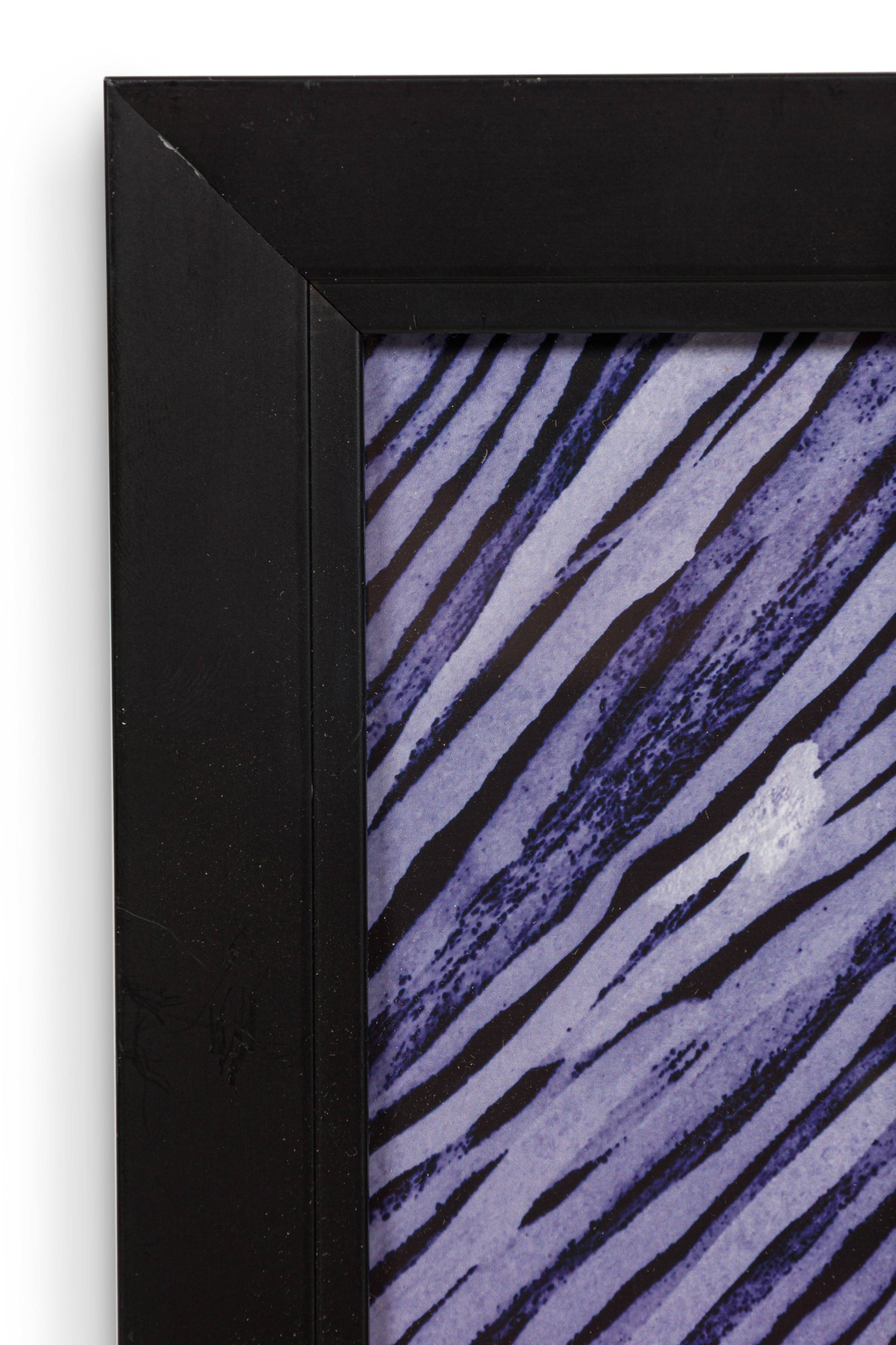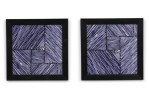 Pair of framed prints of contemporary abstract paintings featuring diagonal purple and black linework arranged in a geometric patchwork pattern. Housed in a simple black frame..