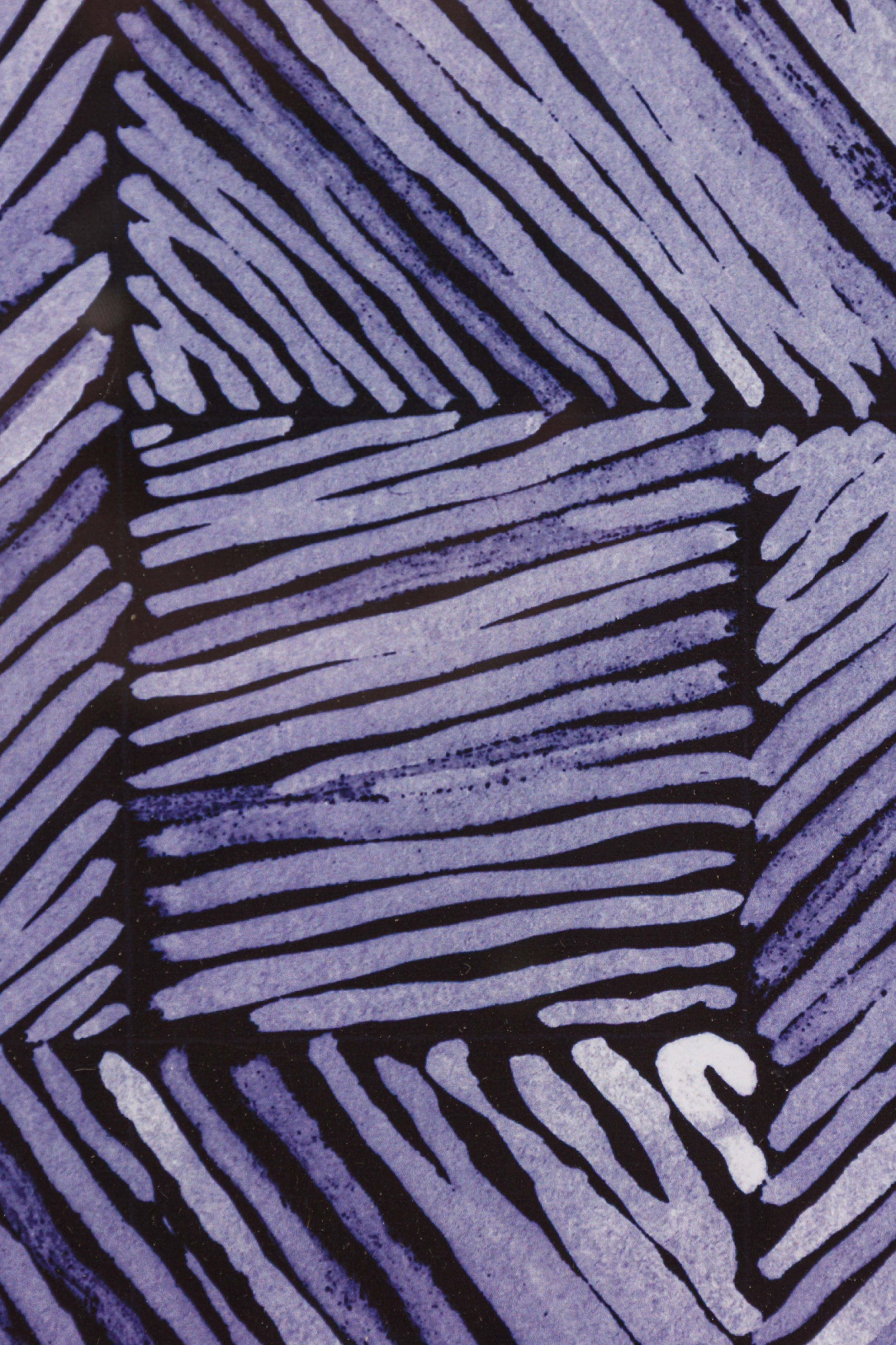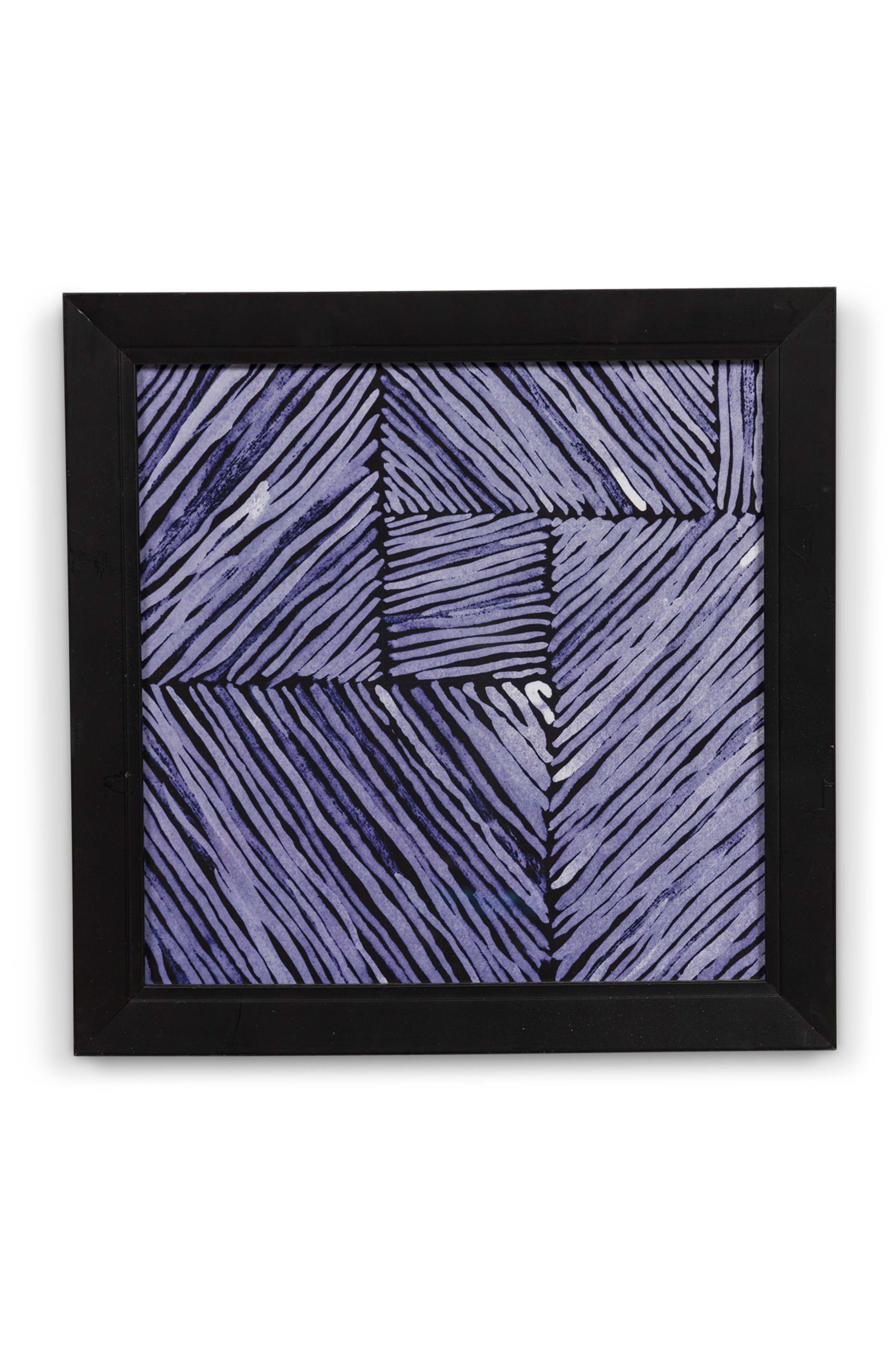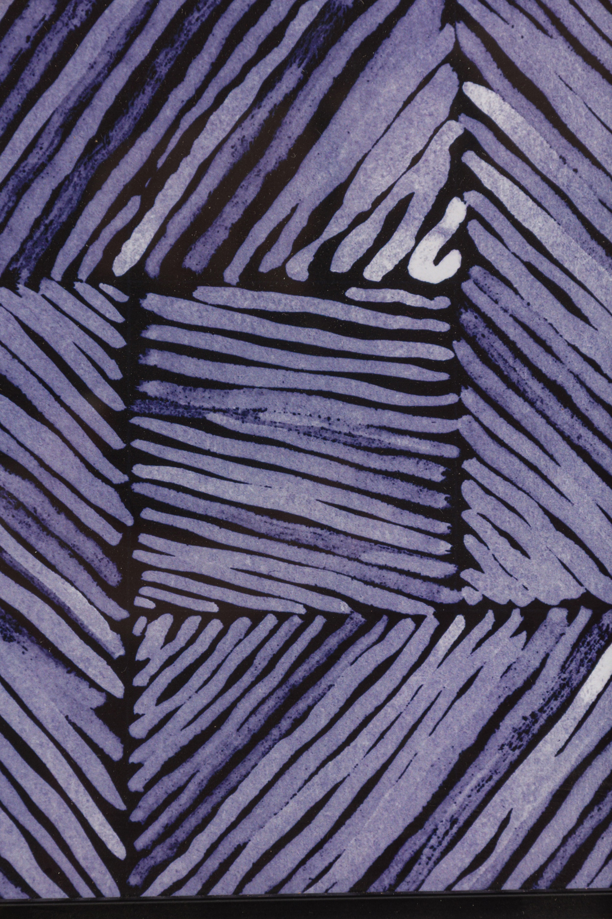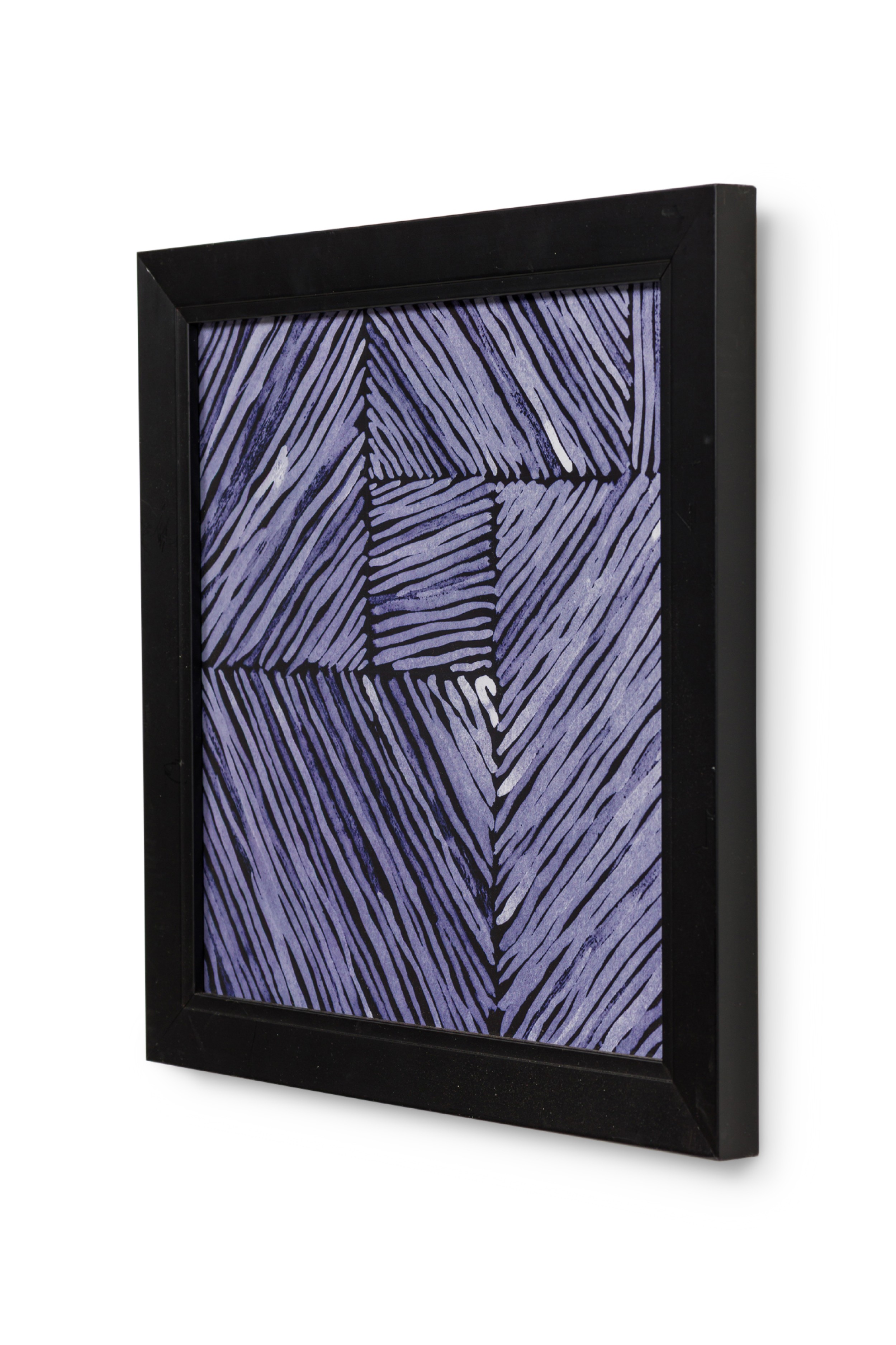 Pair of framed prints of contemporary abstract paintings featuring diagonal purple and black linework arranged in a geometric patchwork pattern. Housed in a simple black frame..