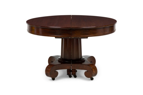 Style: American, English, Mid-Century Materials & Techniques: Carved, mahogany, wood Category: Tables, Office/Library, Dining Room Condition: 100" W with leaves extended Good; Wear consistent with age and use