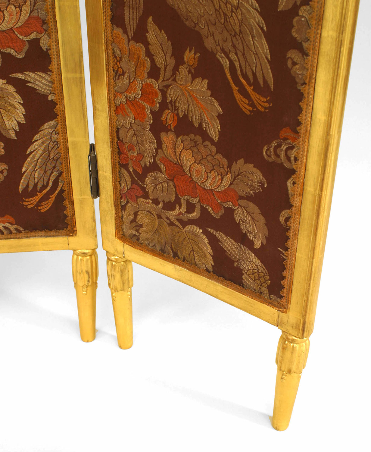 French Art Deco low 3 fold gilt screen with arch form center and upholstered panels in maroon with floral & bird design (attributed to SUE & MARE)