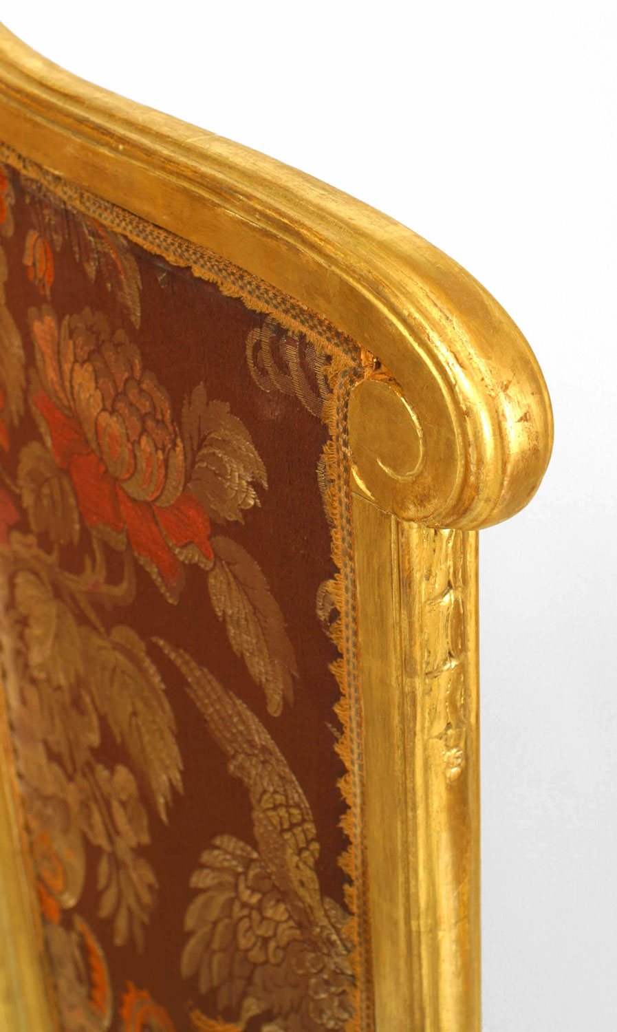 French Art Deco low 3 fold gilt screen with arch form center and upholstered panels in maroon with floral & bird design (attributed to SUE & MARE).