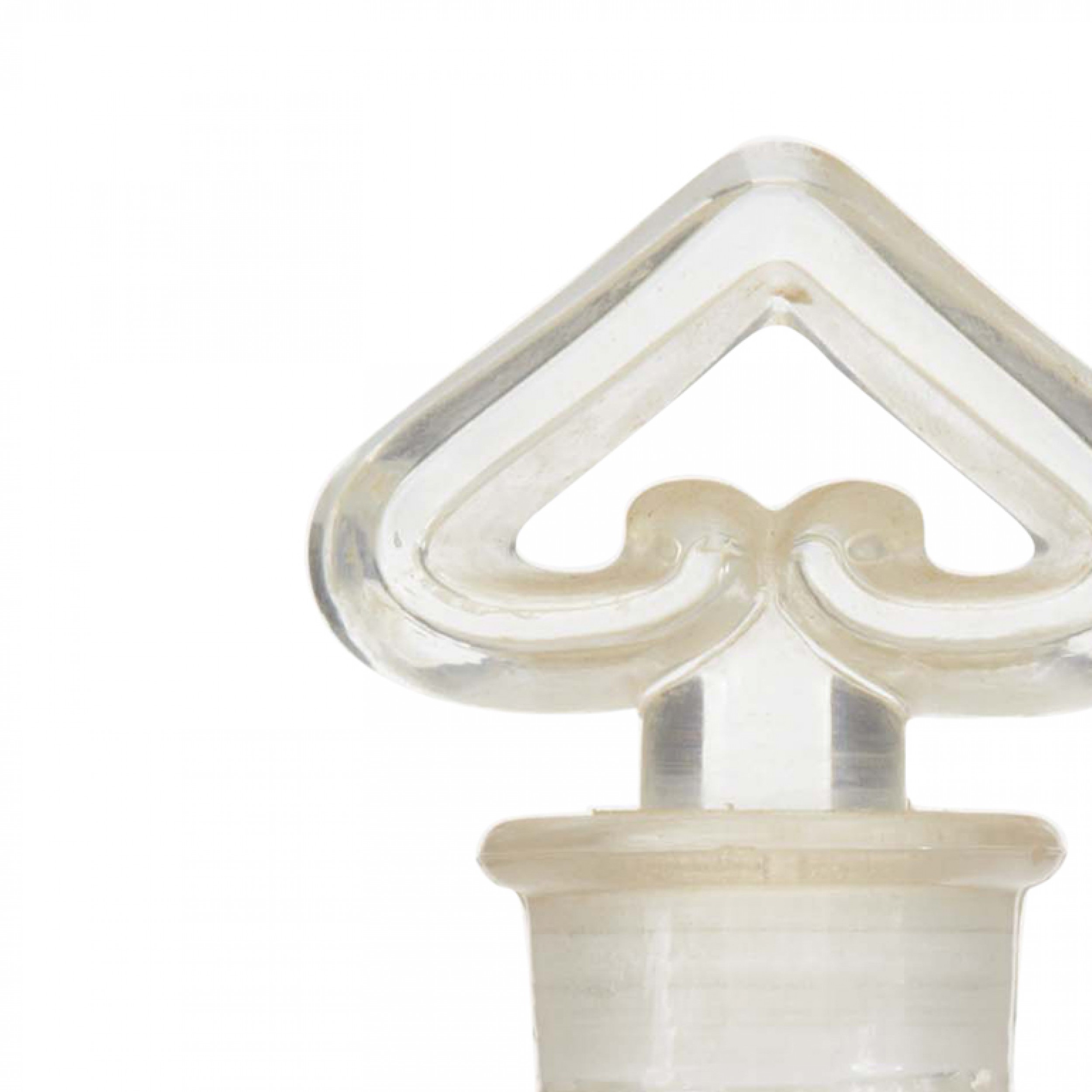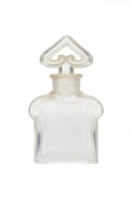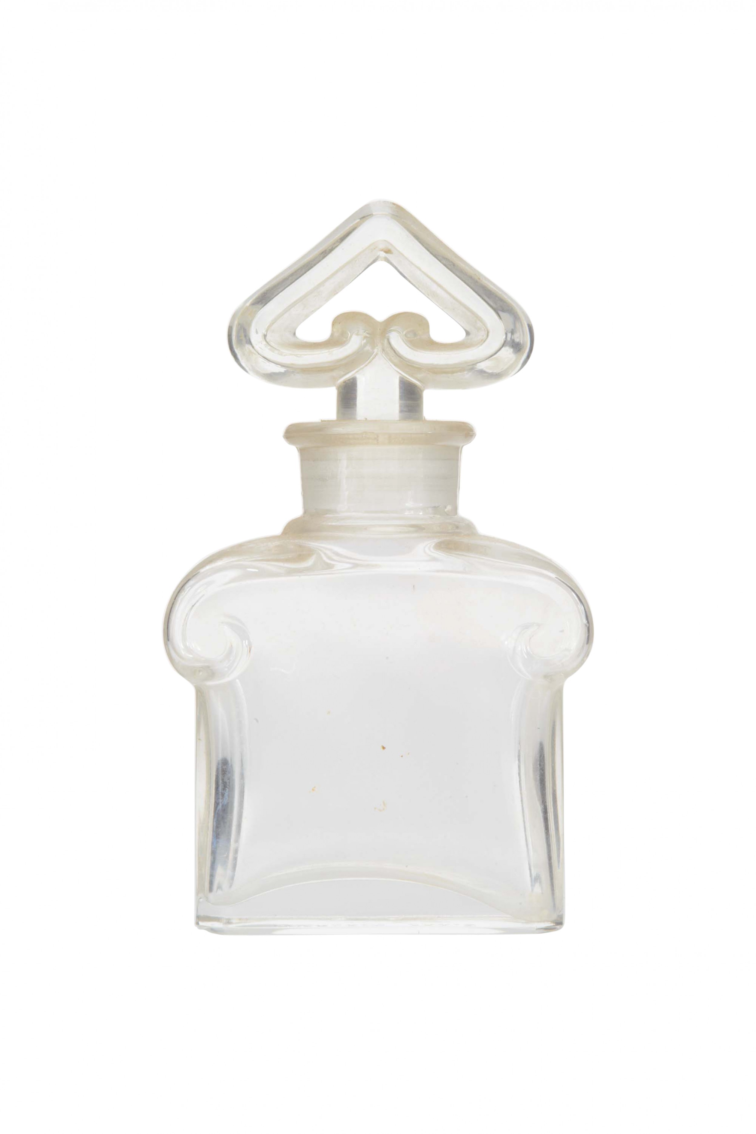 French Art Deco glass perfume bottle with scrolled shoulders and a heart shaped stopper ( by BACCARAT for Guerlain "Mitsouko or L'heure Bleu").