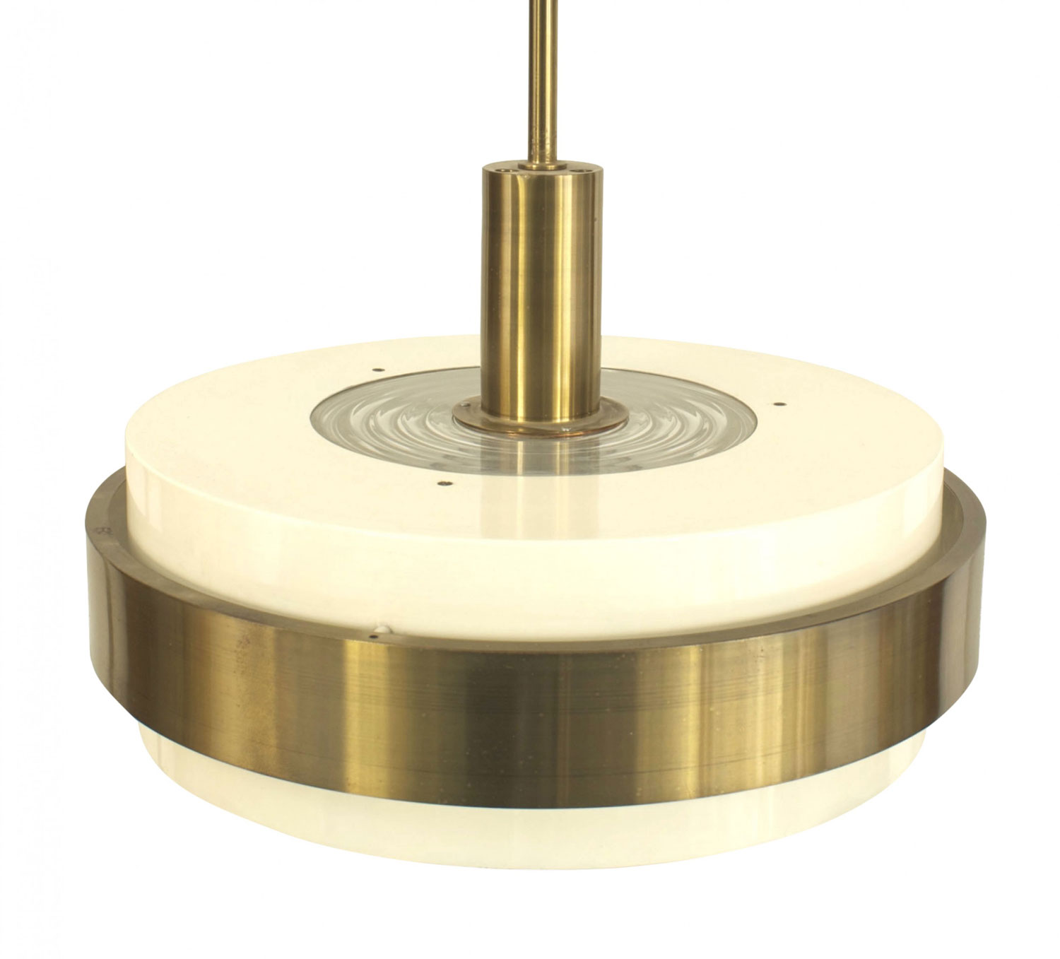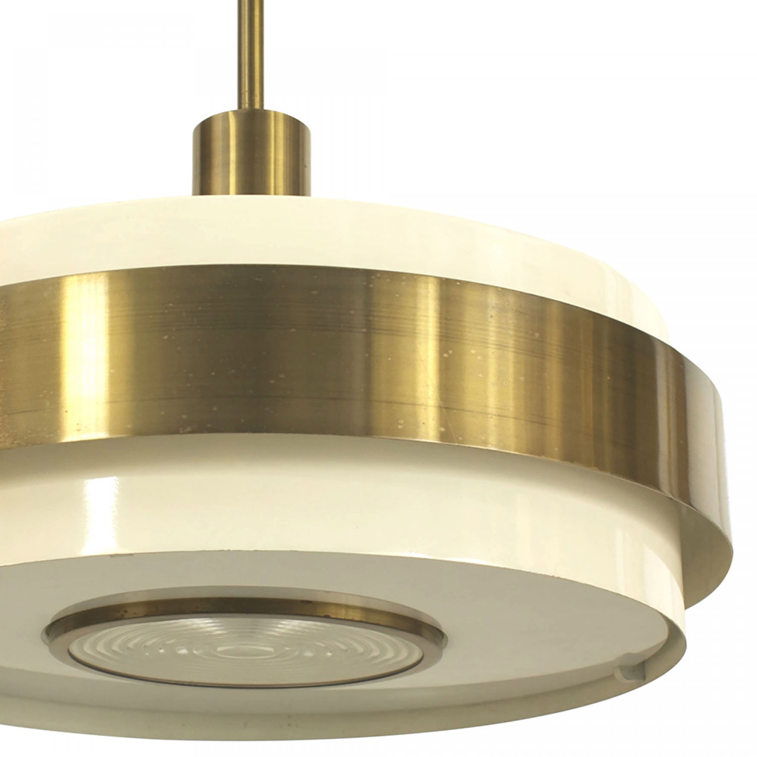 French Art Deco (circa 1930) cream painted metal and brass trimmed round framed lantern with inset fluted round glass top and bottom panels suspended with brass pole (JEAN PERZEL)..