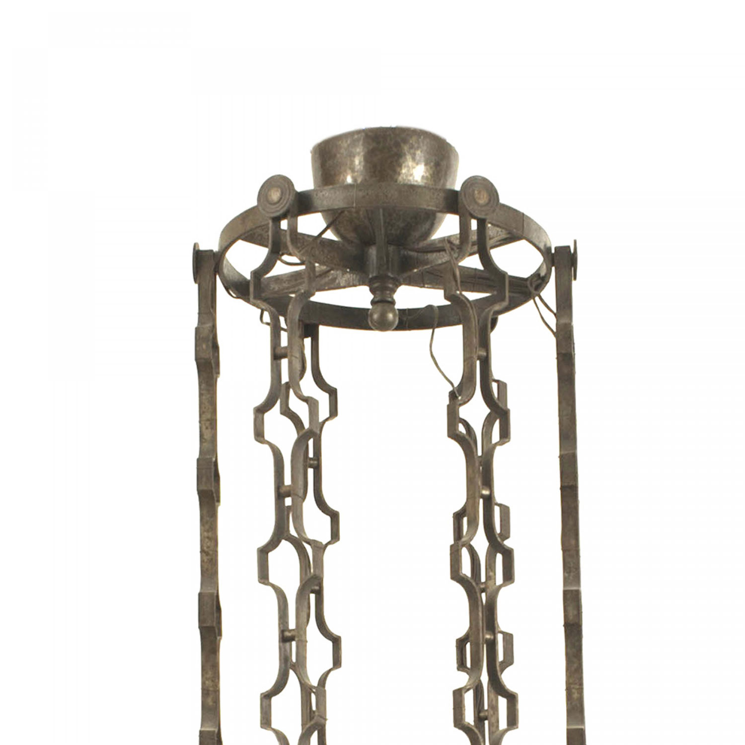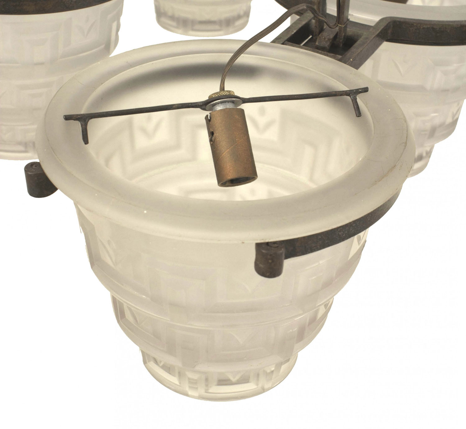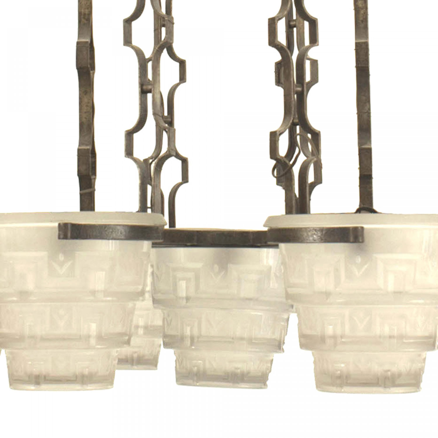French Art Deco (circa 1930) wrought iron chandelier with 6 arms holding tiered conical glass shades (by MULLER) emanating from a center shade & suspended by chains (Attributed to EDGAR BRANDT).
