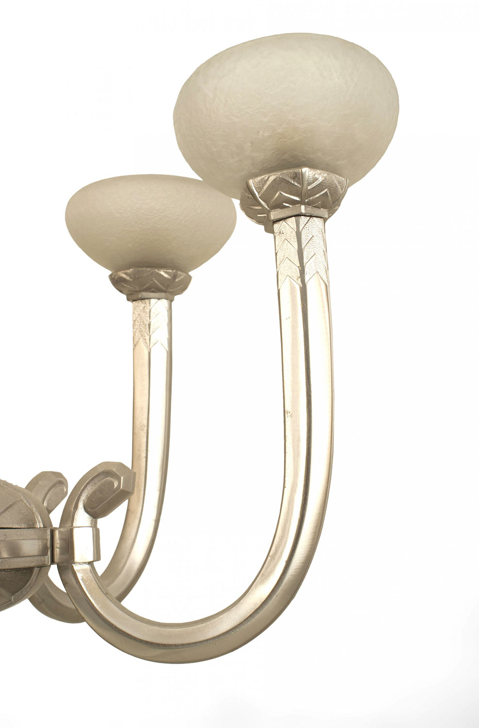French Art Deco (circa 1930) silvered bronze 6 arm chandelier supporting acid etched glass shades emanating from a geometric design center & center post (Glass attributed to SCHNEIDER).