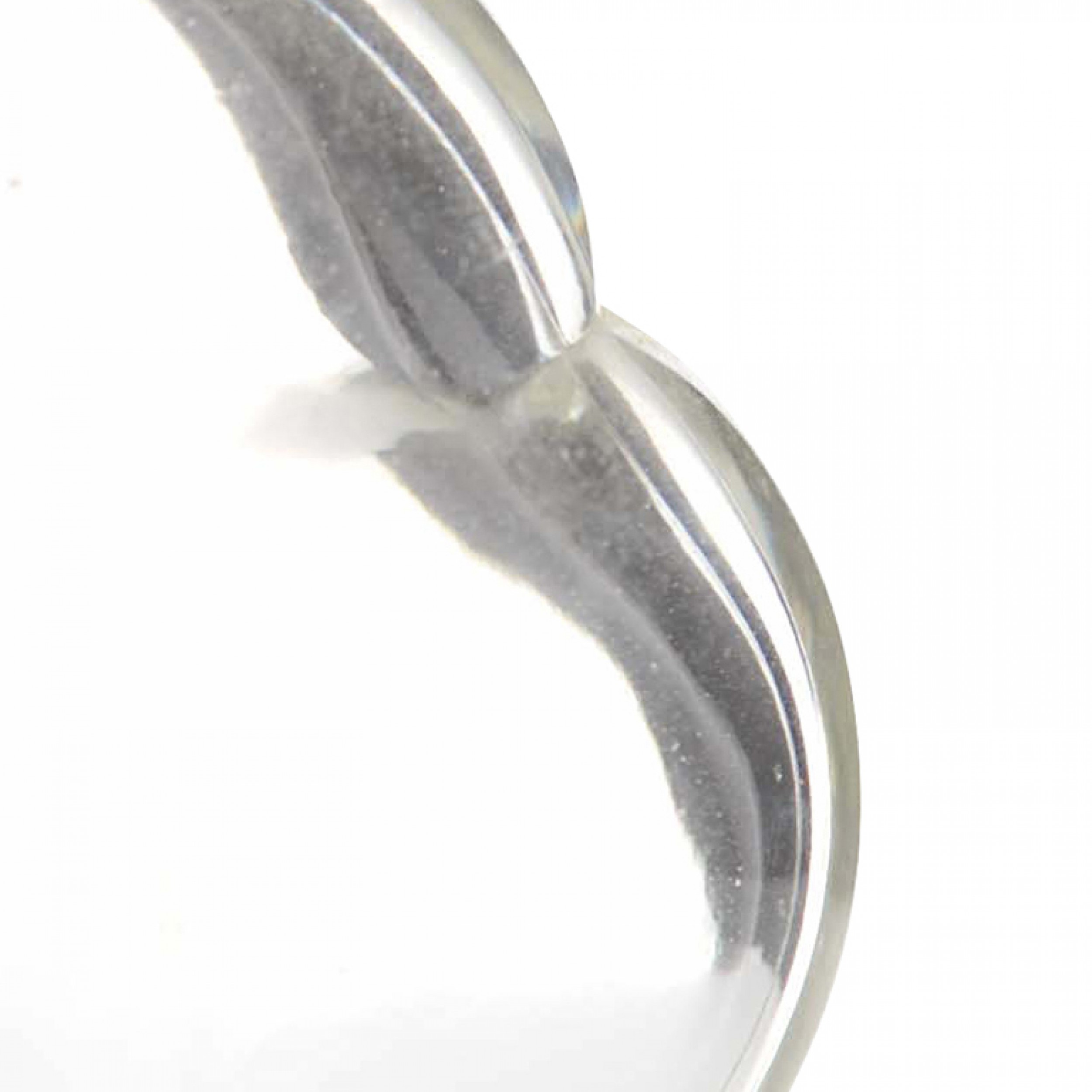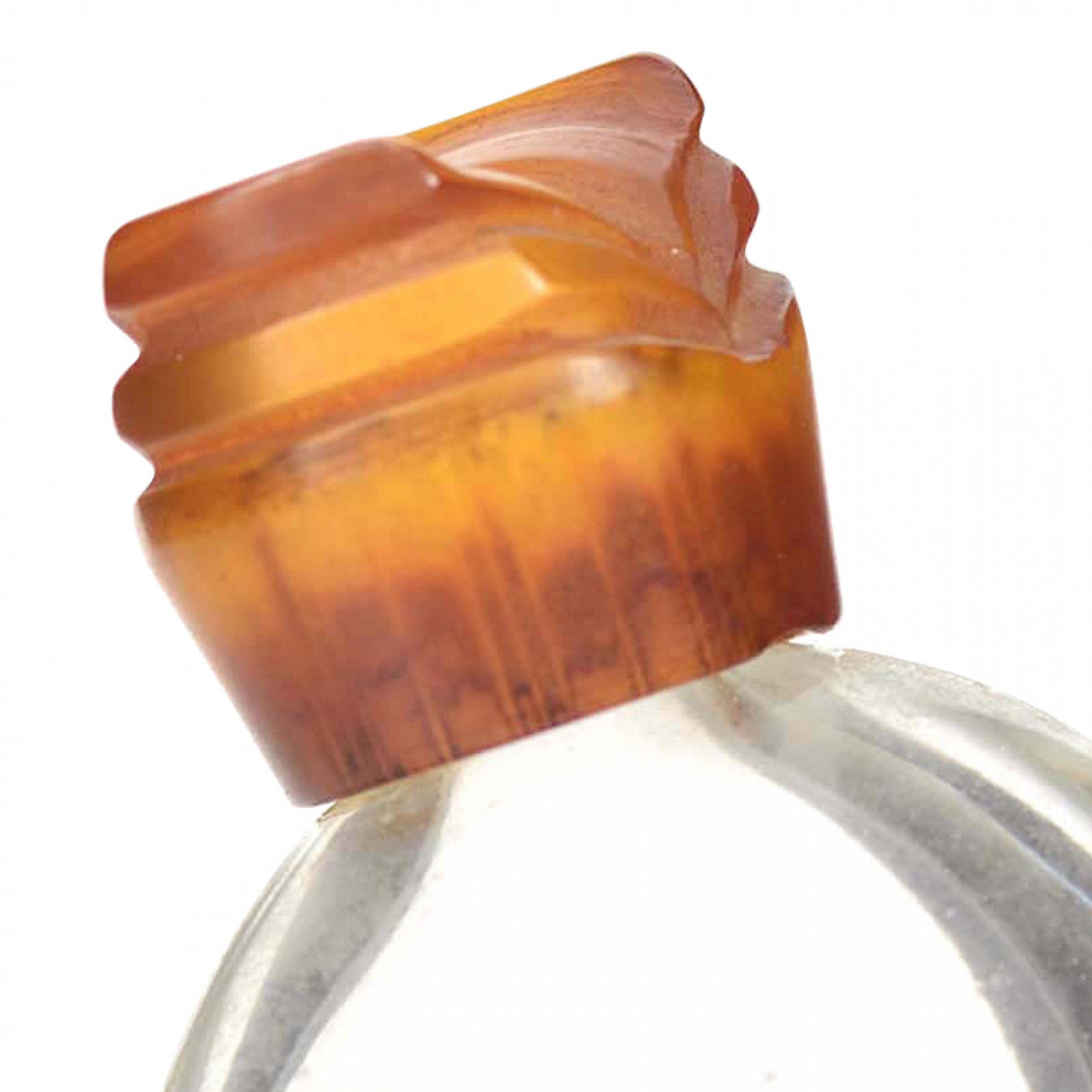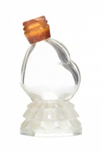 French Art Deco clear and frosted glass perfume bottle (CHICHI by RENOIR "Escarlette Suzy") shaped as a tilted heart on a ruffled round base, with a brown bakelite stopper.