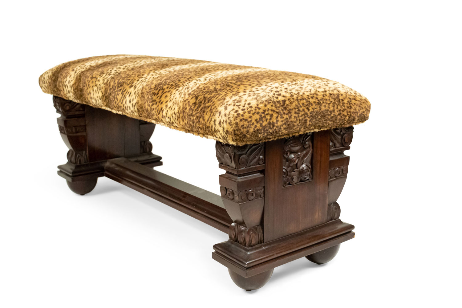 French Art Deco palisander wood double pedestal base rectangular bench with stretcher & carved floral supports and faux leopard upholstered seat..