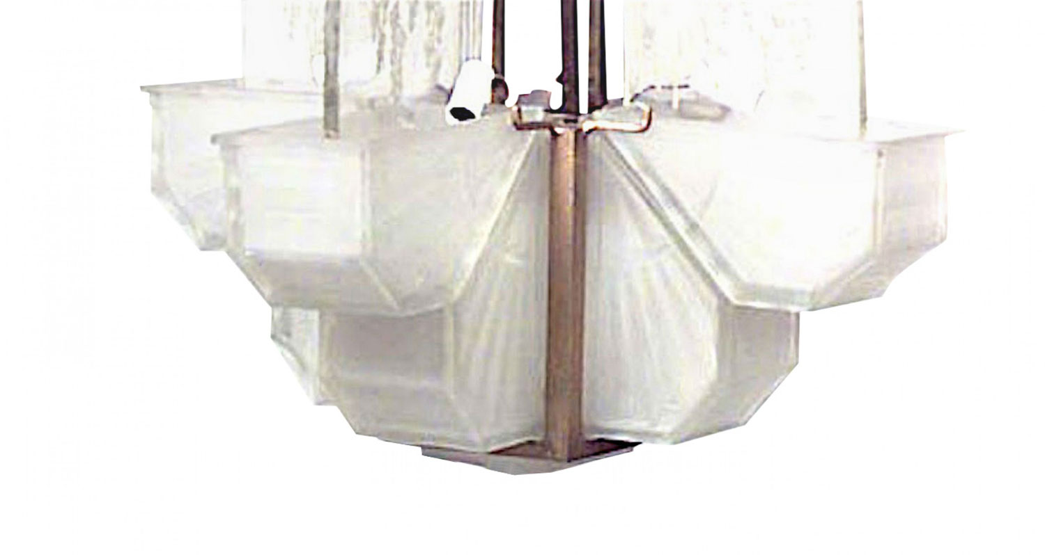 French Art Deco frosted glass 4 corner chandelier with etched floral design panels. (signed: ATELIER VINCENT)