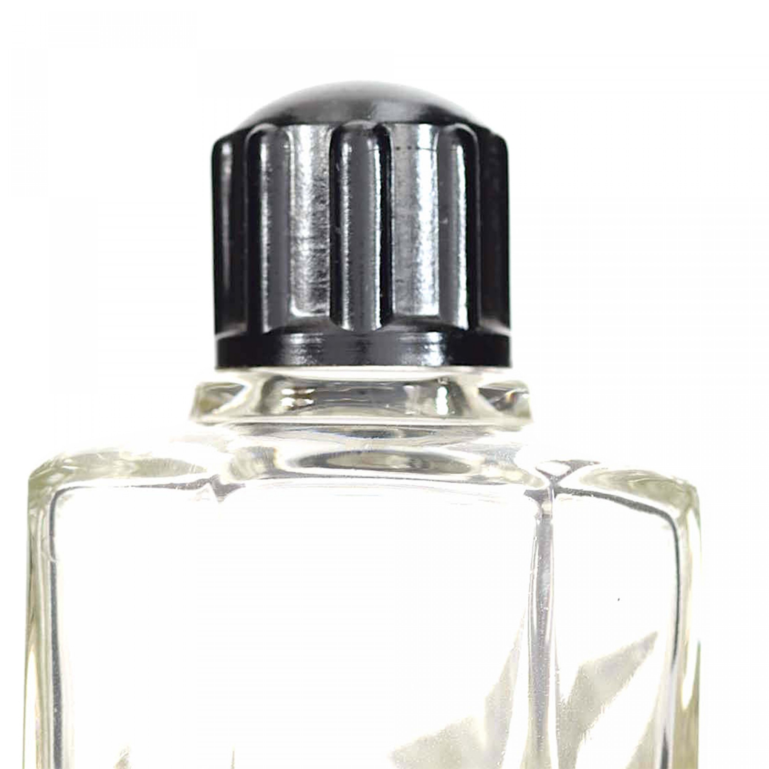 French Art Deco faceted clear glass perfume bottle with enameled geometric design in green and silver and a black plastic twist-off cap. (2-PRICED EACH)