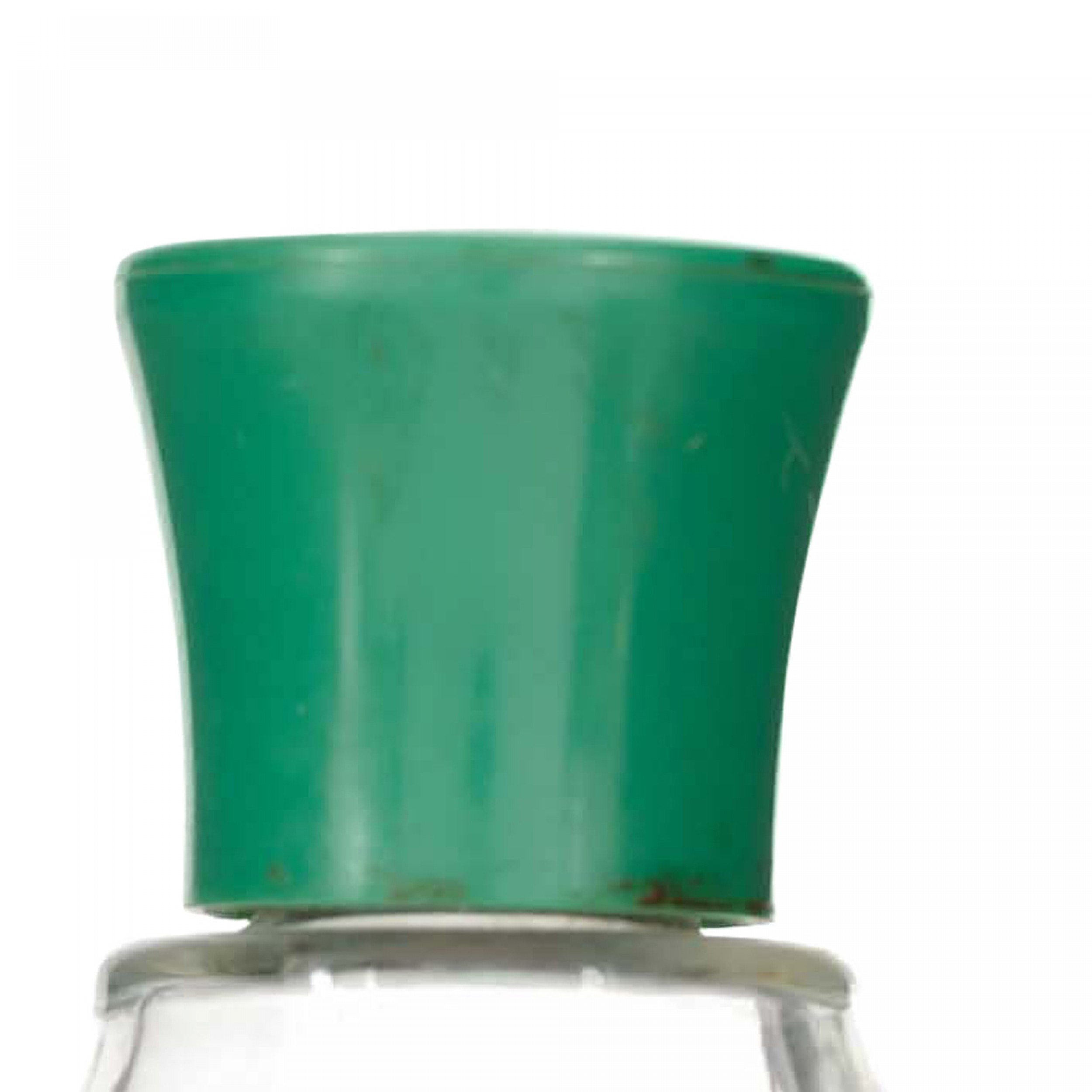 French Art Deco clear glass perfume bottle shaped like a woman's foot in a high-heel shoe, with a green plastic stopper..
