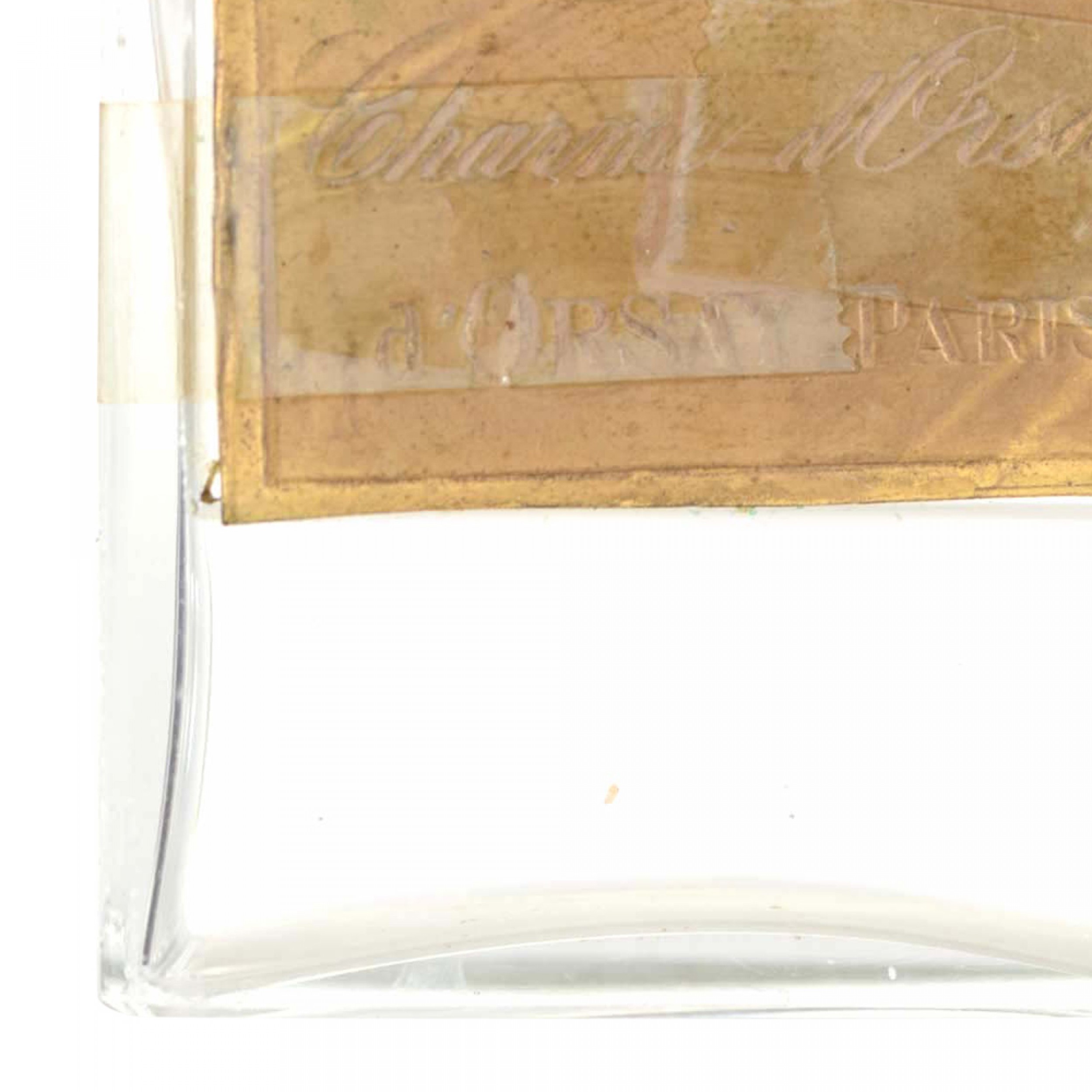 French Art Deco rectangular clear glass perfume bottle (LE CHARME by D'ORSAY) with a gold label and a flared gold-tone metal stopper.