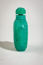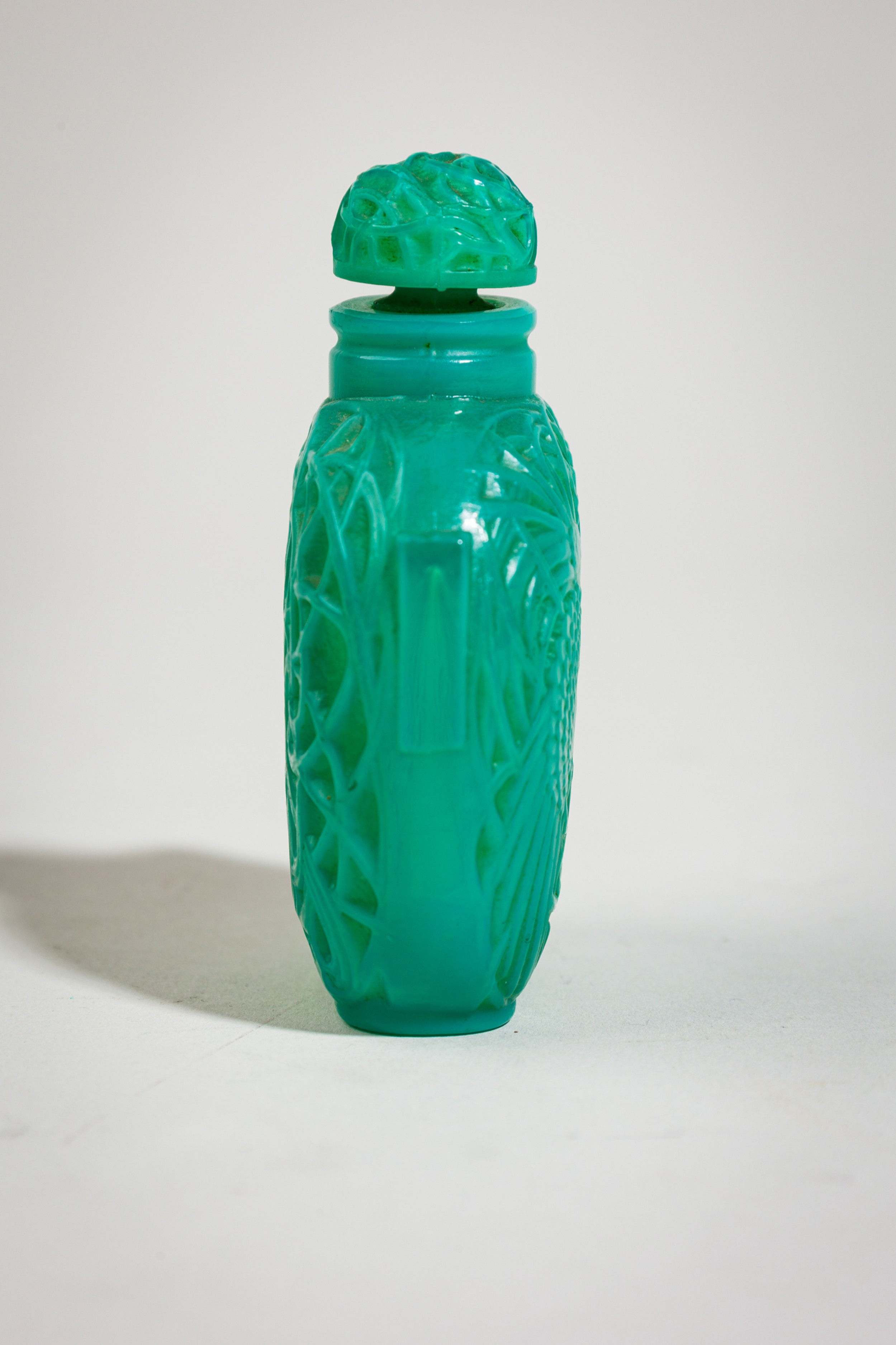 Rene Lalique, rare "Le Jade" perfume bottle French Art Deco green glass perfume bottle (LE JADE by ROGER ET GALLET) with molded overlapping rows of vertical leaf tips along the body and a matching stopper (signed LALIQUE) (as is- chip to top)