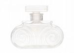 French Art Deco frosted and clear glass perfume bottle (MIRACLE by LENTHERIC) shaped like the capital of a Grecian column, with scrolling motifs on each side and a flat rectangular stopper (VERRERIES BROSSE).