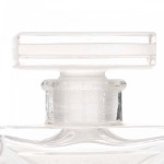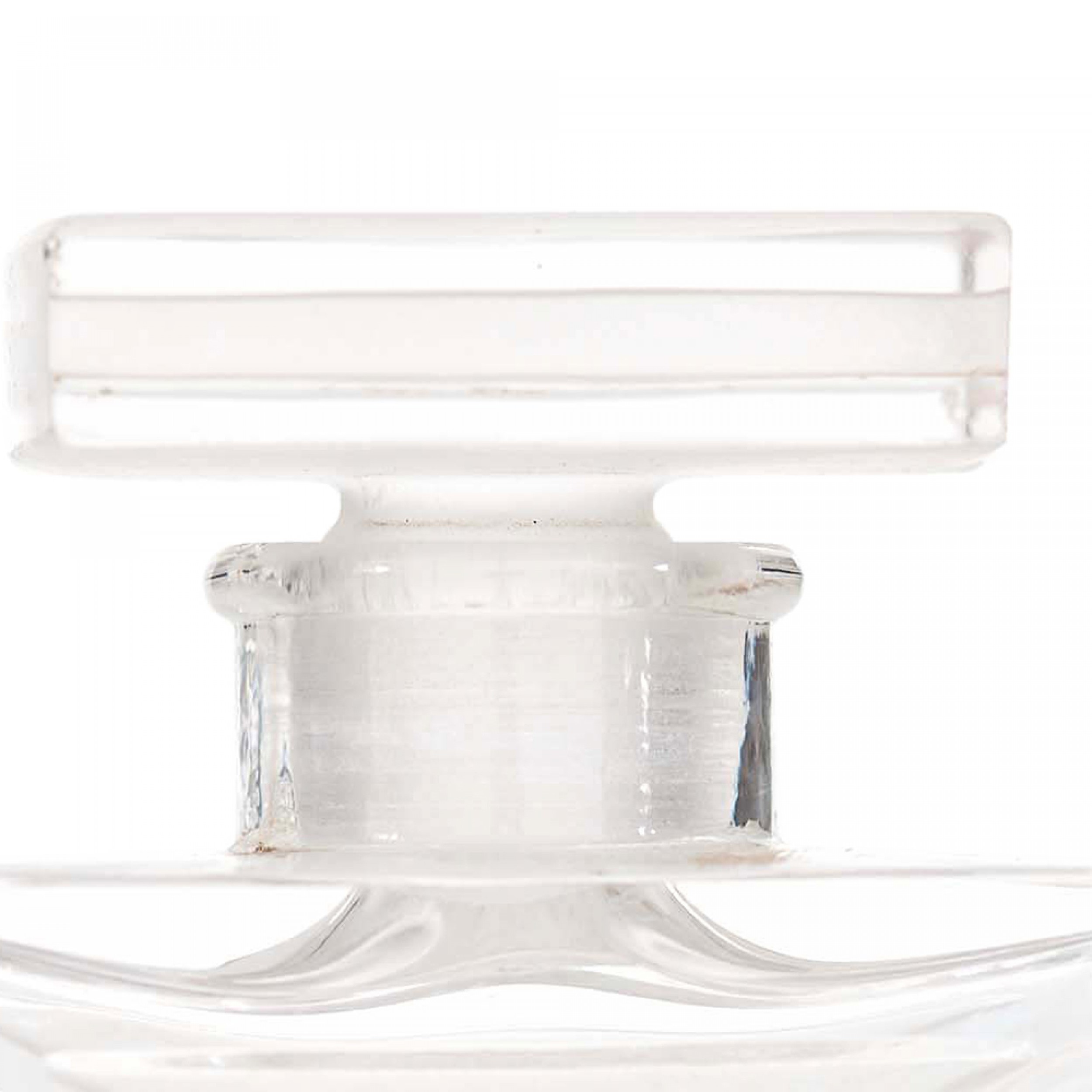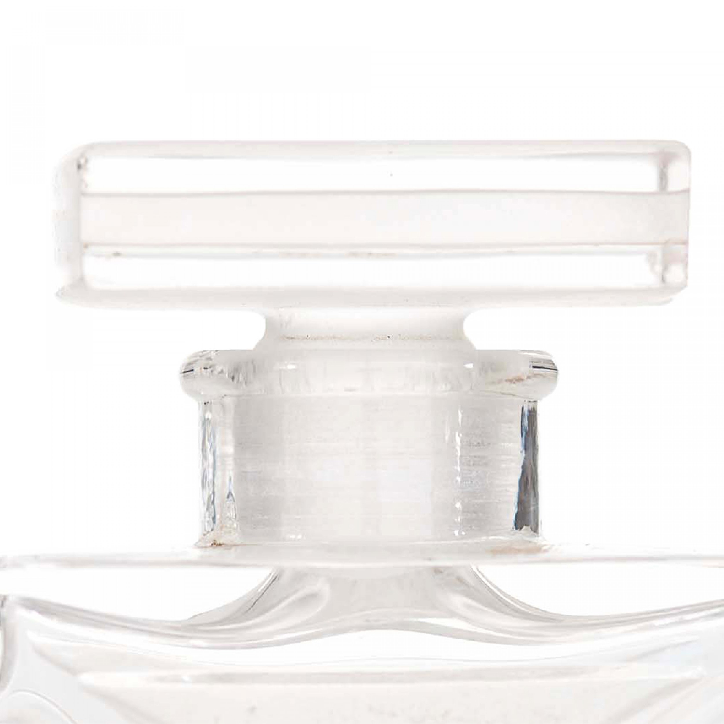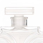 French Art Deco frosted and clear glass perfume bottle (MIRACLE by LENTHERIC) shaped like the capital of a Grecian column, with scrolling motifs on each side and a flat rectangular stopper (VERRERIES BROSSE)