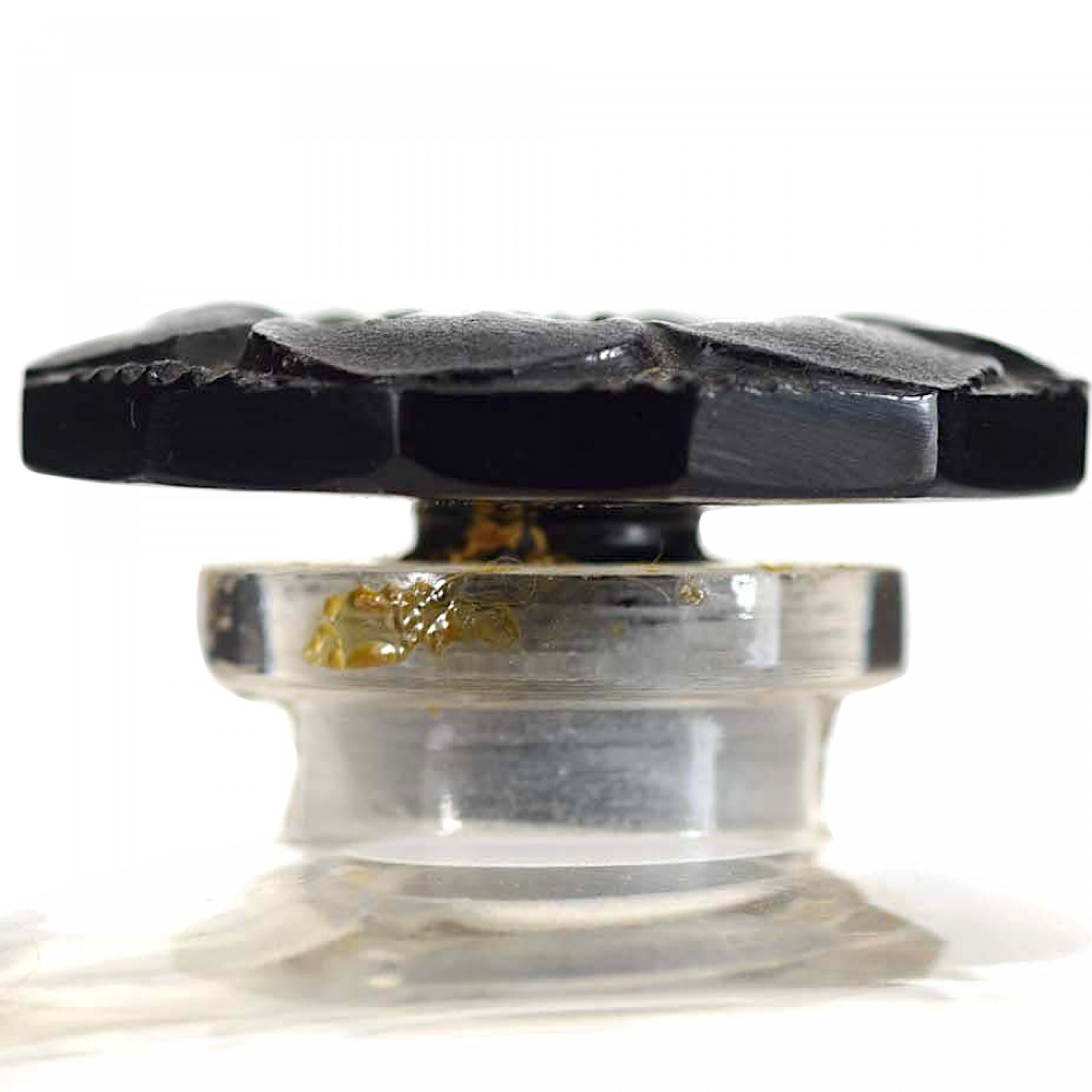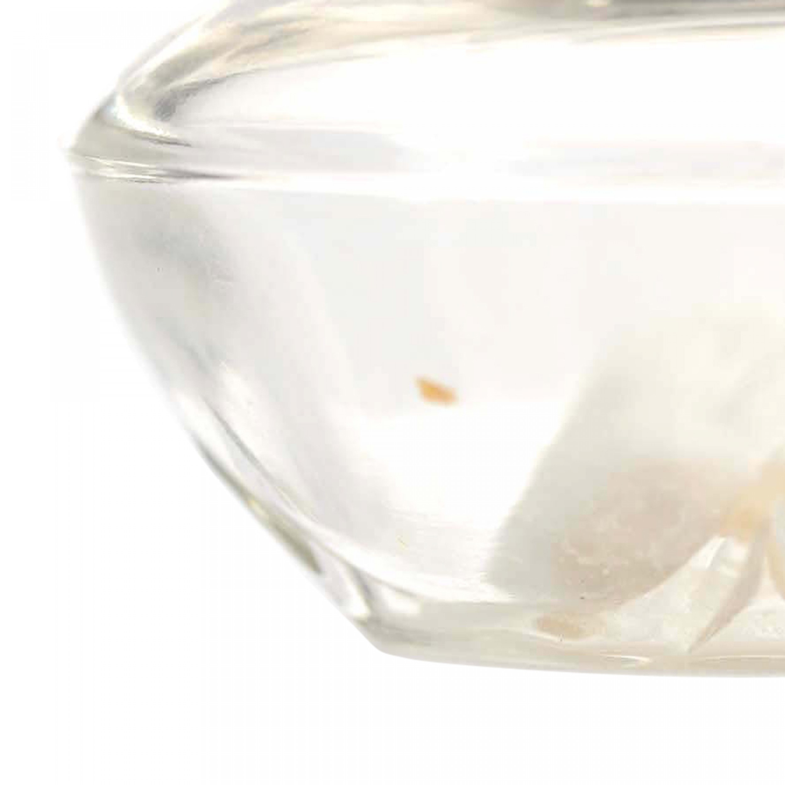 French Art Deco round squatty clear glass perfume bottle (NARCISSE NOIR by CARON) with a disc-shaped black plastic stopper with embossed flower (designed by JULIEN VIARD).