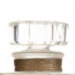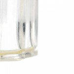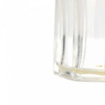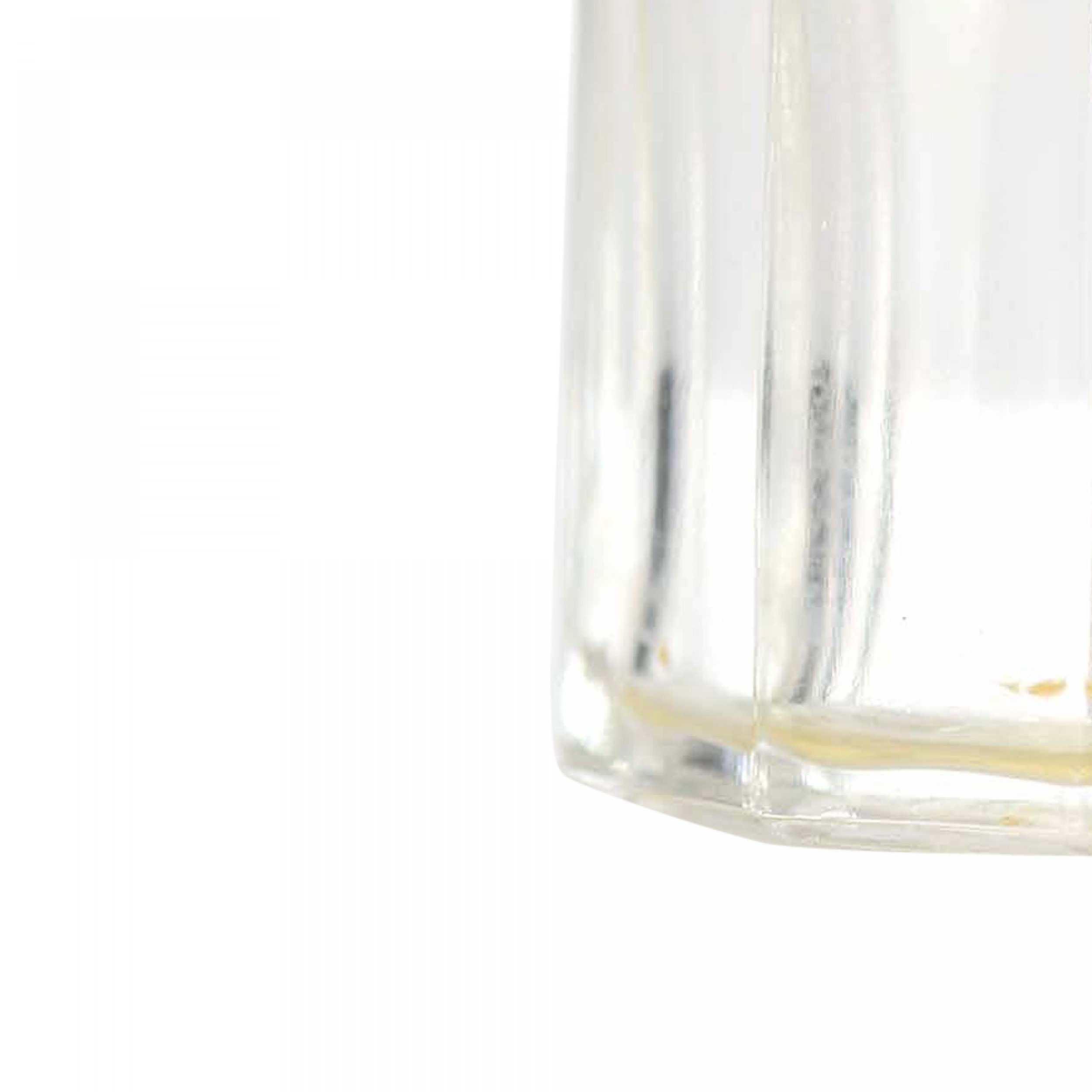 French Art Deco cylindrical clear glass perfume bottle (SORTILEGE by LE GALION) with vertical ribbing, a silver foil label and a matching stopper.
