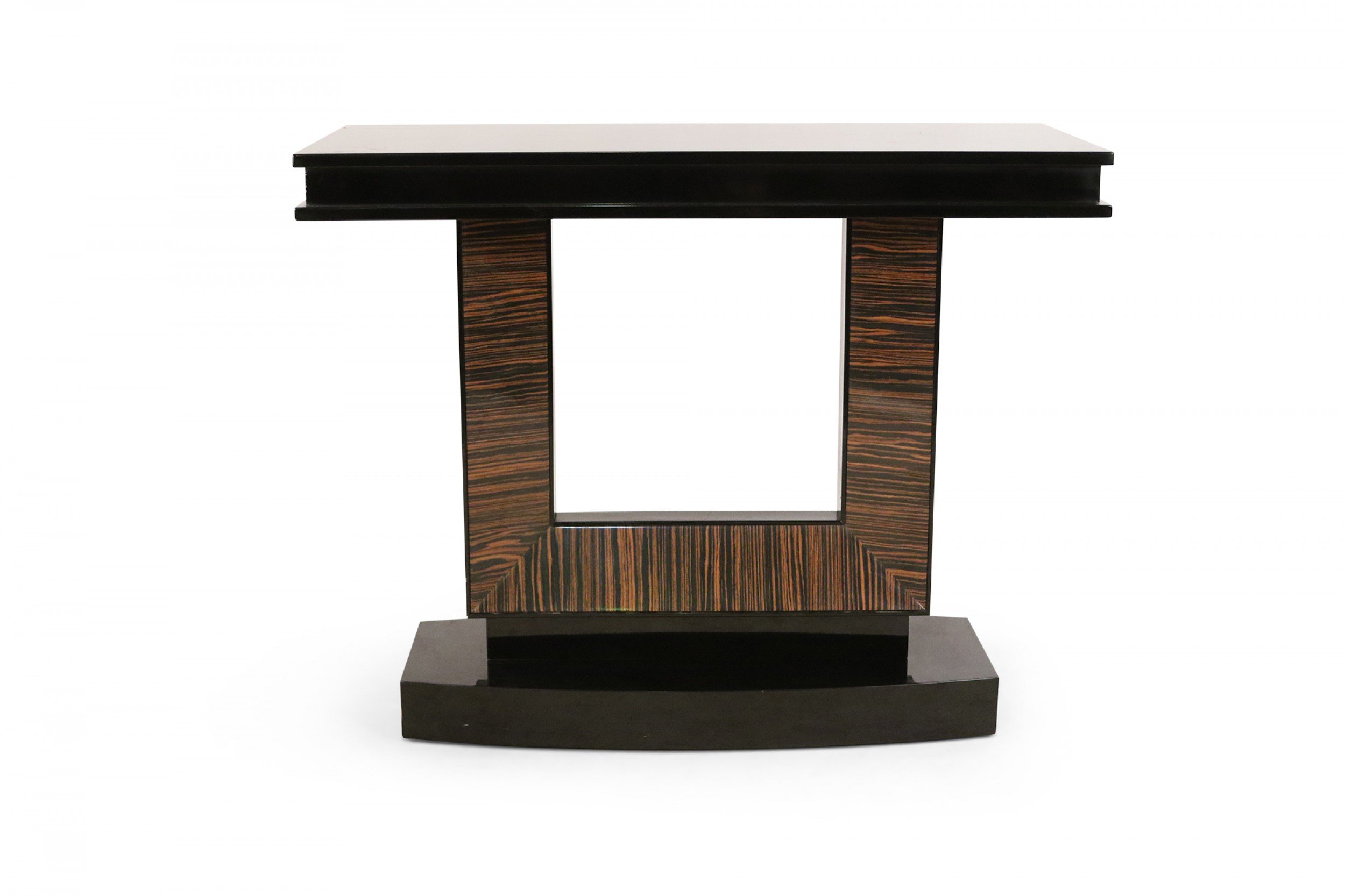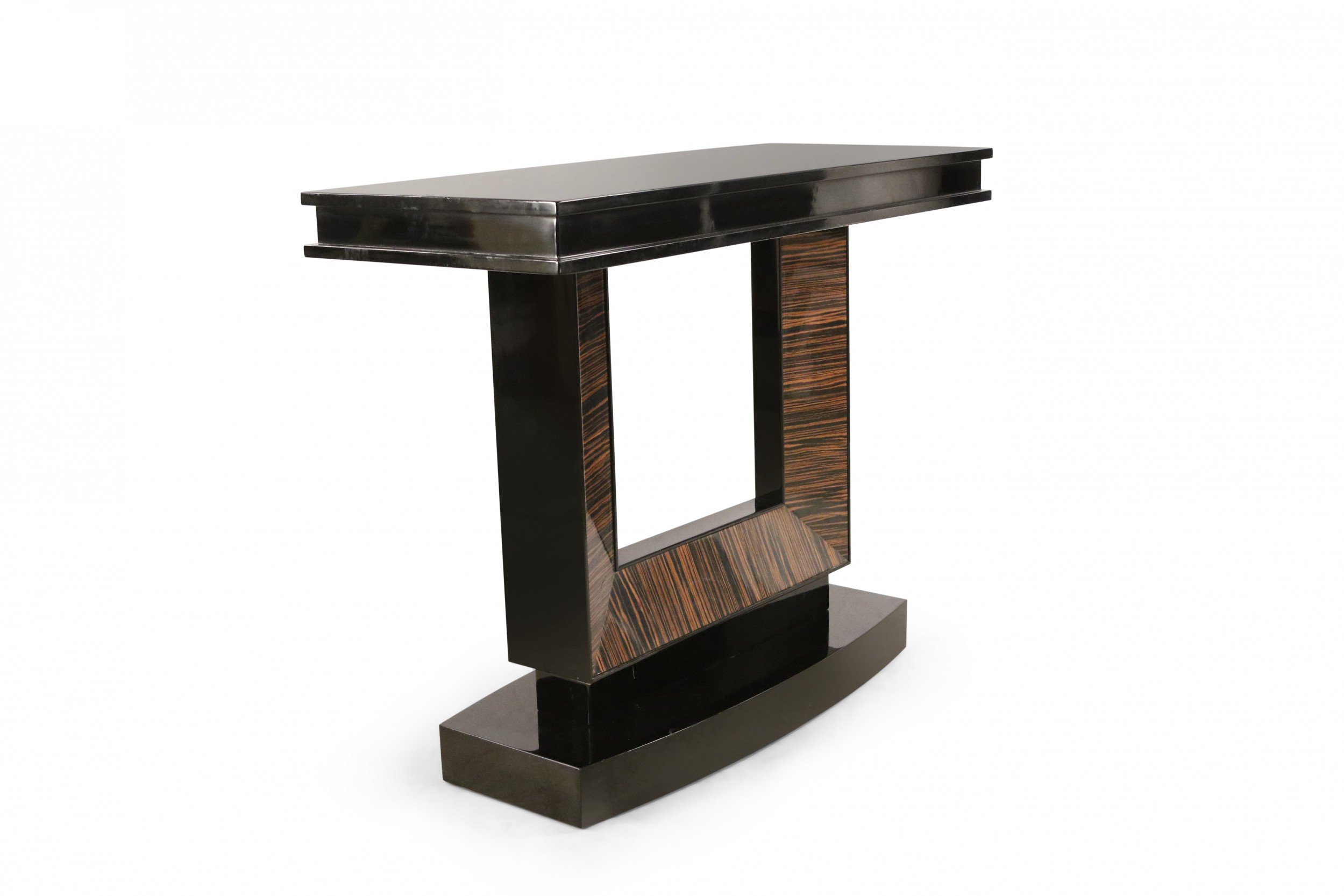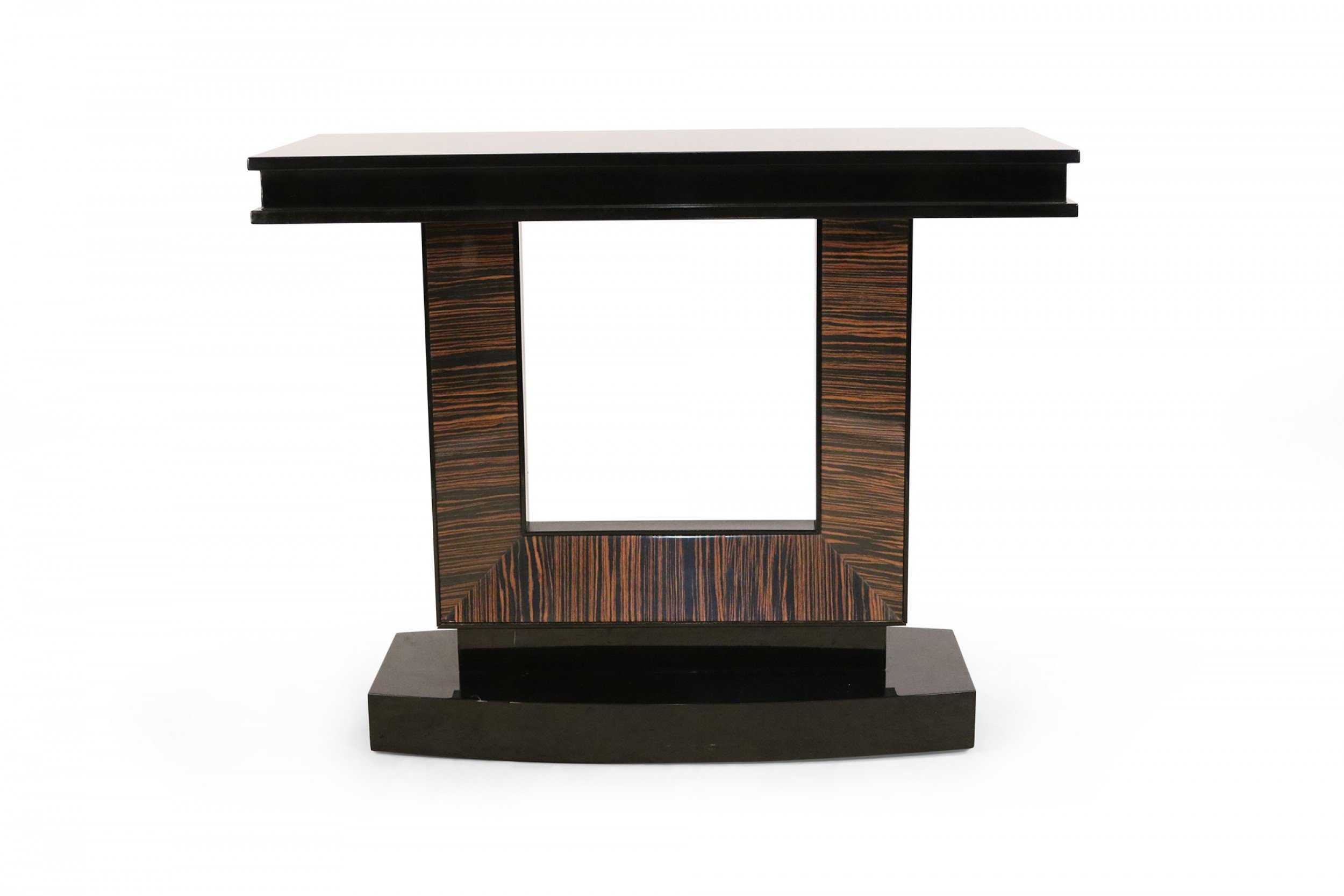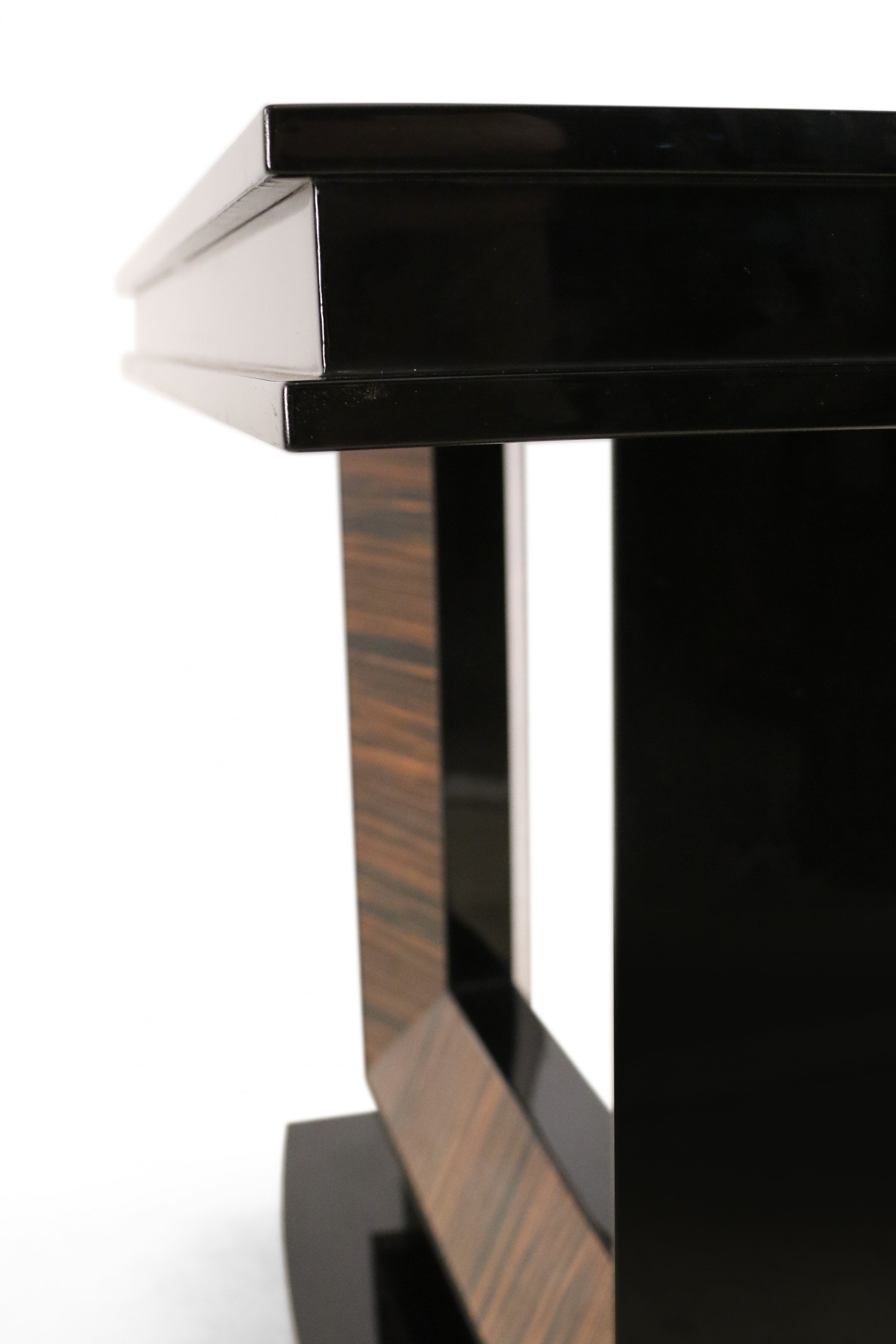 French Art Deco-style console table with a black lacquered rectangular base and top and a square cut-out support with palisander veneer.