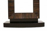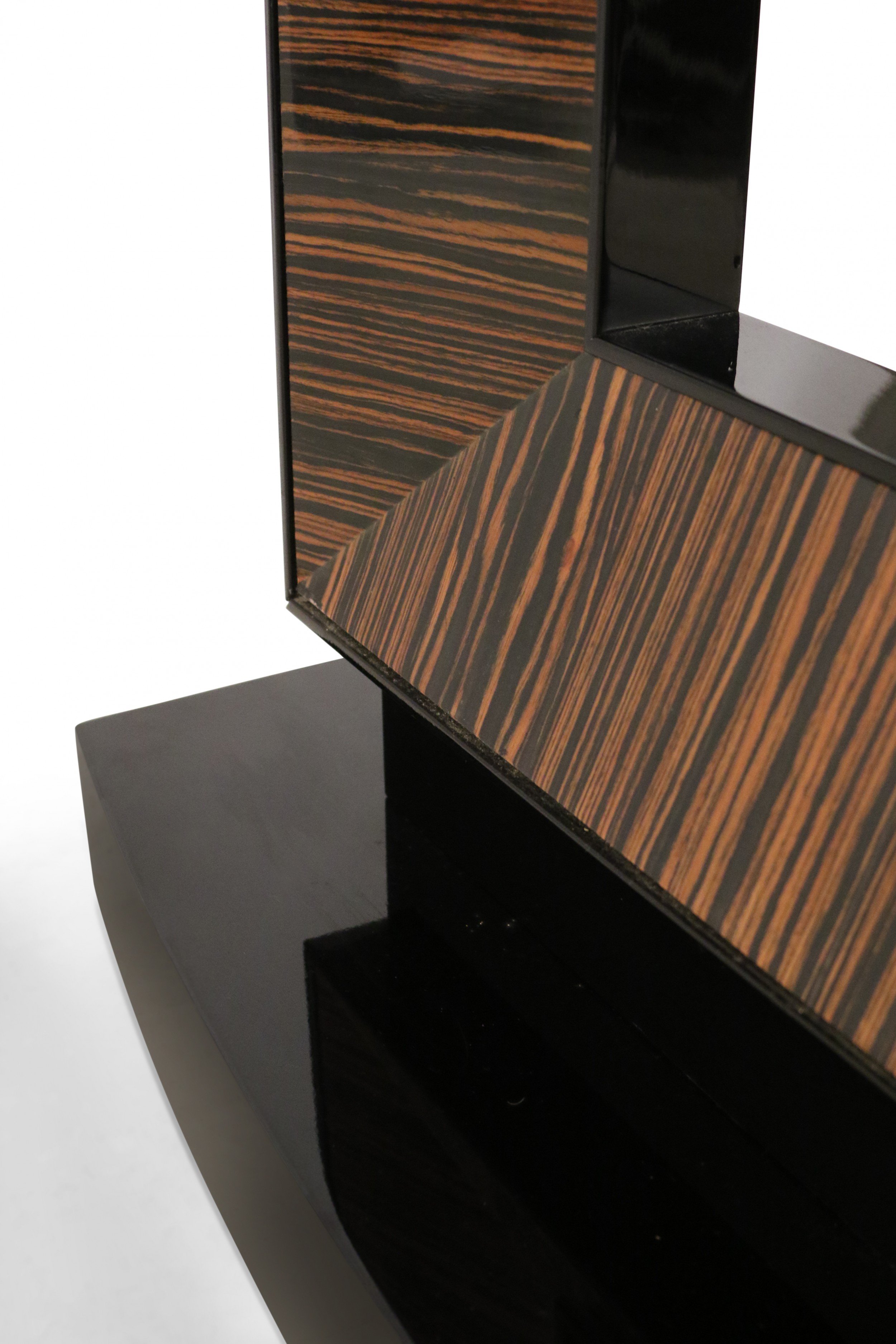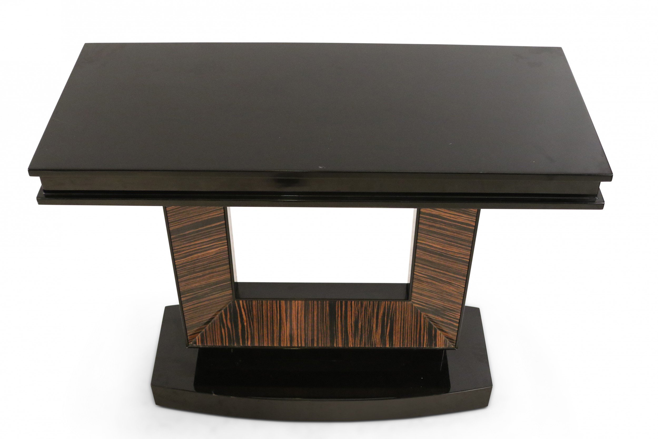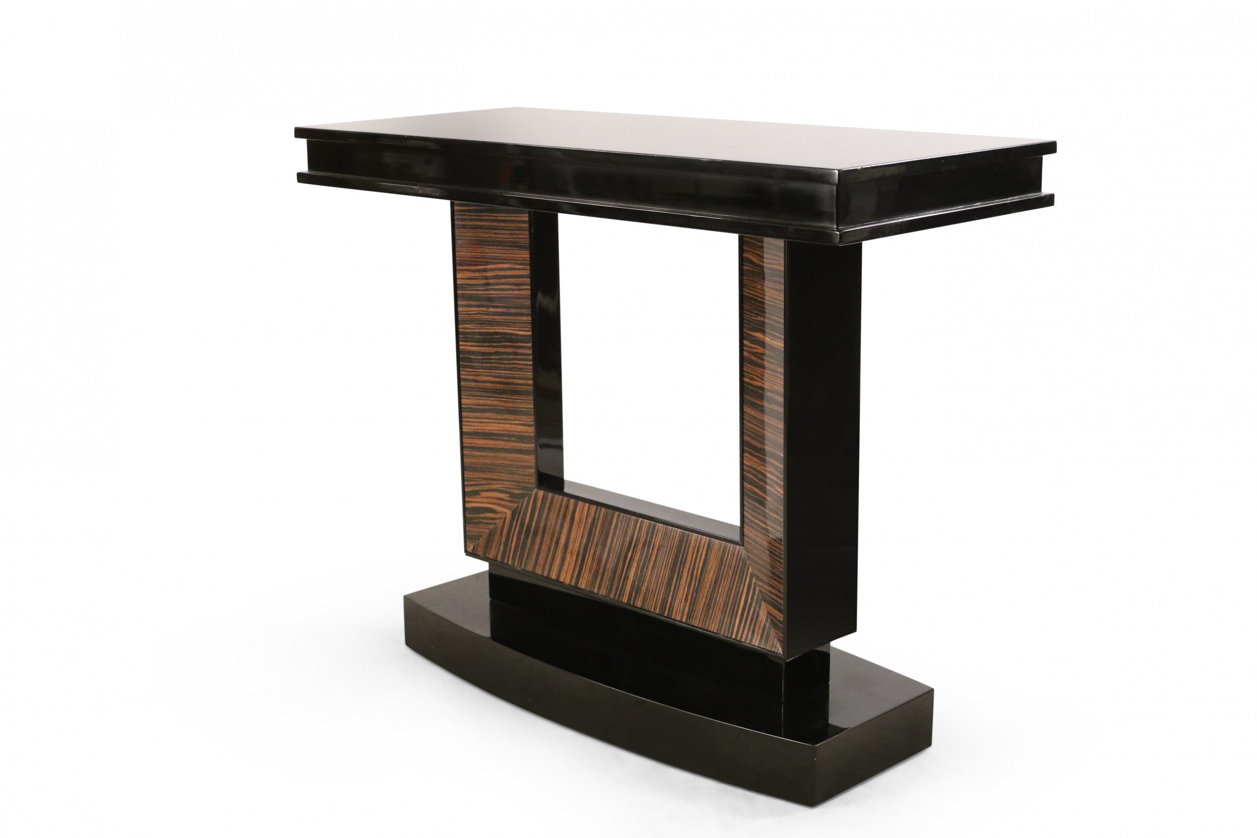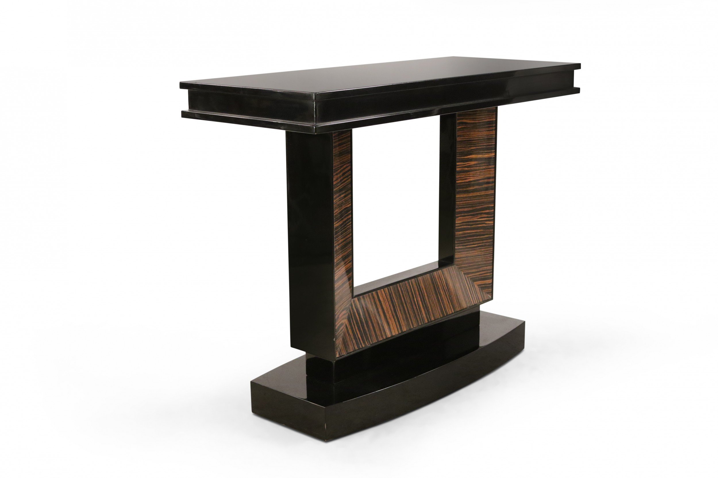 French Art Deco-style console table with a black lacquered rectangular base and top and a square cut-out support with palisander veneer.