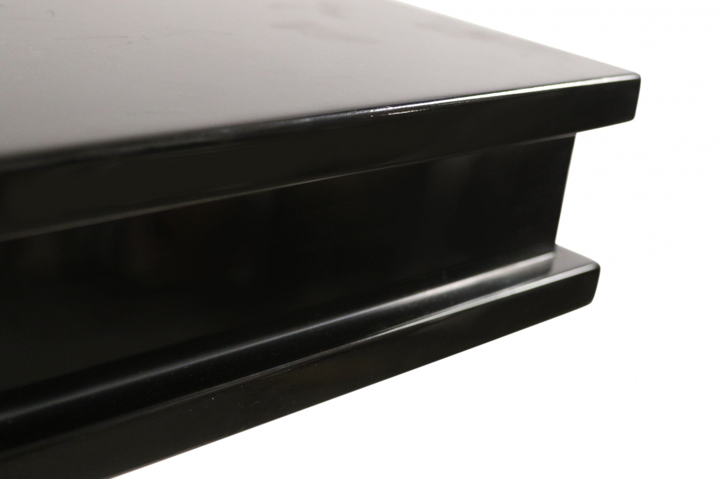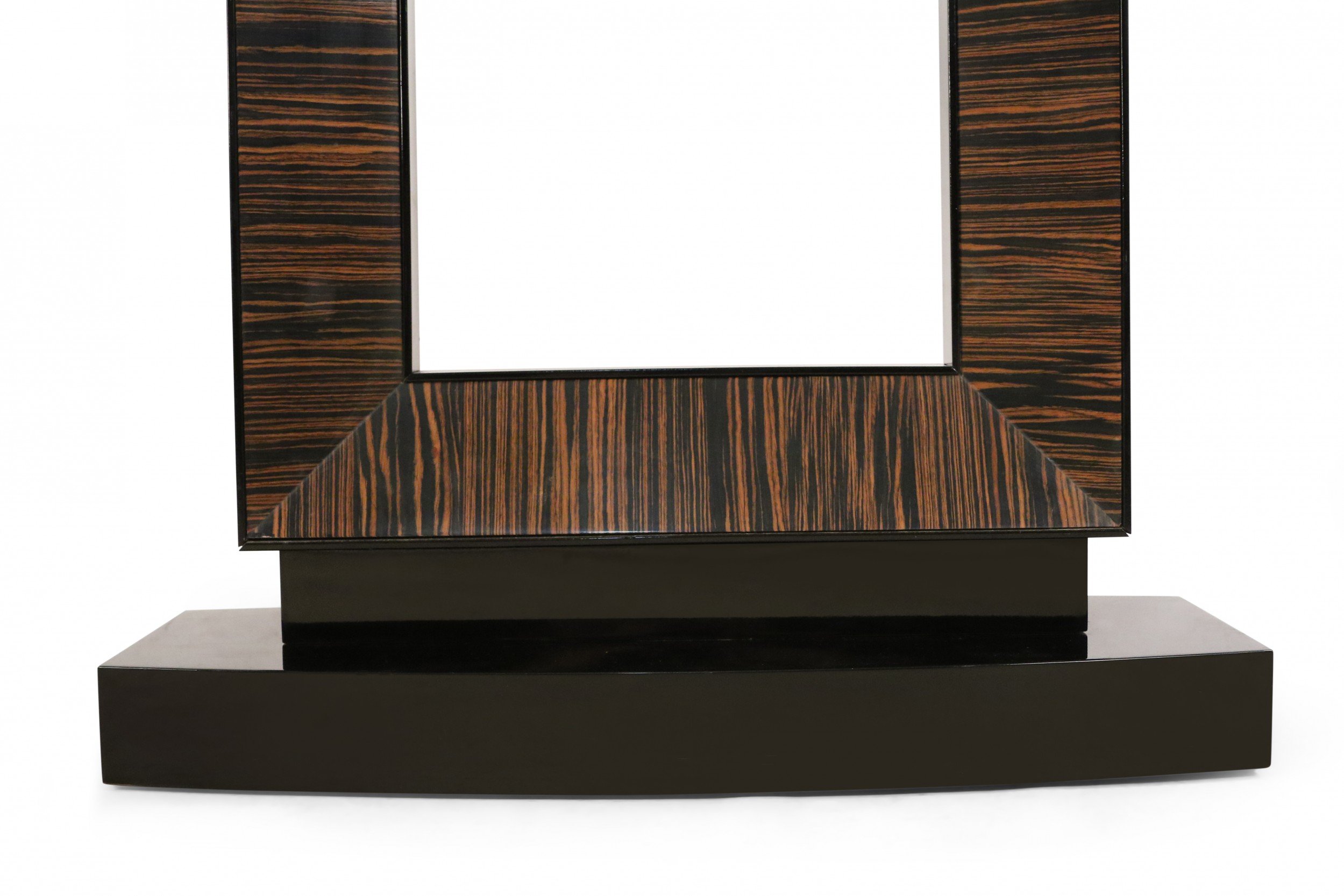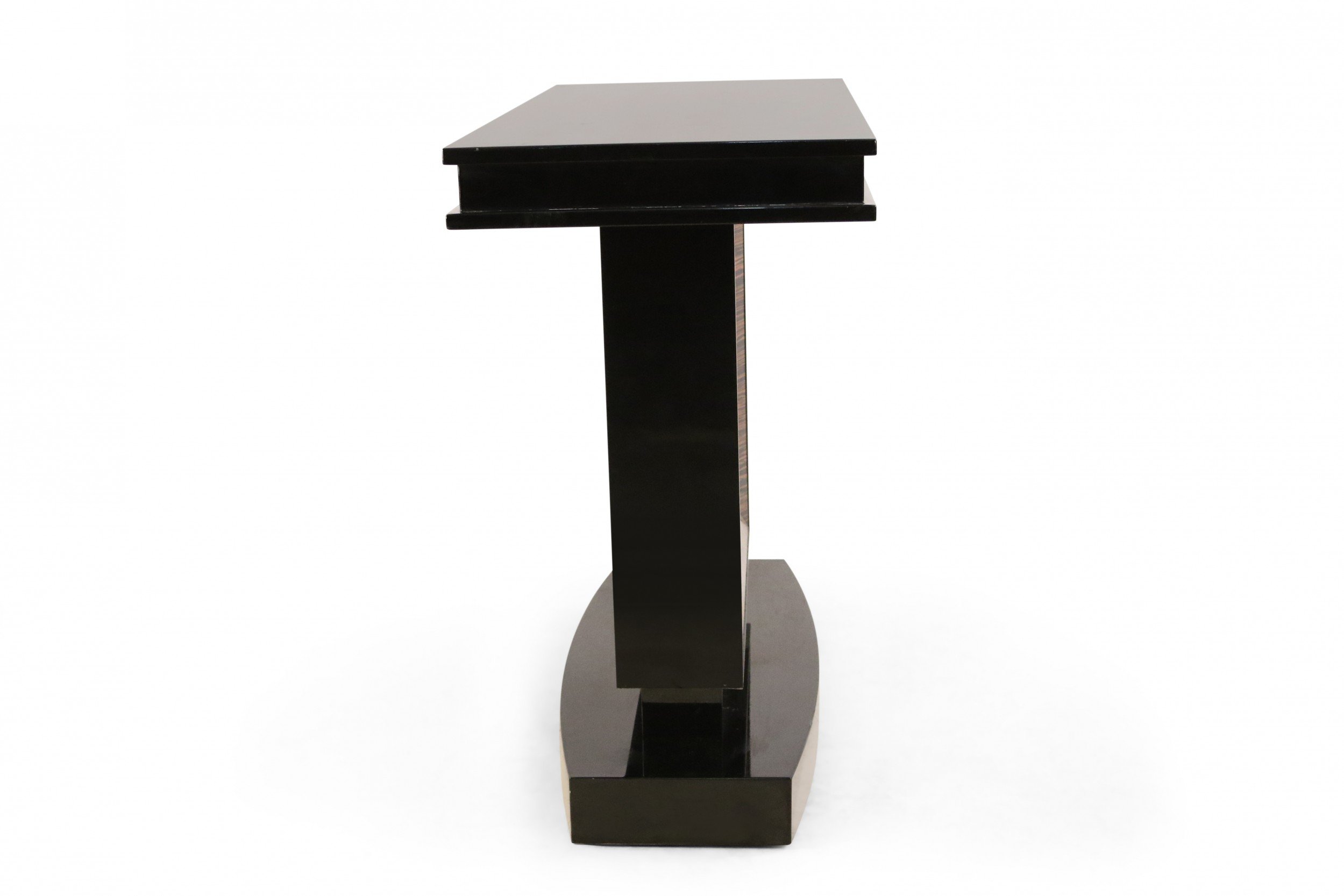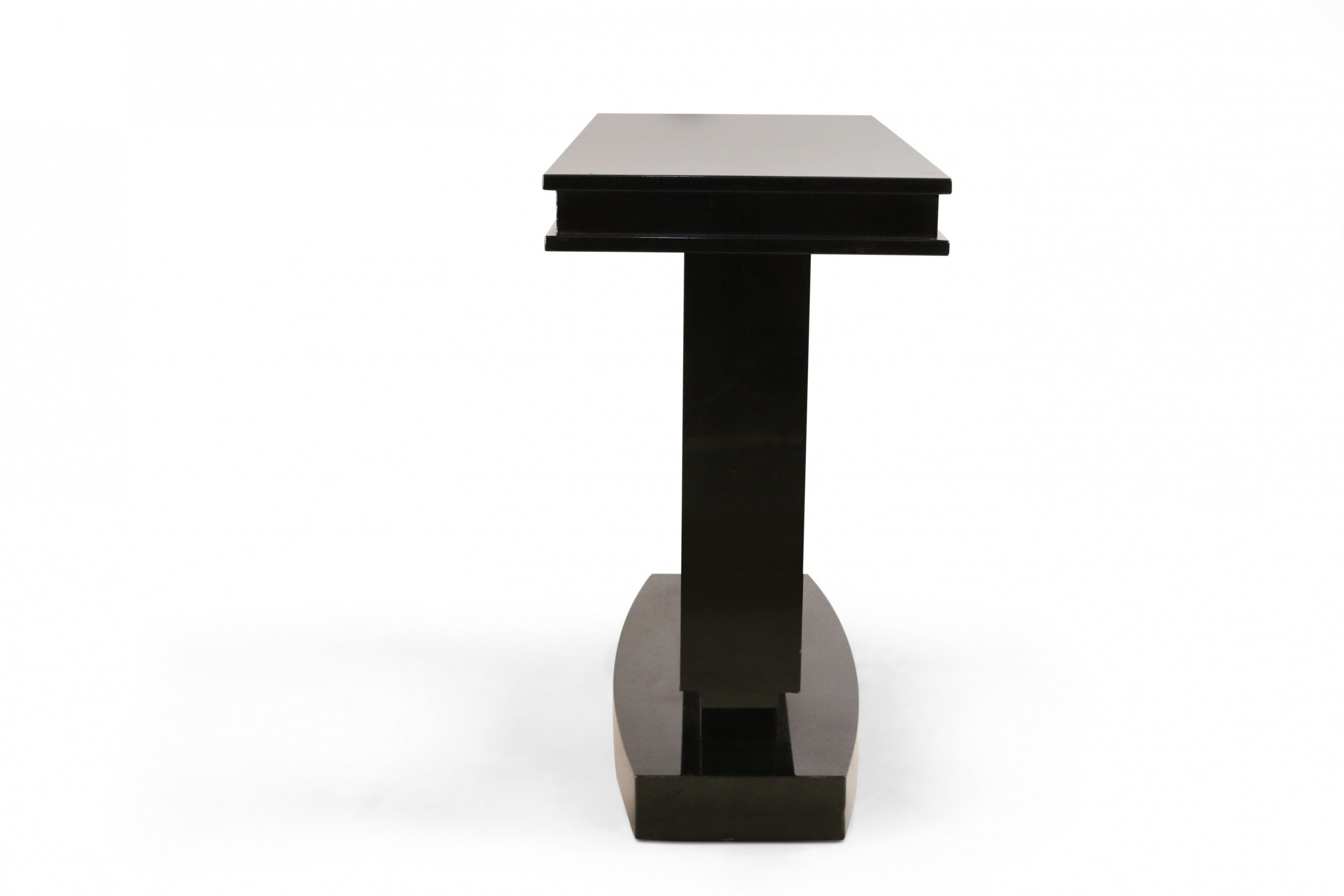 French Art Deco-style console table with a black lacquered rectangular base and top and a square cut-out support with palisander veneer..