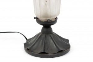 French Art Deco table lamp with frosted glass geometric design resting on a round iron base..