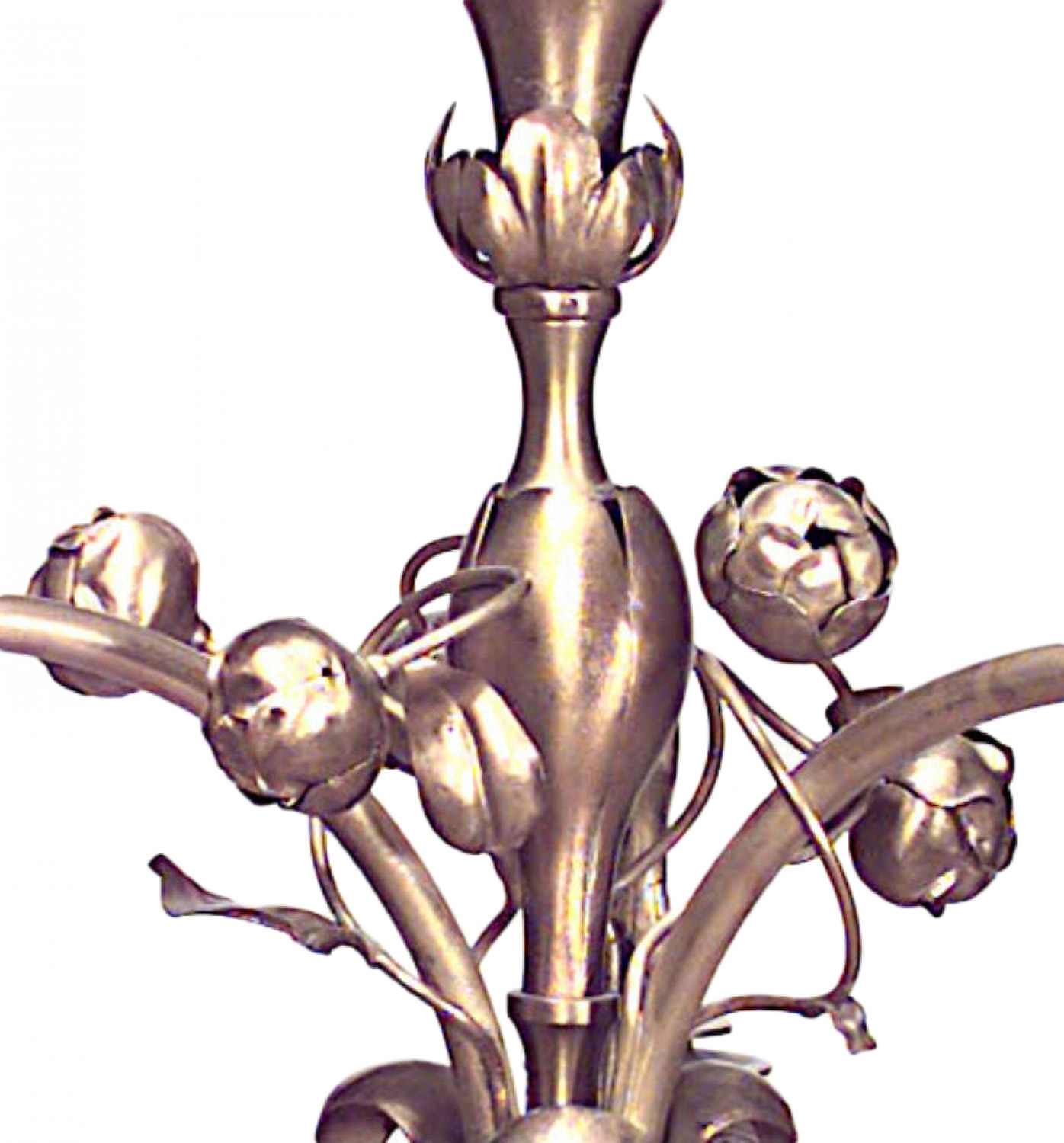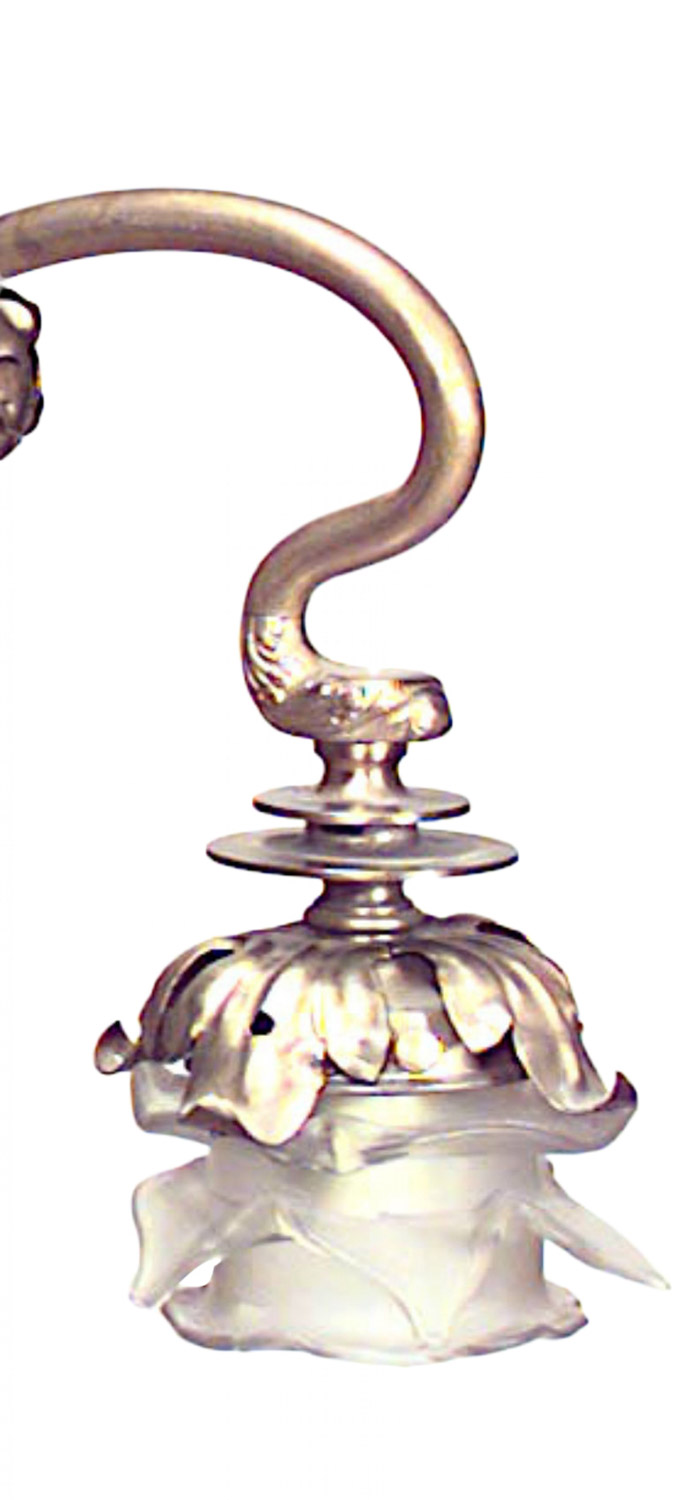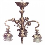 French Art Nouveau brass 3 arm chandelier with whiplash and floral design and glass shades..