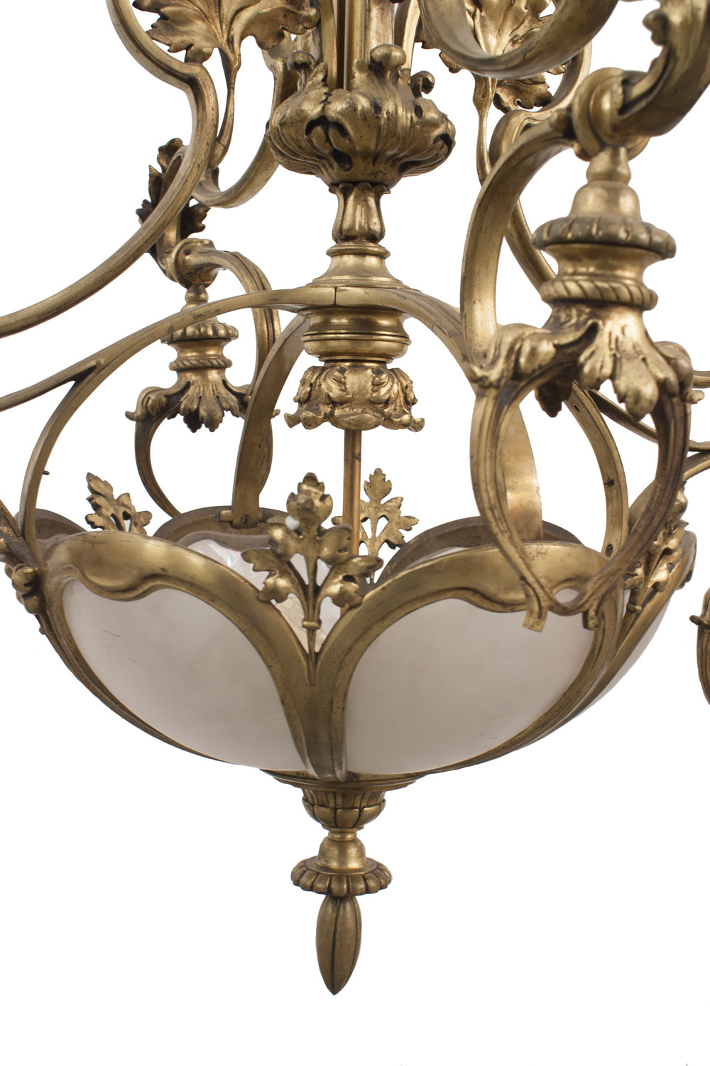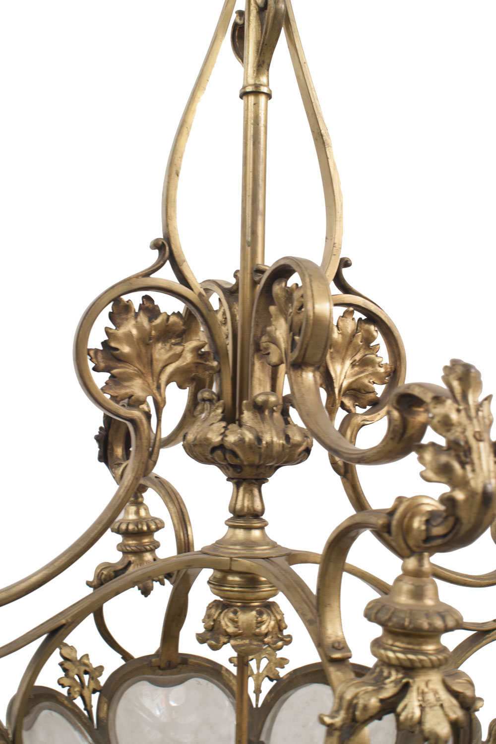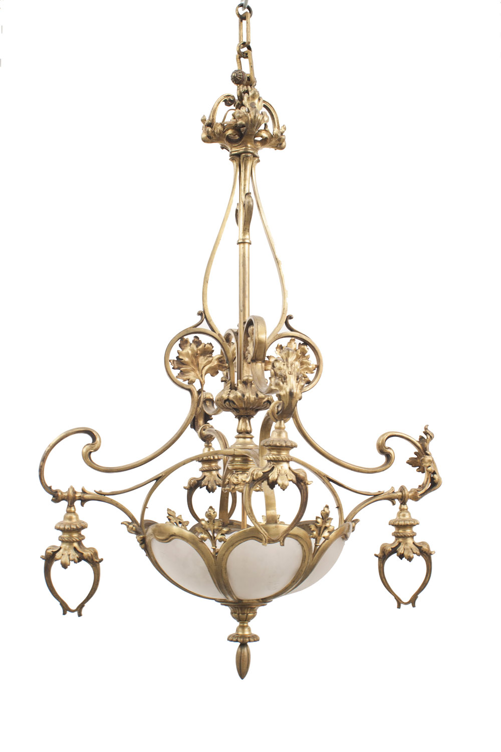 French Art Nouveau bronze dore 4 arm chandelier with 6 shaped frosted glass panels