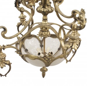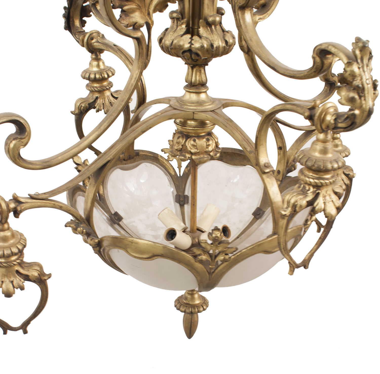 French Art Nouveau Bronze Dore and Glass Chandelier
