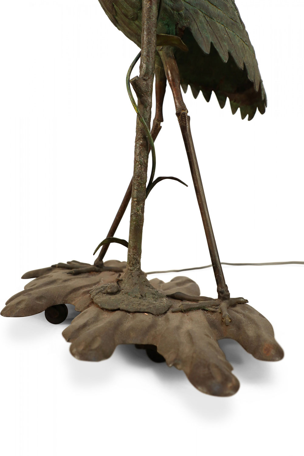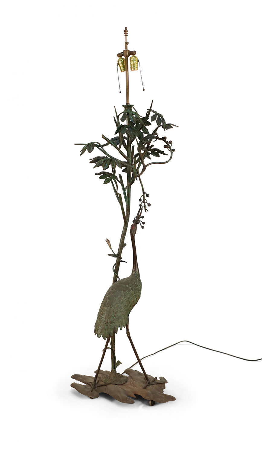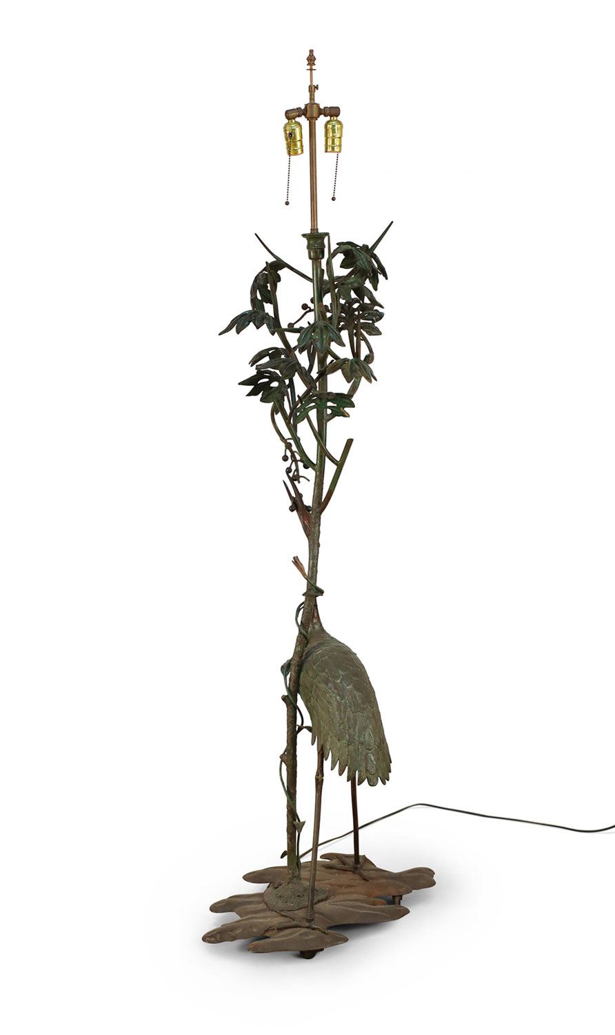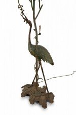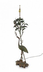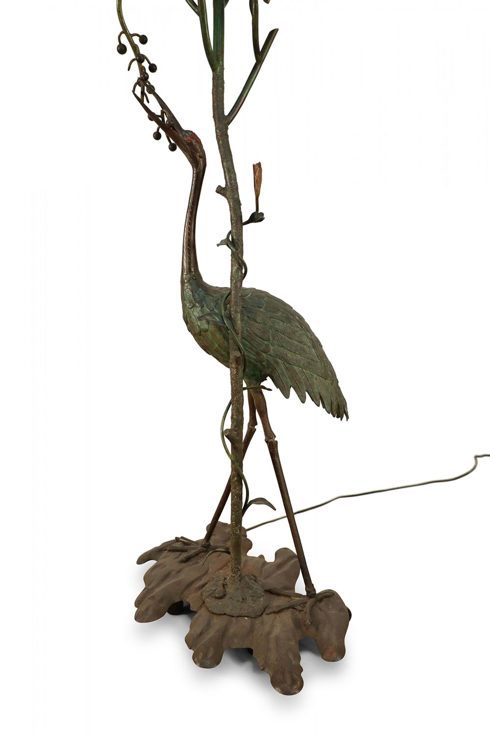 French Art Nouveau bronze floor lamp with heron eating berries from tree on a shaped base..