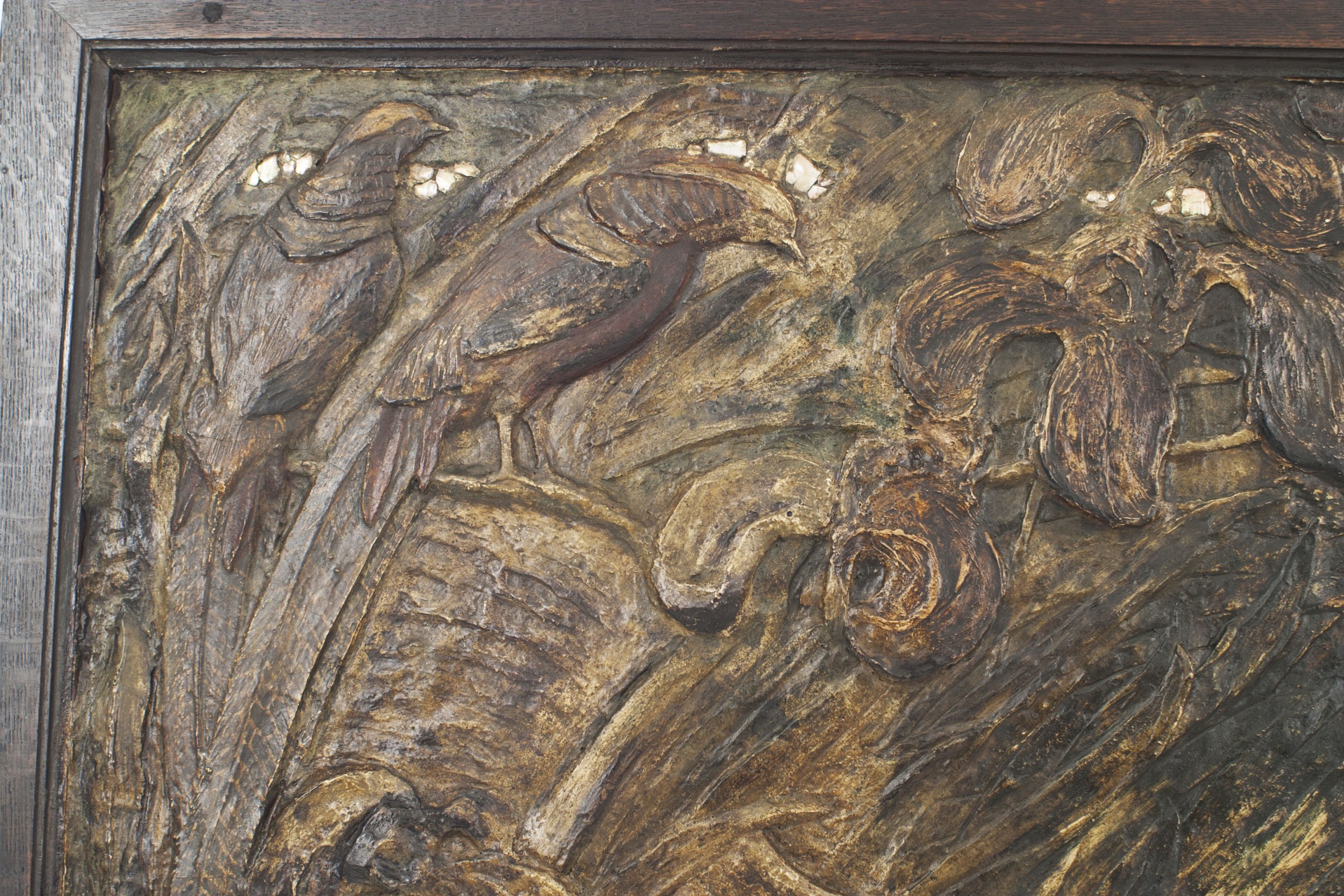 French Art Nouveau dark polychromed plaster horizontal wall plaque with a carved relief of a woman inlaid with mother-of-pearl and glass cabochons in an oak frame (signed: SF)