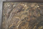 French Art Nouveau dark polychromed plaster horizontal wall plaque with a carved relief of a woman inlaid with mother-of-pearl and glass cabochons in an oak frame (signed: SF).