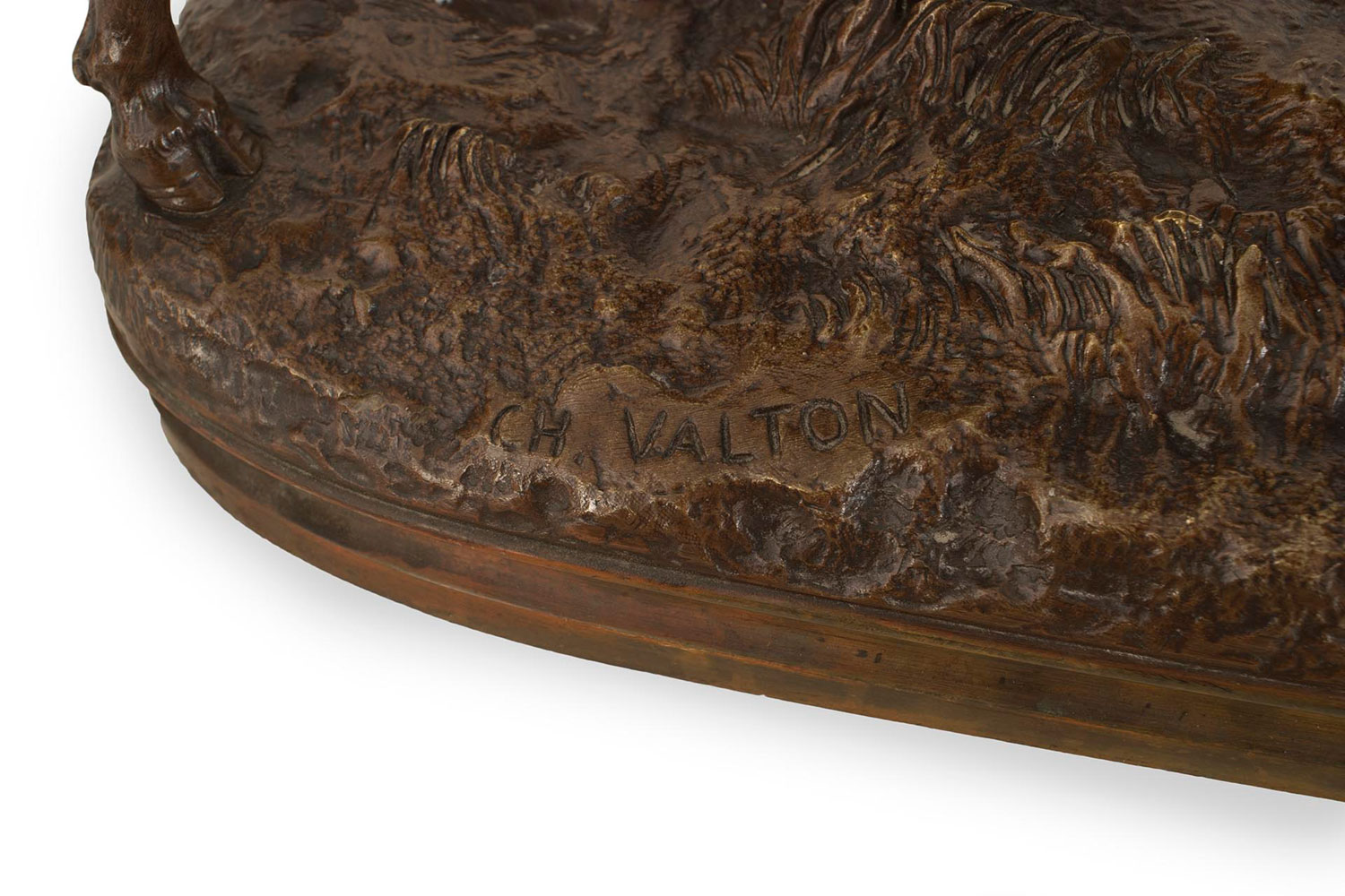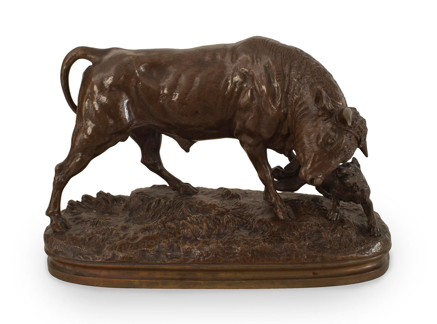 French bronze figure of bull with attacking dog on an oval base (Valton) (19/20th Cent.).