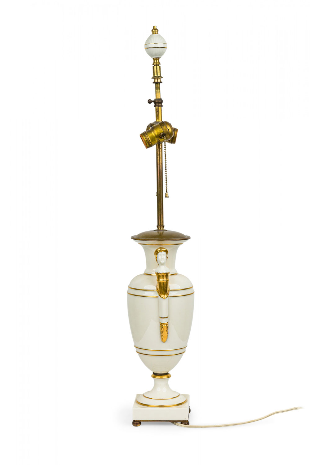 French Charles X style ( Mid-Century) table lamp with a white ceramic urn form body with gilt trim and figural handles, mounted on a square base with brass hardware.