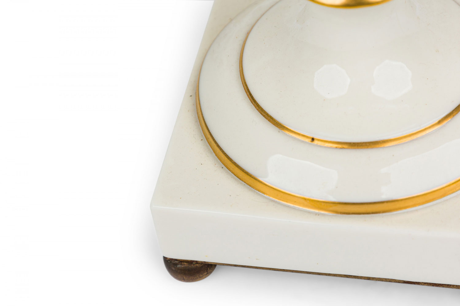 French Charles X style ( Mid-Century) table lamp with a white ceramic urn form body with gilt trim and figural handles, mounted on a square base with brass hardware..