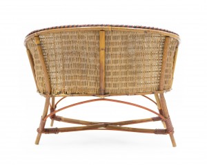 French (1930's) miniature salesman's sample model of natural wicker 4 piece salon set with orange and black trim. (Settee: 15.5" x 10" x 11.5") (Lg chair: 9.75" x 8.5" x 12") (Sm chair: 7.5" x 7" x 13") (Table: 14" x 9.25" x 11.25").