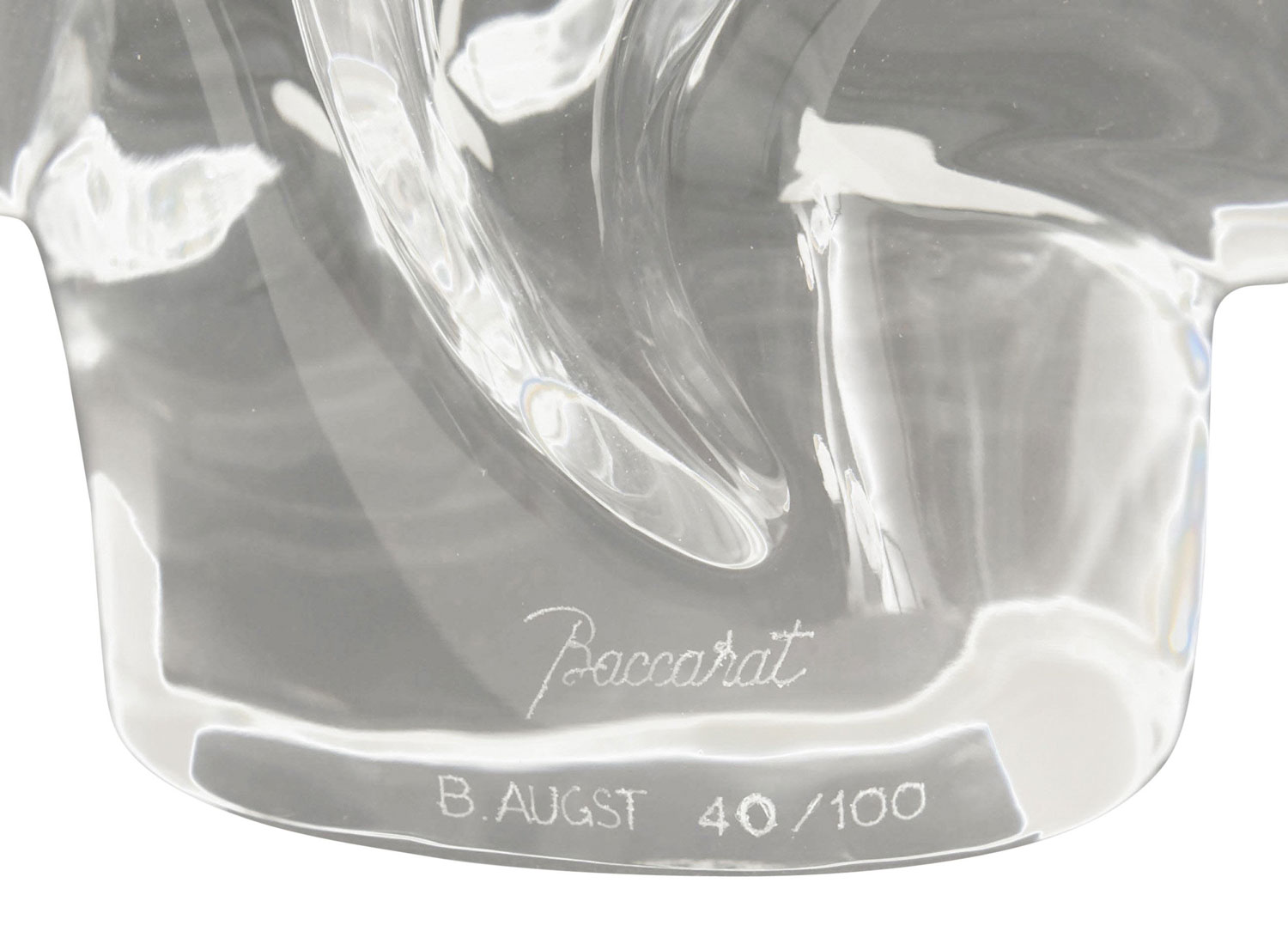French Mid-Century (1980/90s) limited edition (40/100) of a crystal sculpture of a small peacock figure with spread feathers (signed BACCARAT, designed by B AUGST)