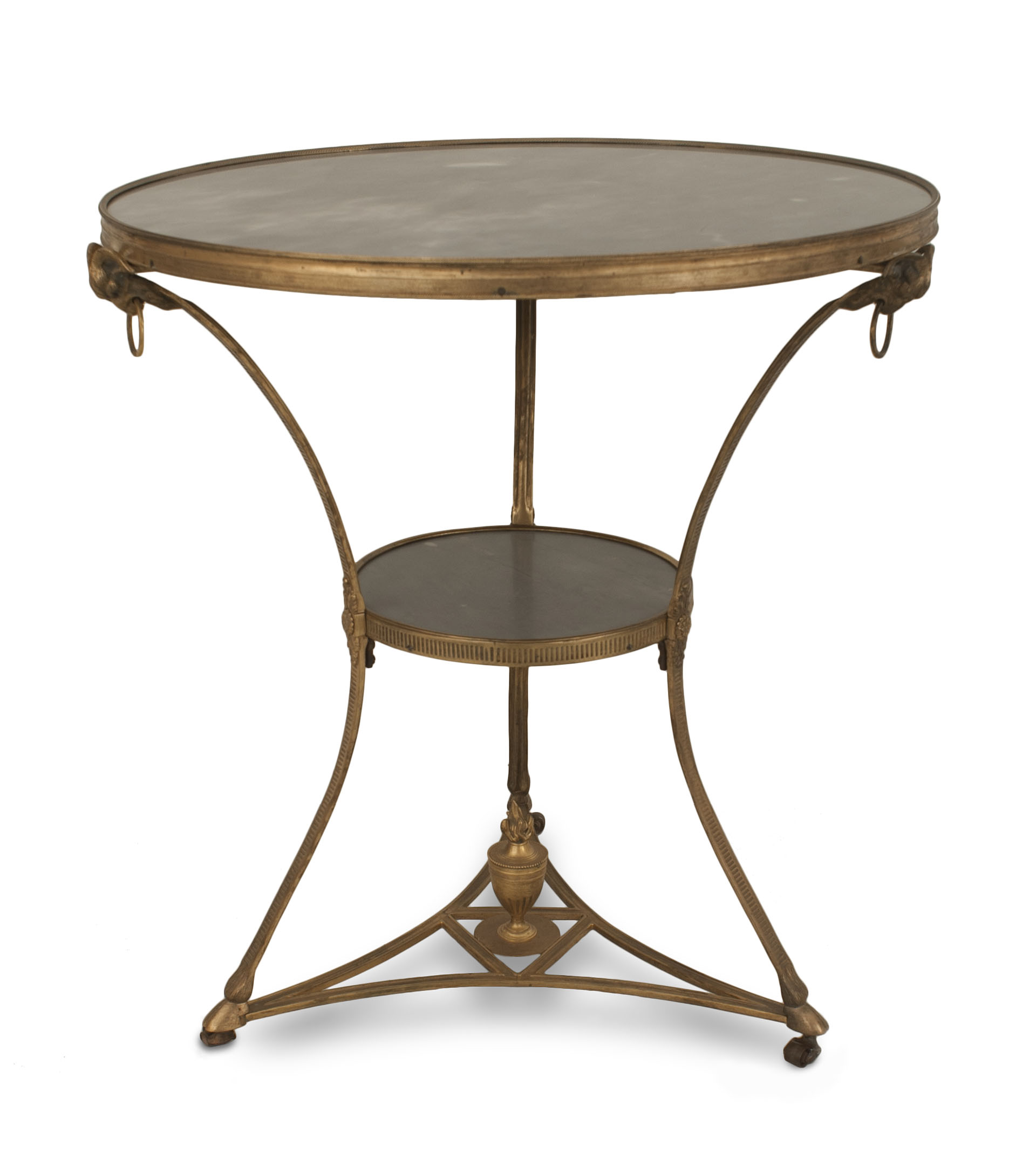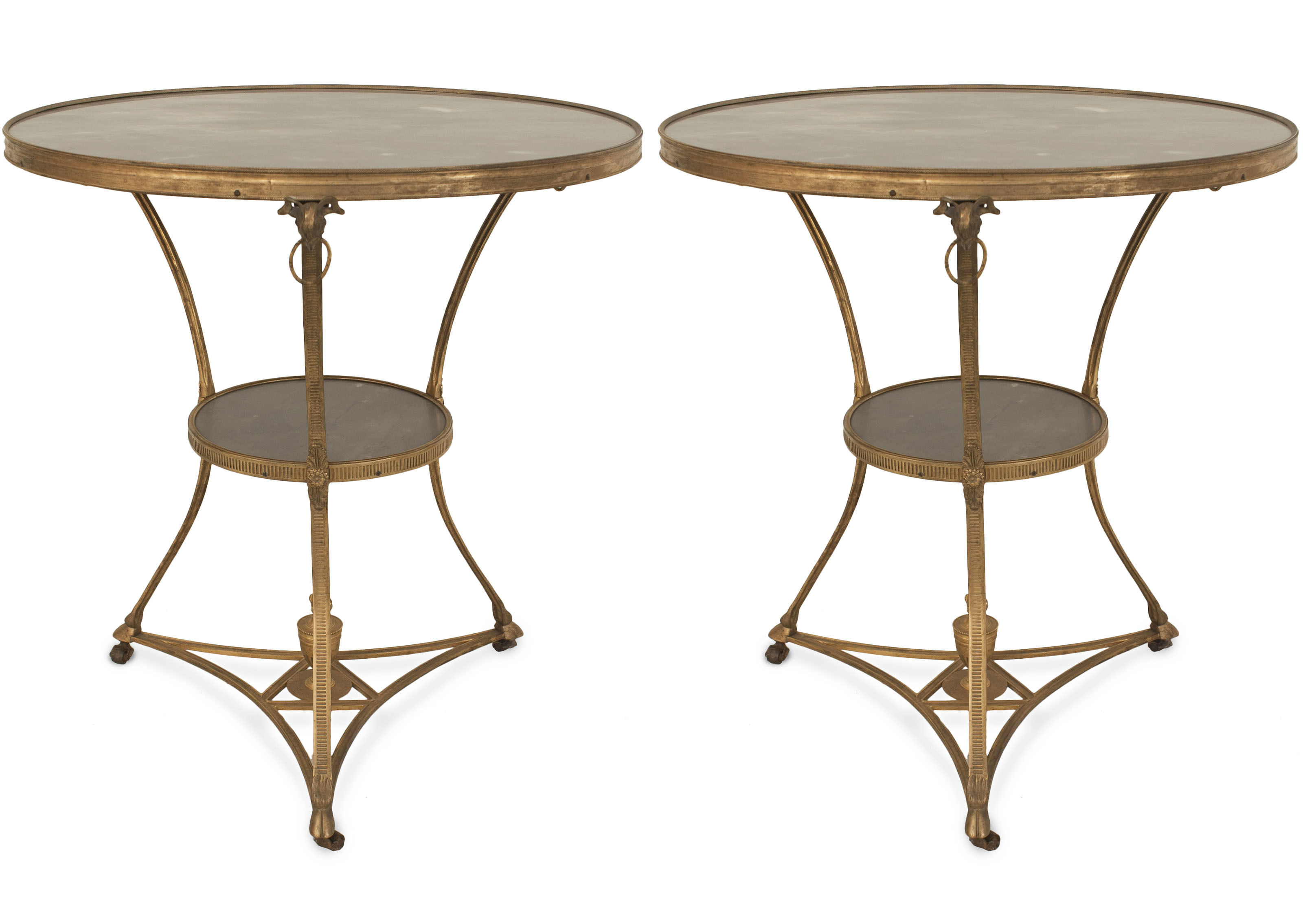 PAIR of French Charles X-style (20th Century) gilt bronze round end tables with ram head design and inset grey marble top and shelf with a bottom stretcher with an urn finial. (PRICED AS PAIR).