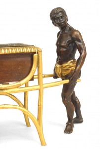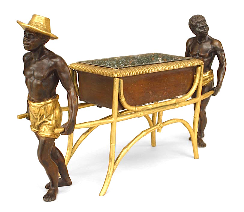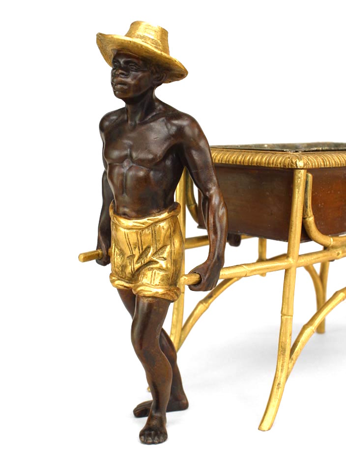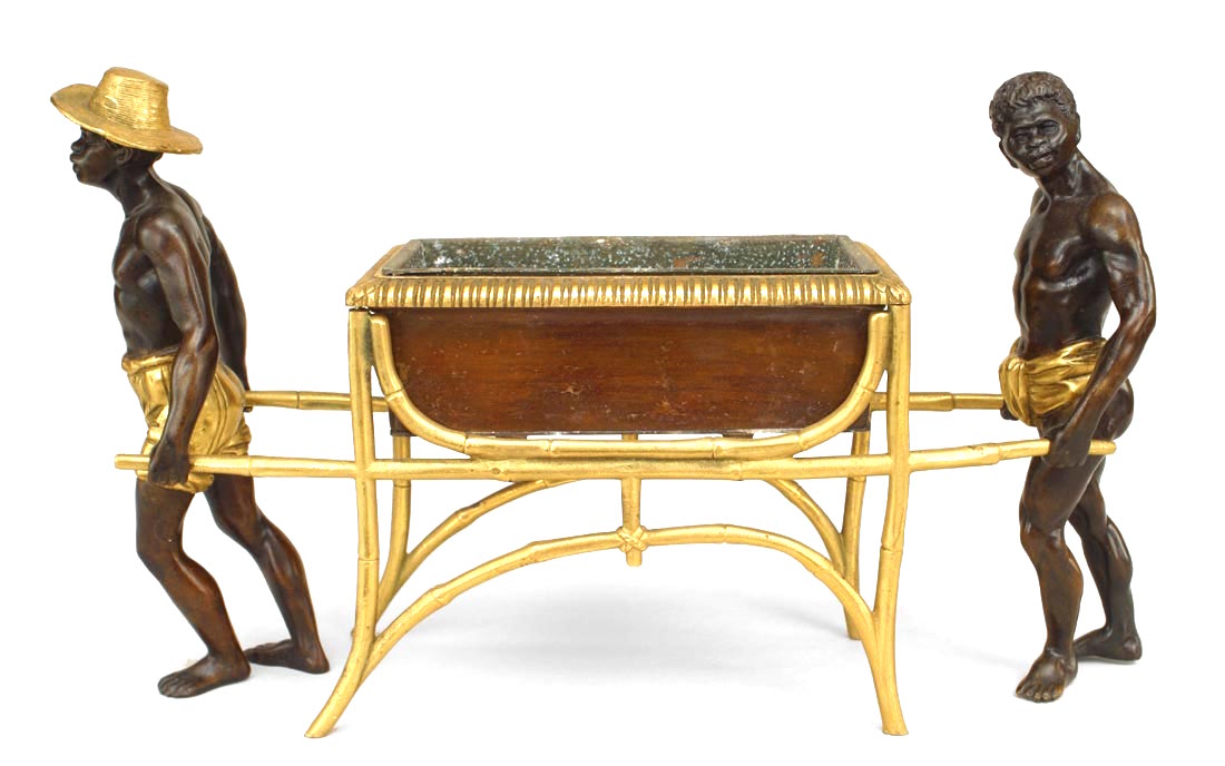 French Directoire-style (20th Century) bronze and gilt trimmed centerpiece with 2 Nubians holding container.