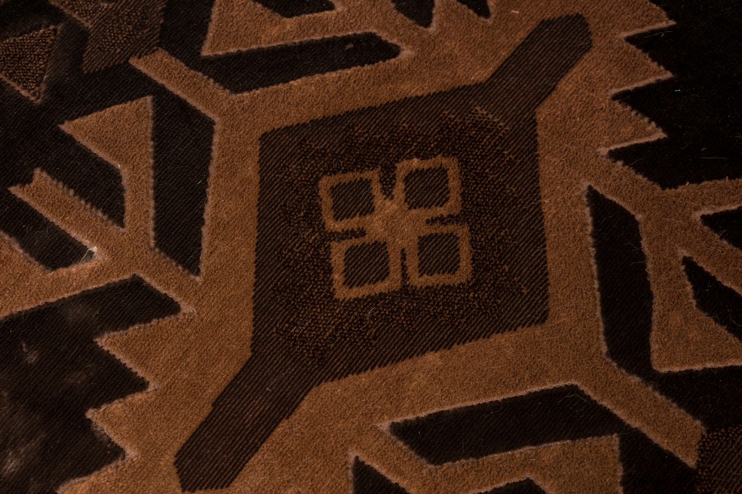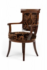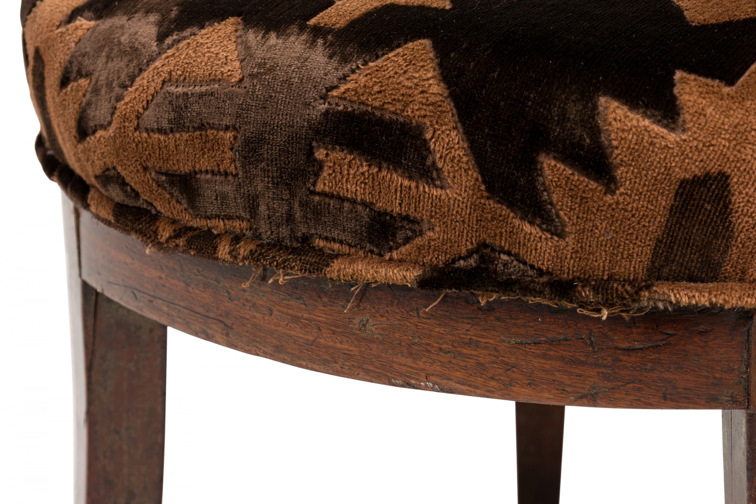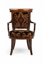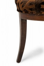French Directoire Walnut and Brown and Black Geometric Upholstered Sabre Leg Armchair