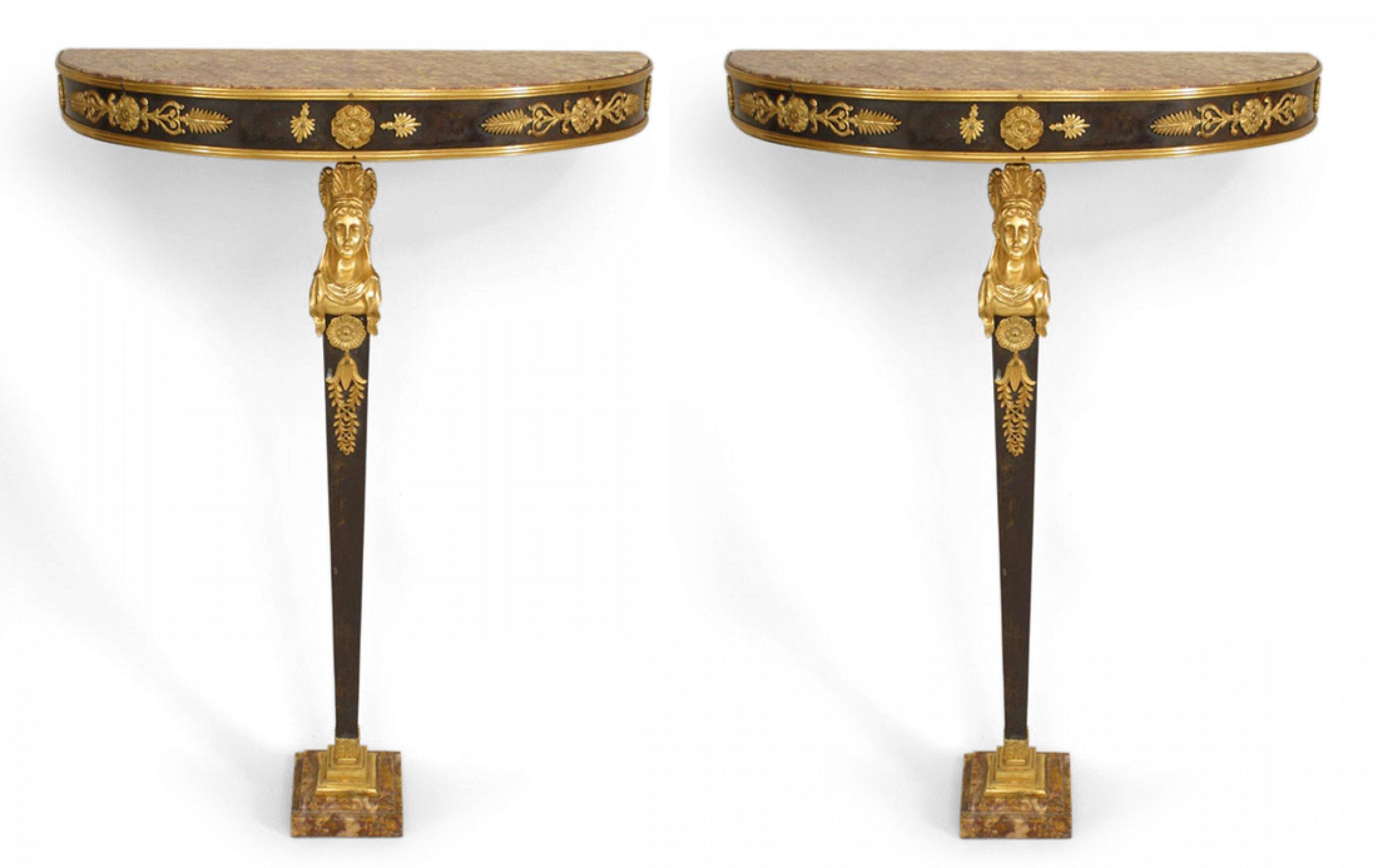 Pair of French Empire Bronze Dore and Marble Console Tables