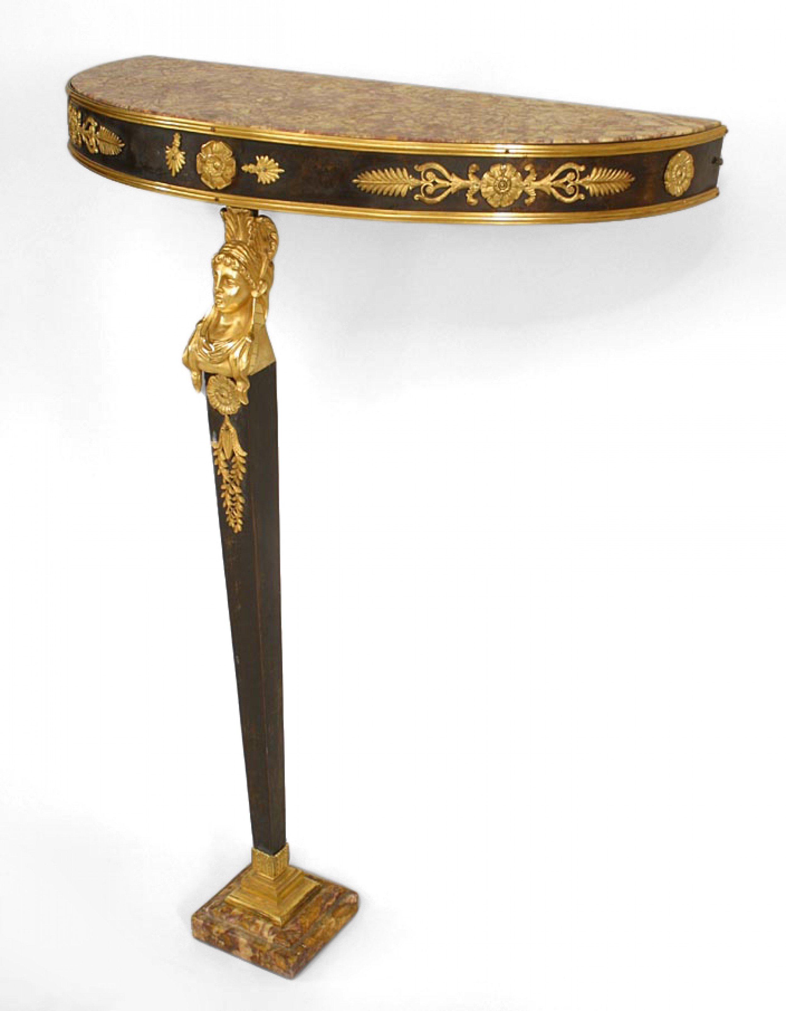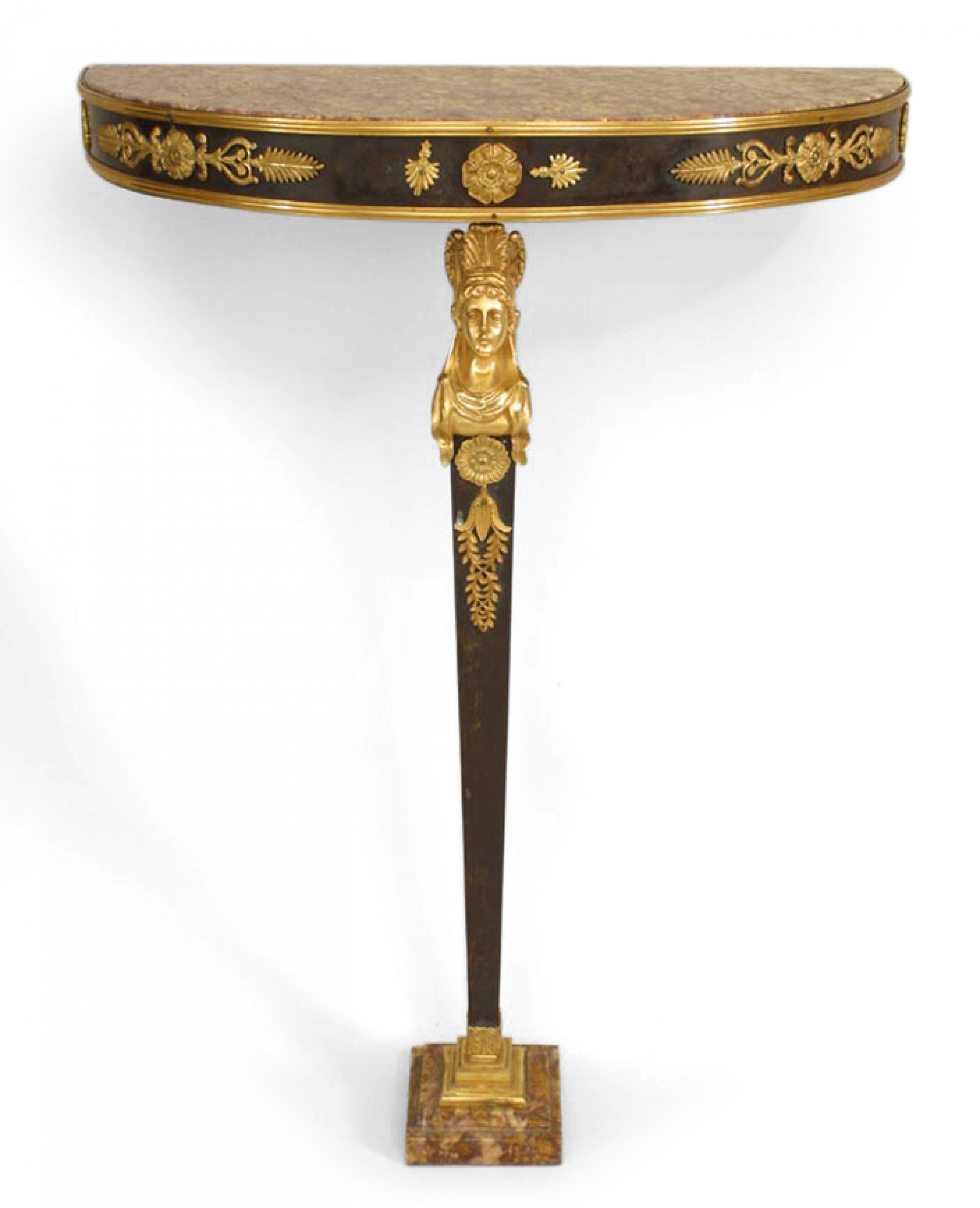 PAIR of French Empire-style (19th Century) bronze and dore trim bracket console tables with half round marble top supported on a single leg ending in a square marble base. (PRICED AS PAIR).